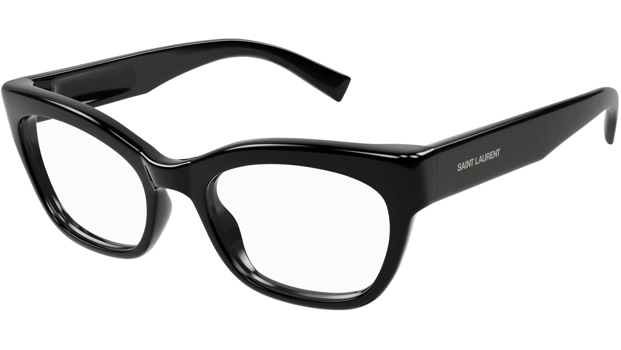 Occhiali da vista Saint Laurent modello SL 643 linea Classic codice colore 001 nero lucido tinta unita in acetato riciclato forma cat eye con aste color nero.