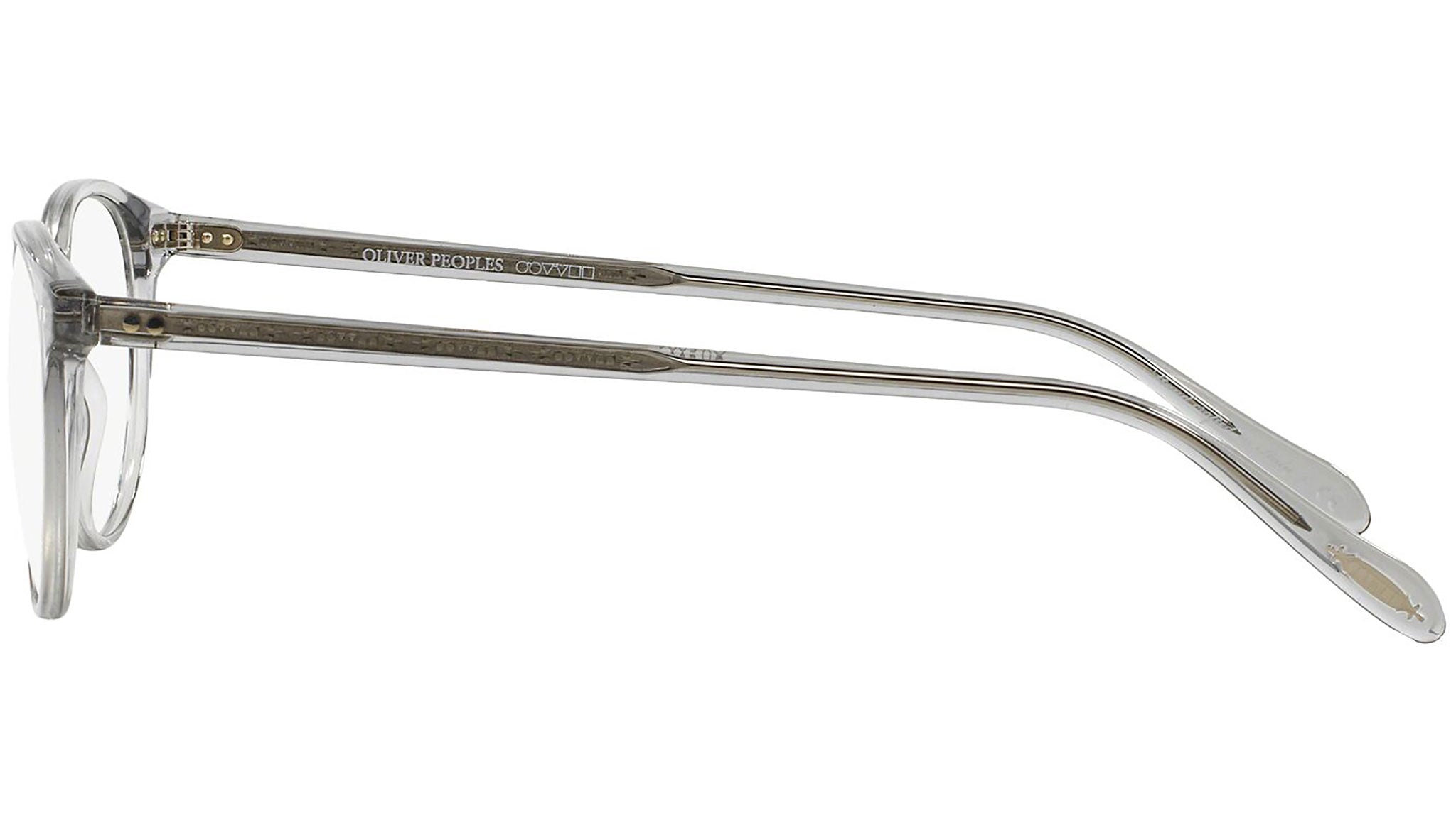 The best-selling Riley is handcrafted from lightweight plastic and features rounded profiles, signature pivots, and a retro keyhole bridge. The metal core visible inside the temple is embossed with Oliver Peoples logo details, while the temple tip is stamped with the Oliver Peoples plaque.