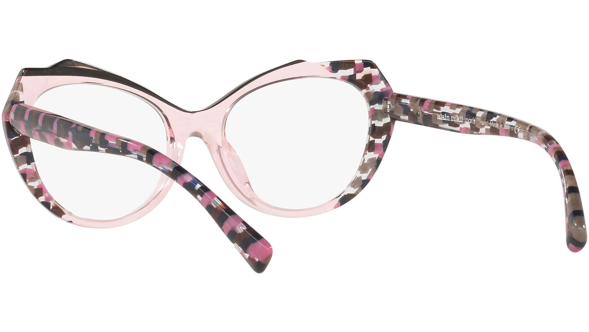 Alain Mikli eyeglasses model A03136 color code 005, color variant translucent pink black and checkerboard. Alain Mikli was the first brand to support the idea of glasses as an accessory. From the fusion of art and fashion are born frames that have always been synonymous with uniqueness and provocation, characterized by original design and exclusive color combinations.