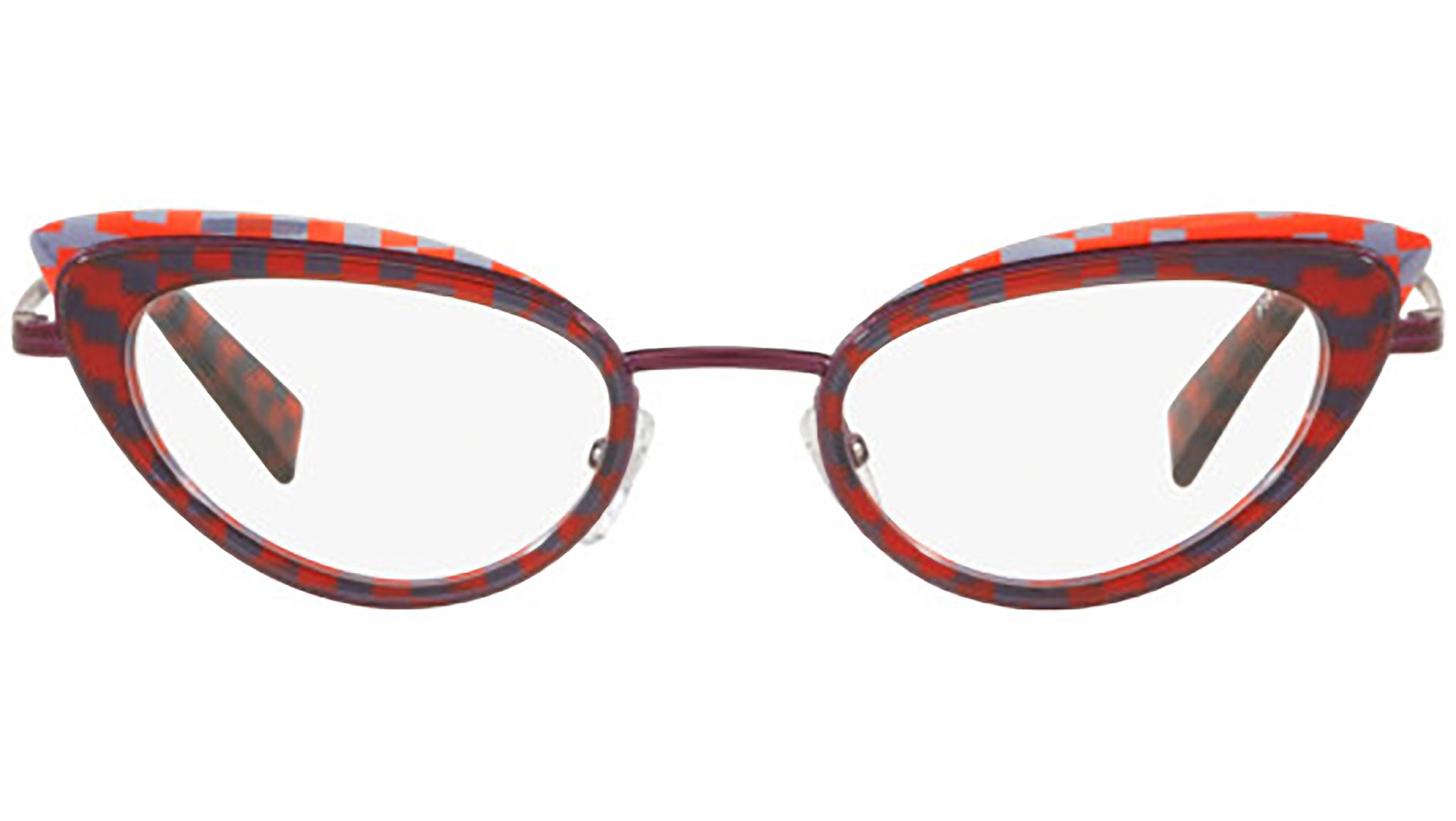 Alain Mikli eyeglasses model 0A02029 color variant red and purple damier purple, color code 005. Alain Mikli was the first brand to support the idea of glasses as an accessory. From the fusion of art and fashion are born frames that have always been synonymous with uniqueness and provocation, characterized by original design and exclusive color combinations.