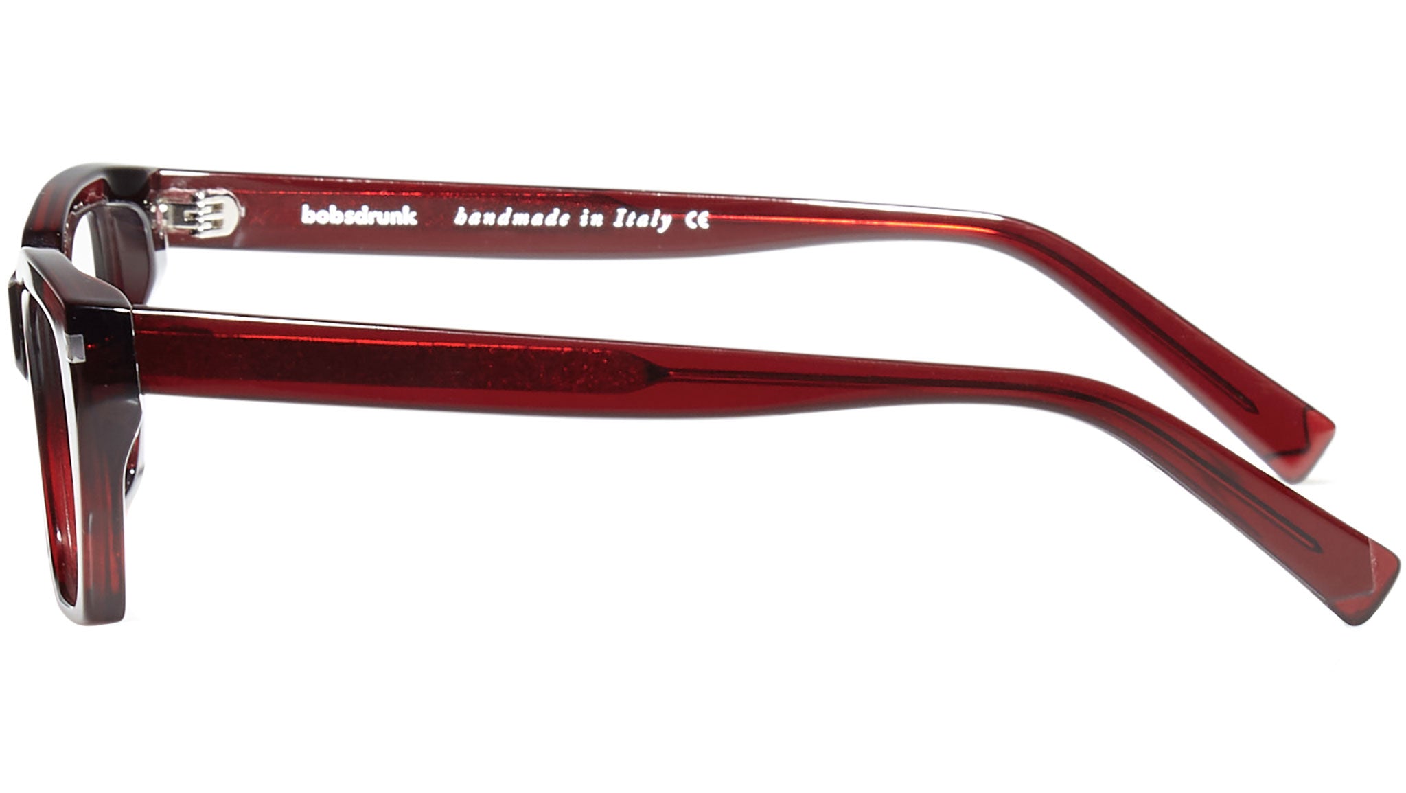 Bobsdrunk Iris optical frame color code 14 in transparent burgundy. Timeless products and bold shapes coexist in this original Eyewear collection. The lines are masterfully designed to create an effect of bold lightness. Each pair of Bobsdrunk glasses is characterized by an emblematic detail, shown on the front and on the tip of the temples, which highlights the value of the brand. It represents the union of the initial and final letter of Bobsdrunk in an iconic symbol. The careful choice of materials, the selection of craftsmanship and a constant chromatic research are the prerogatives of each Bobsdrunk creation.