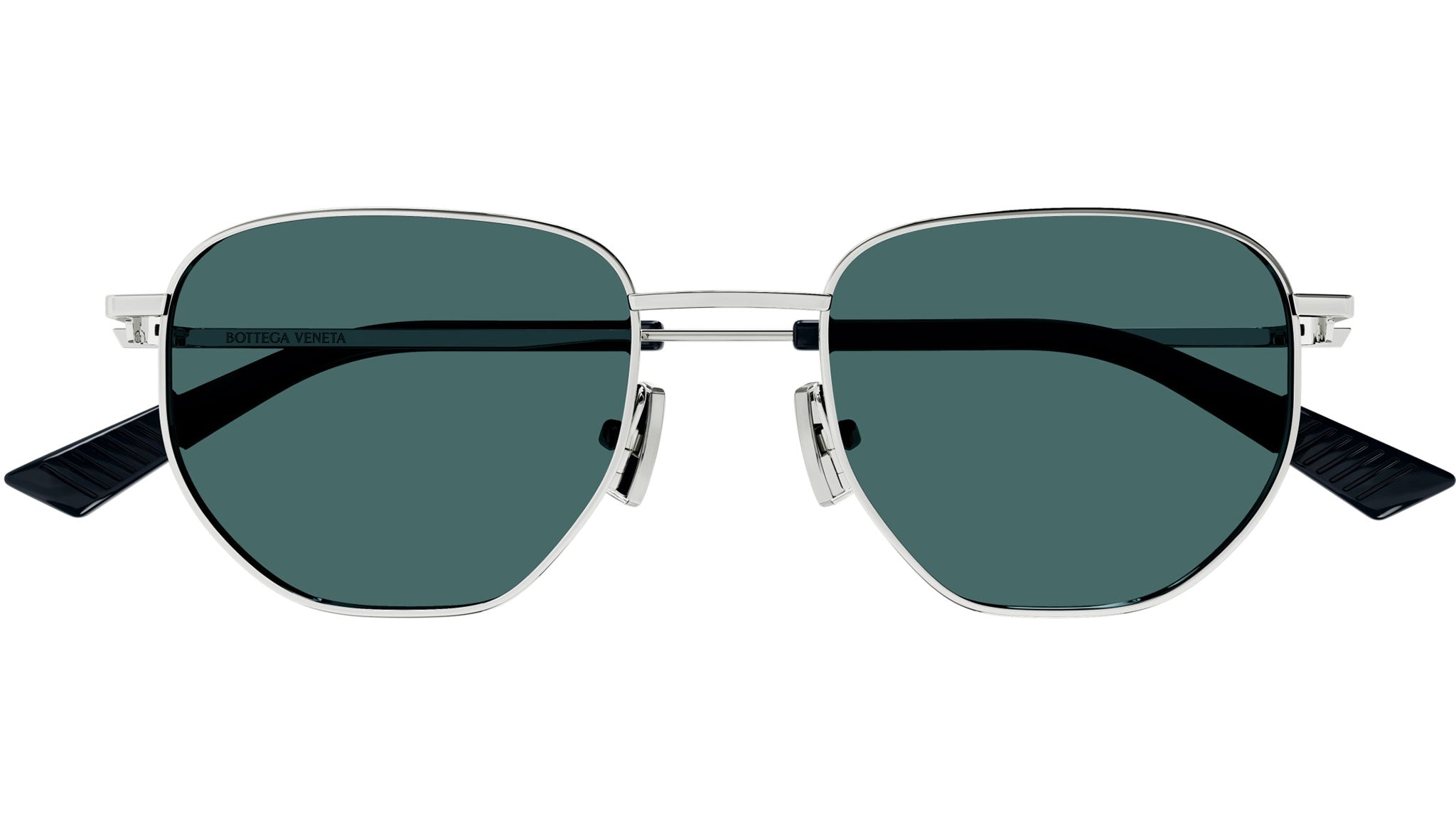 Bottega Veneta sunglasses model BV1301S Minimalist line color code 004 shiny silver in metal panthos shape with solid color blue green lenses.