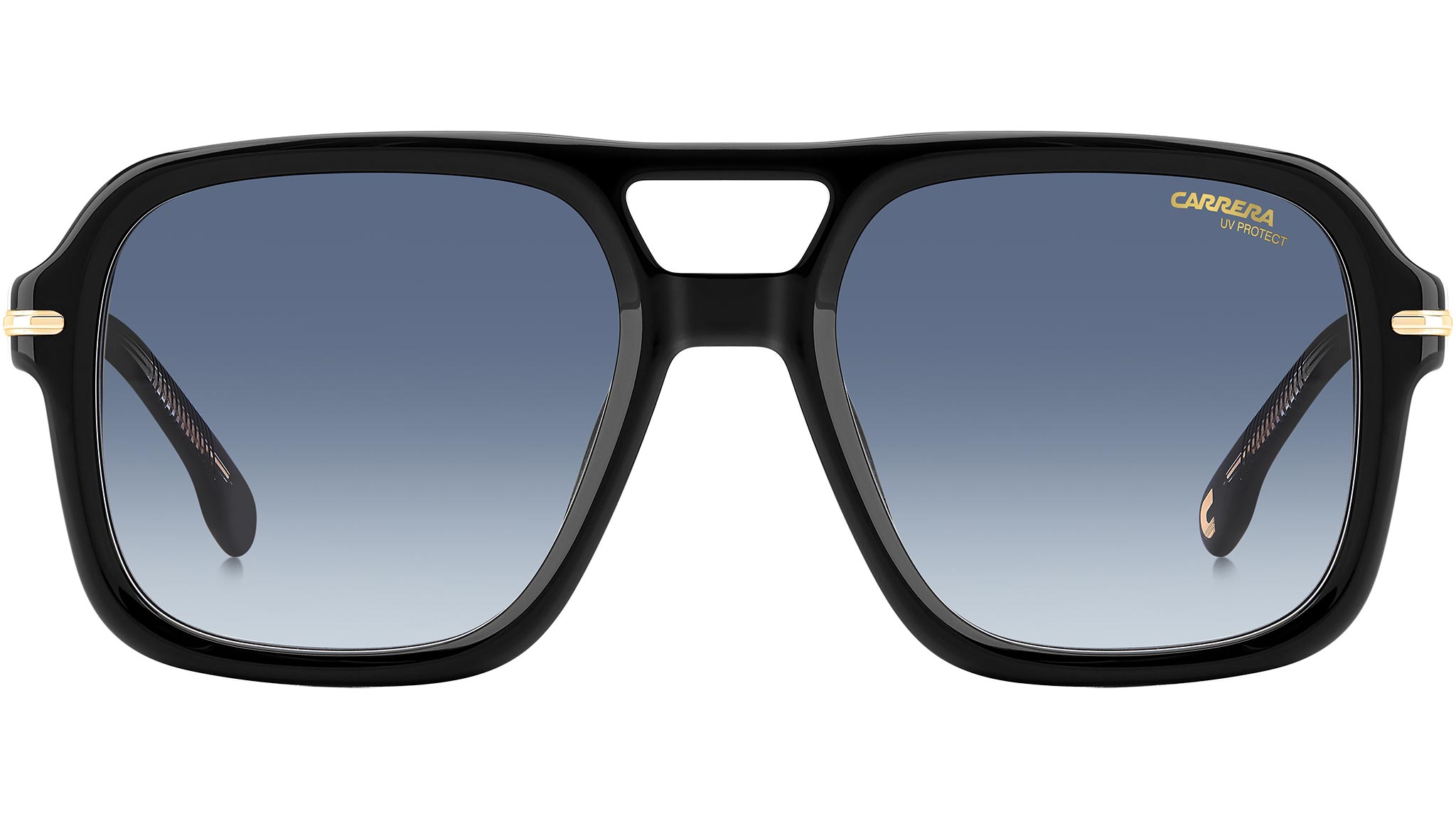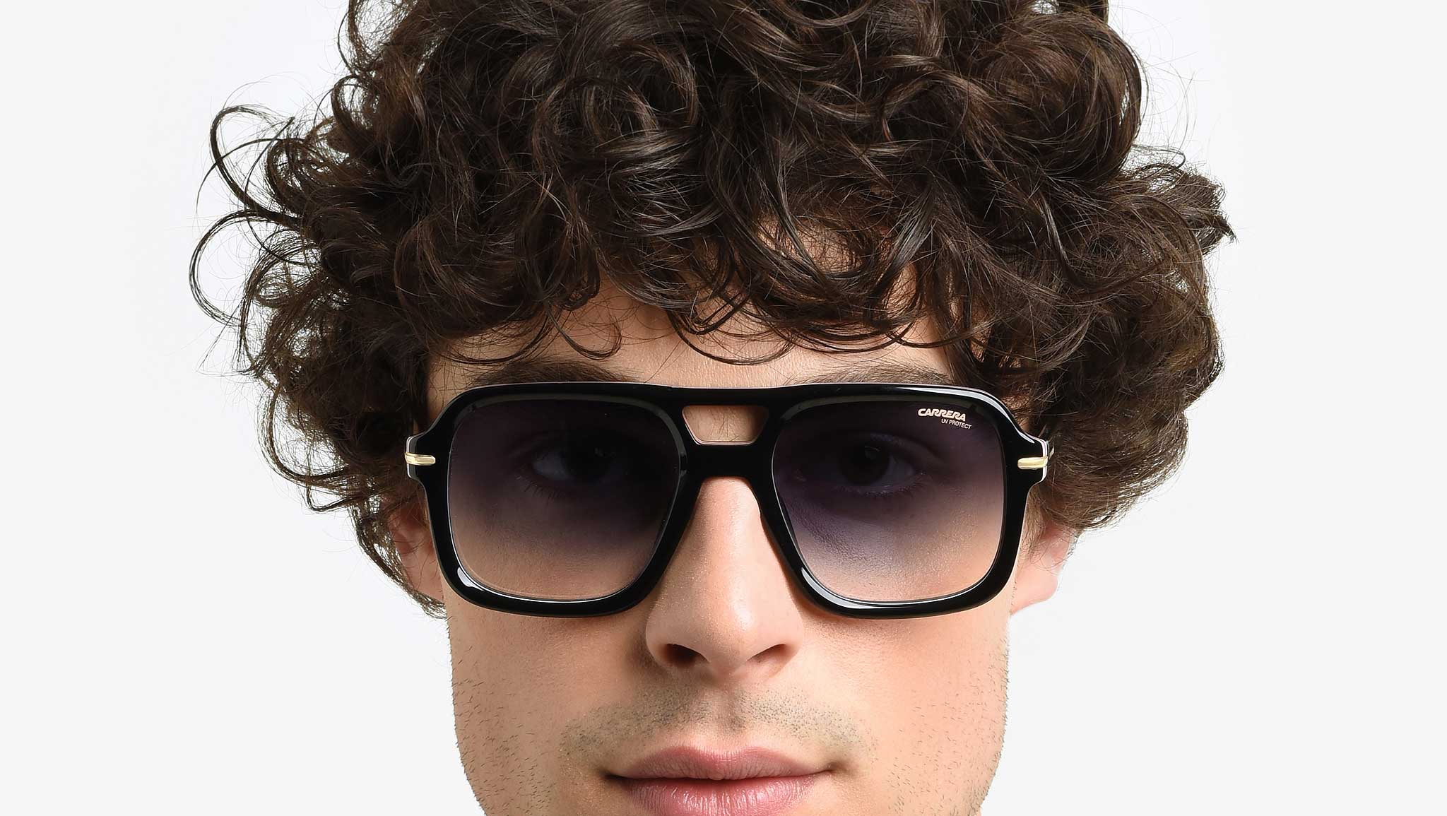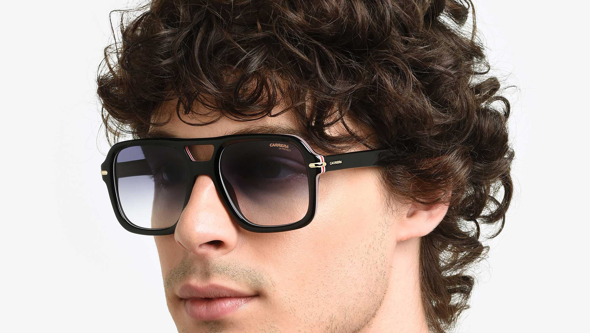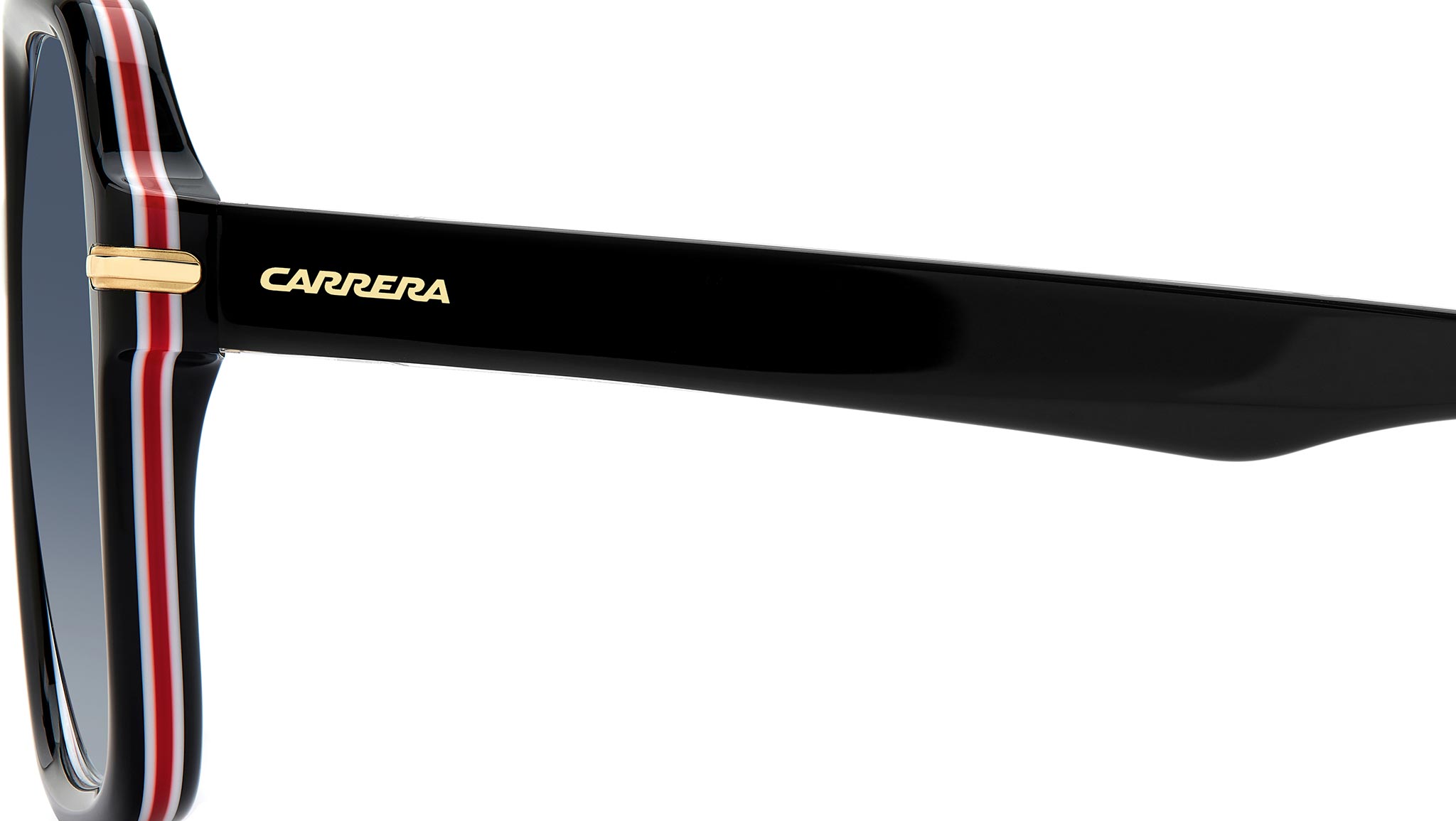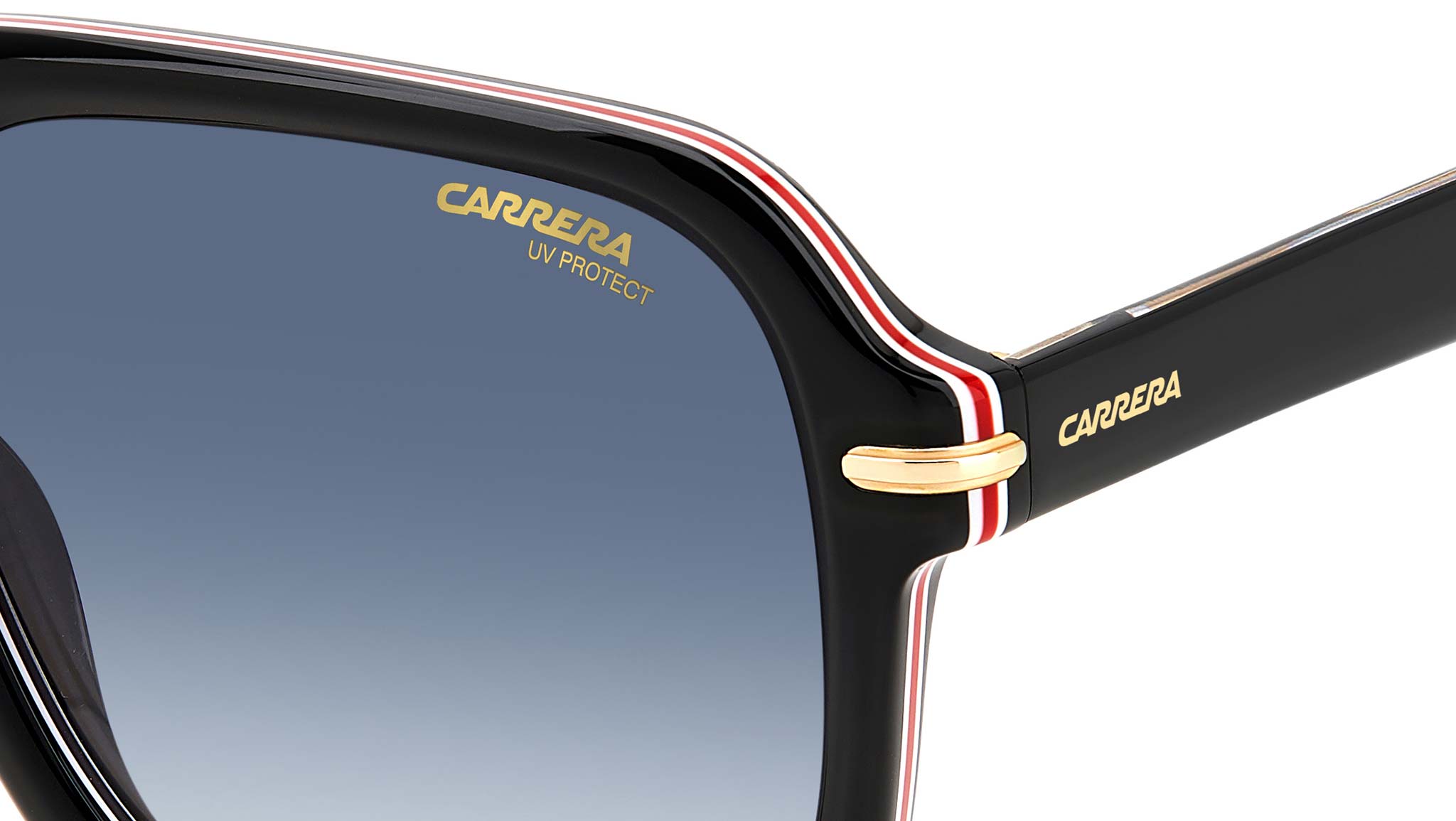 Carrera sunglasses model 317/S color M4P 08 striped black. The spotlight is on these sunglasses with large, plastic and sculpted volumes. One of the most loved Carrera styles – the navigator shape with double bridge – is made of acetate, completed by slender temples and sculpted metal inserts on the side of the lenses. The color palette includes multilayer and transparent versions with visible worked core. Possibility of mounting graduated lenses.