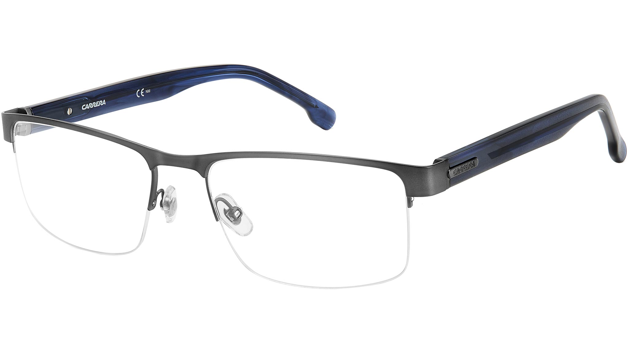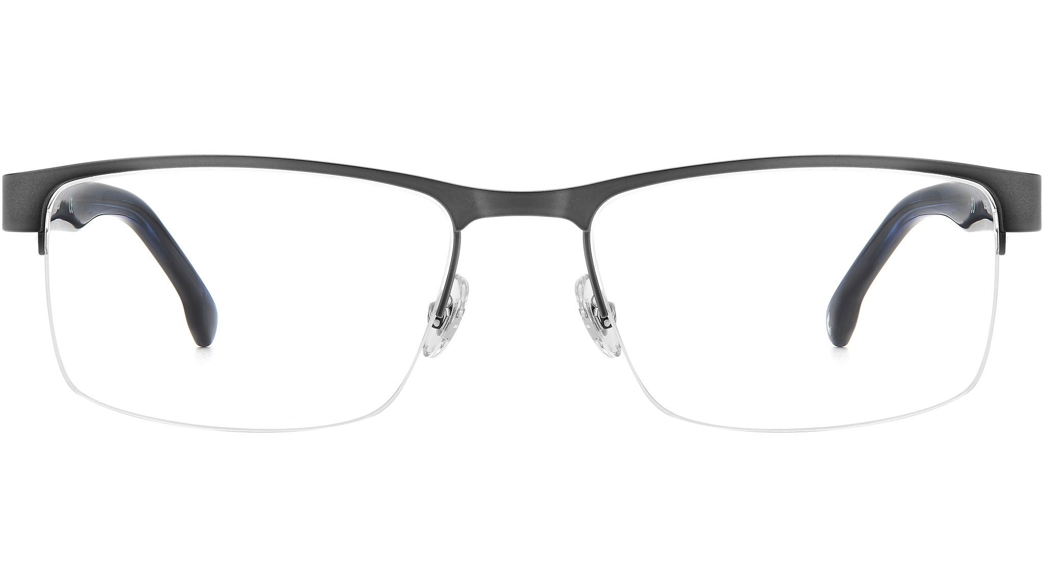 Carrera eyeglasses model 8888 color R80 matte dark ruthenium. Men's eyeglasses with half-rim frame, minimal front in stainless steel and adjustable nose pads. The model is identified by the acetate temples, available in the most classic variations, enriched by the Carrera logo plate. The integrated hinge technology ensures maximum flexibility and enviable comfort. The model is available in two different calibers, ensuring perfect harmony with everyone's features.