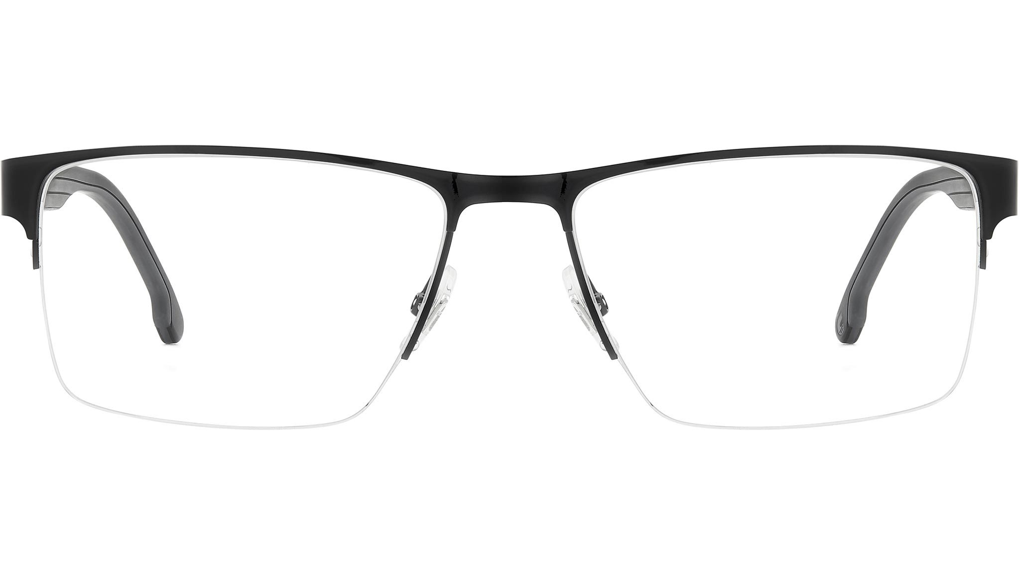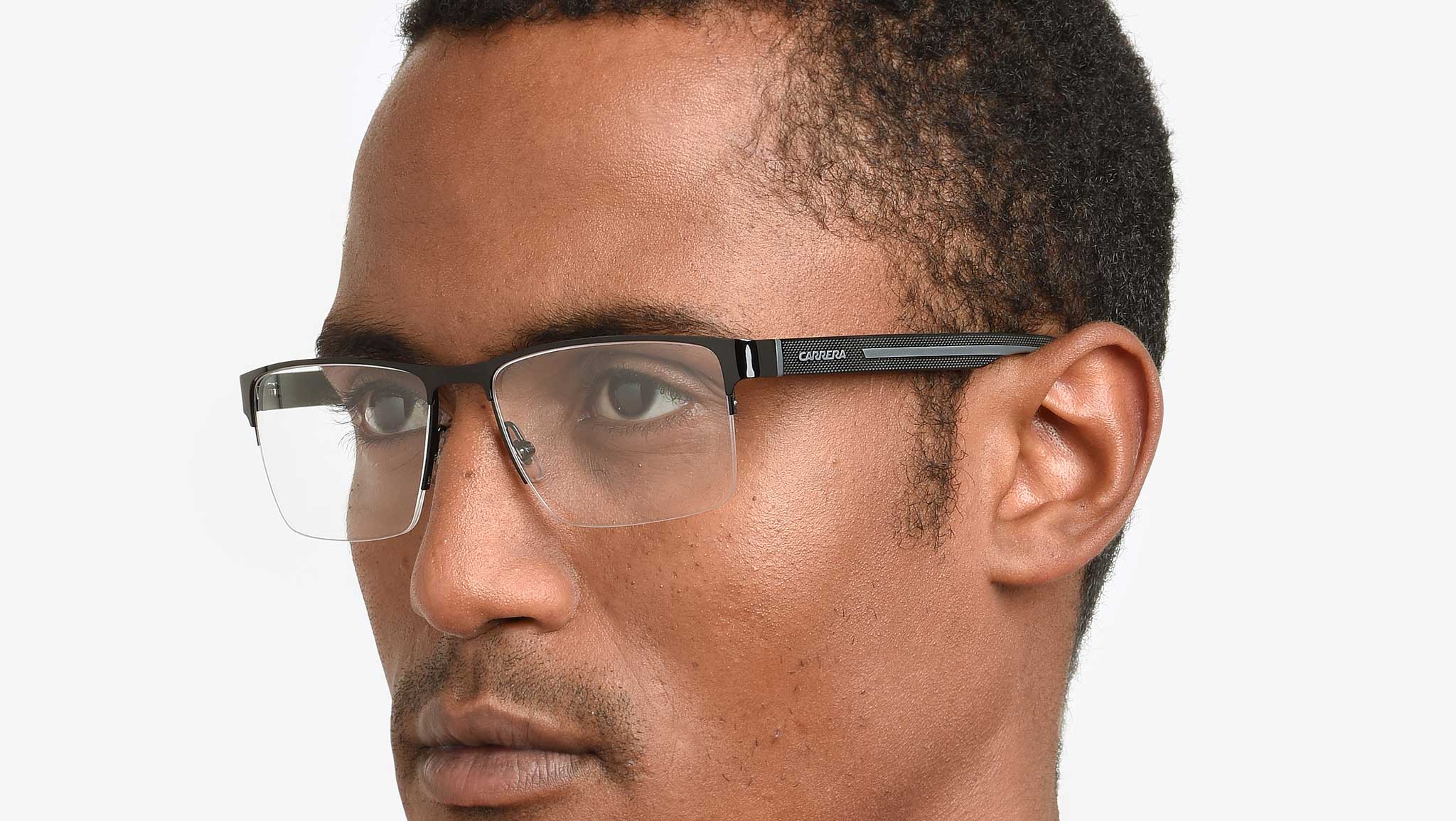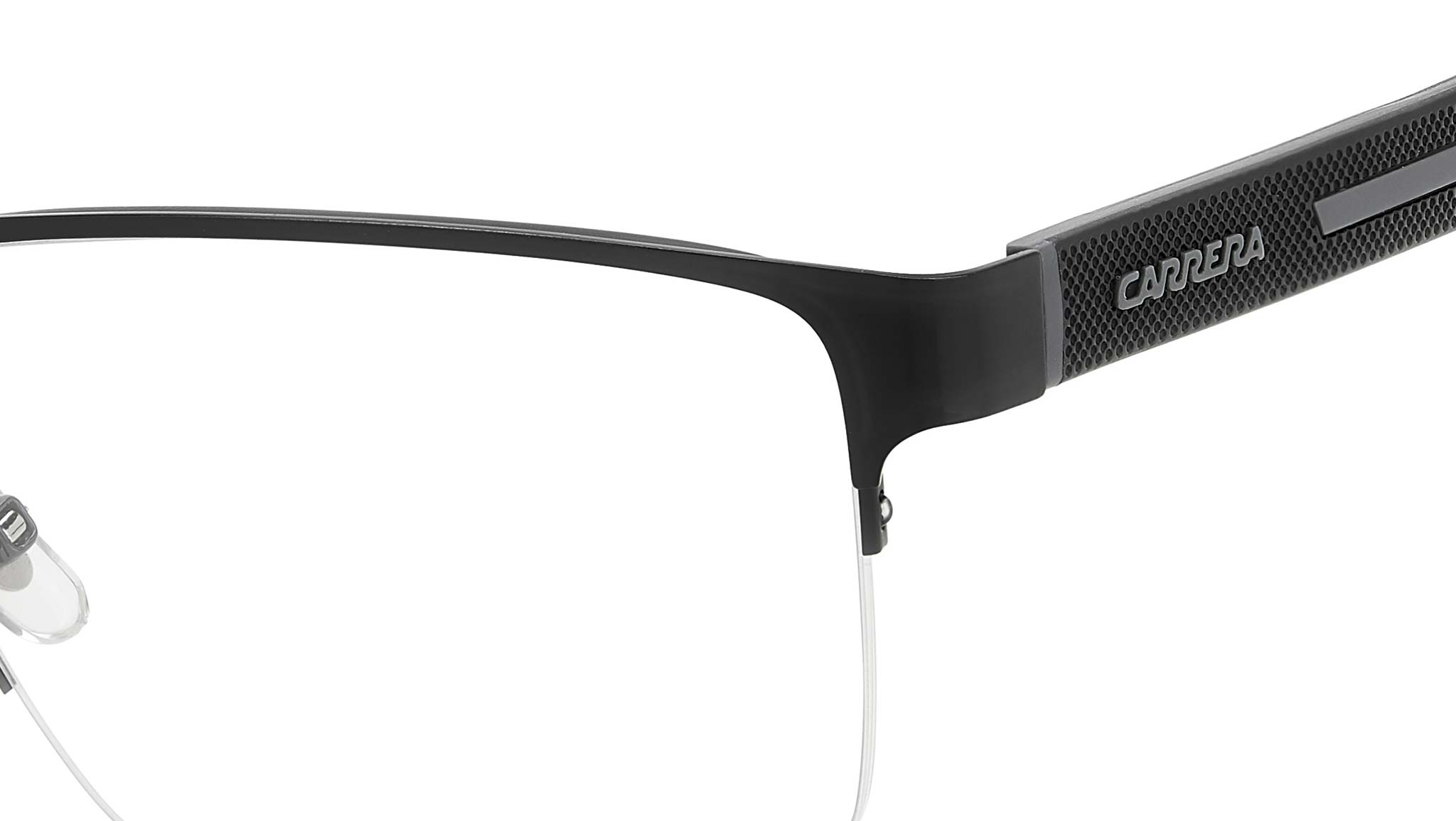 Carrera eyeglasses model 8893 color 08A black grey. The adrenaline of sport is experienced every day with these eyeglasses by Carrera. They have a half-frame front, even more comfortable because it is made of light stainless steel and completed with adjustable nose pads. The sporty attitude is seen in the bi-injected polyamide temples, with rubber inserts to replicate the Carrera flag.