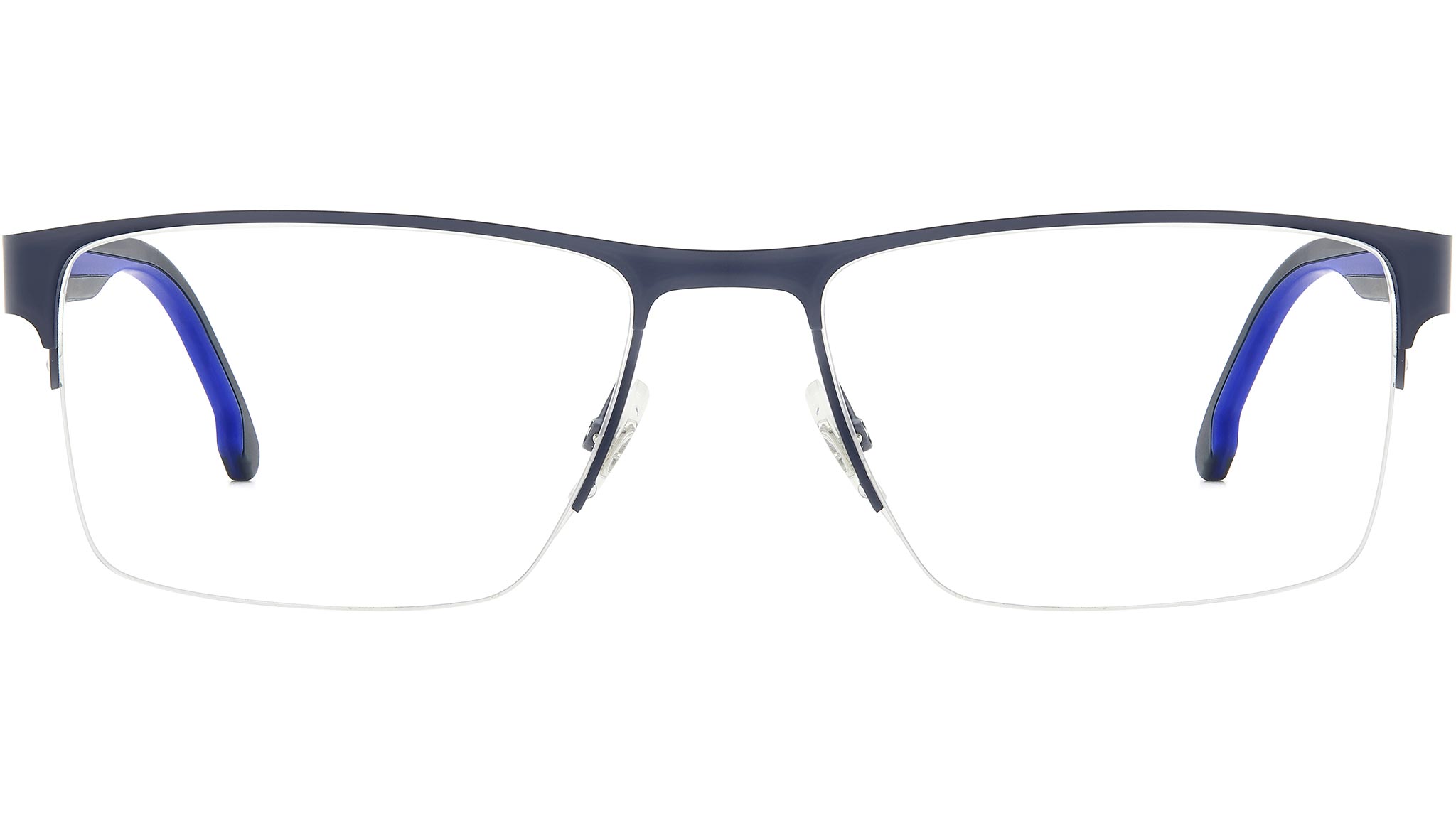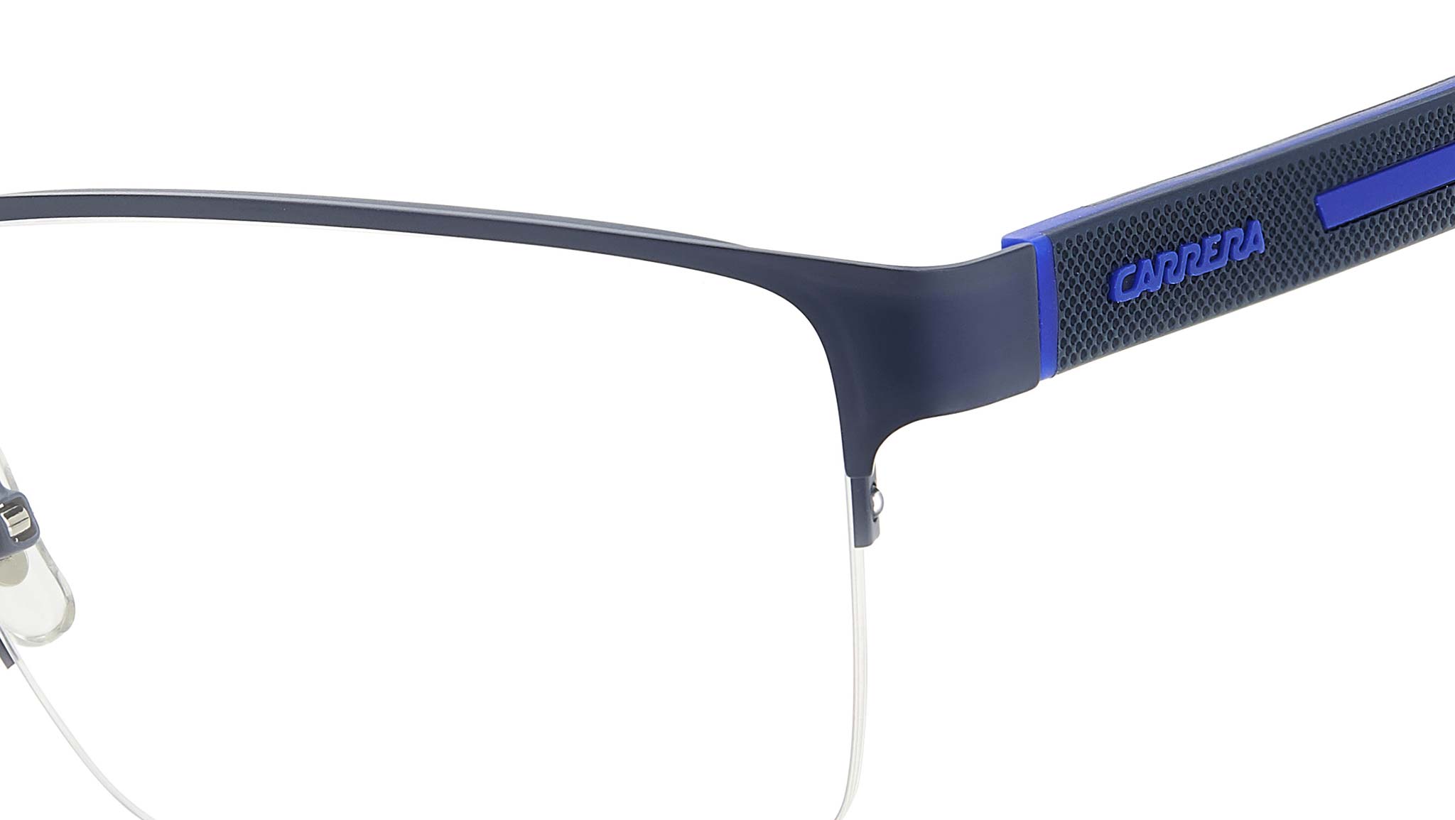 Carrera eyeglasses model 8893 color FLL matte blue. The adrenaline of sport is experienced every day with these eyeglasses by Carrera. They have a half-frame front, even more comfortable because it is made of light stainless steel and completed with adjustable nose pads. The sporty attitude is seen in the bi-injected polyamide temples, with rubber inserts to replicate the Carrera flag.