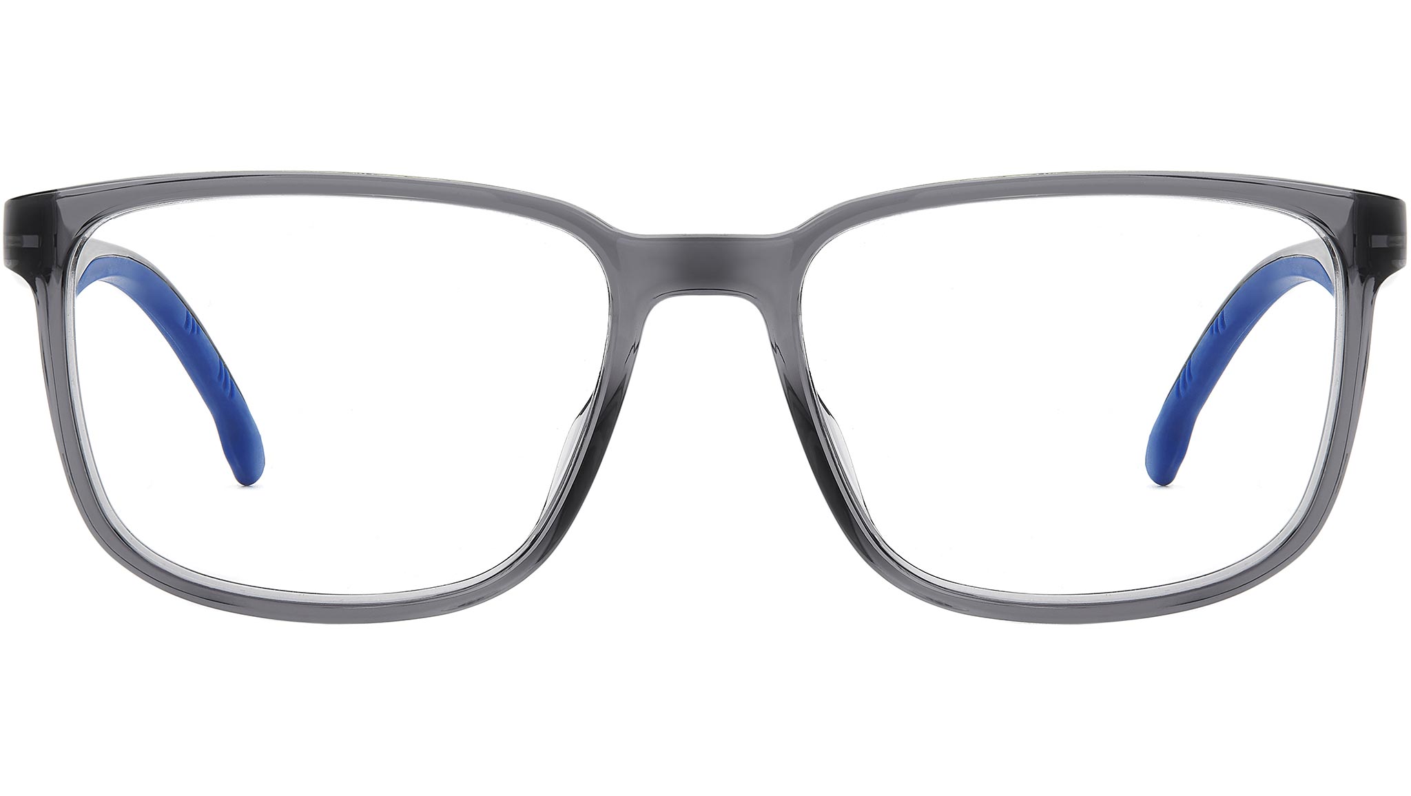 Carrera eyeglasses model 8894 color 09V grey blue. There is all the dynamism of athleisure fashion in these eyeglasses by Carrera. The polyamide structure is light and durable, the rubberized terminals ensure stability: this is why the model can also be worn on days on the move. The chromatic contrasts are synonymous with a youthful and irreverent freshness, in line with the sporty attitude of Carrera.