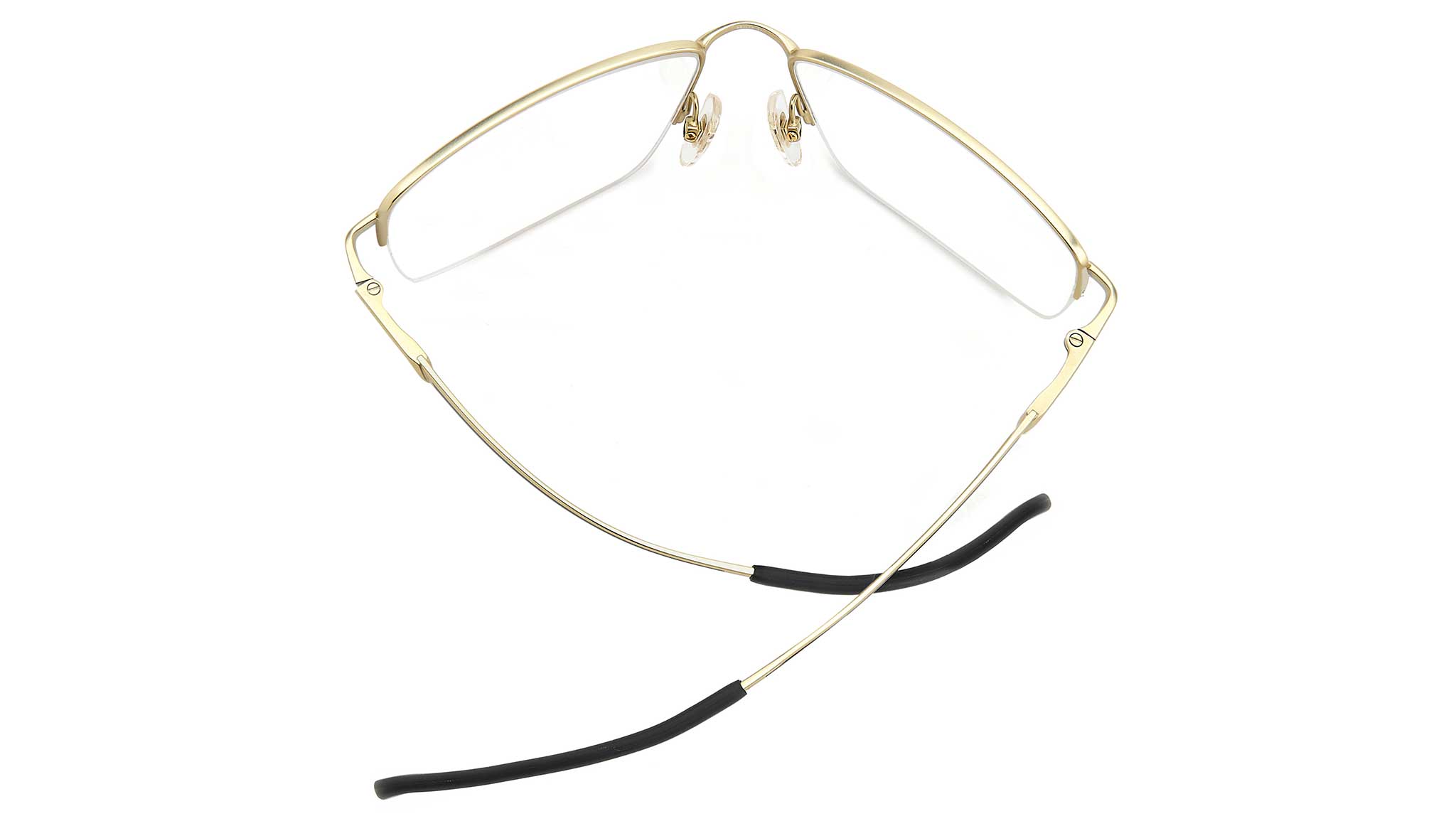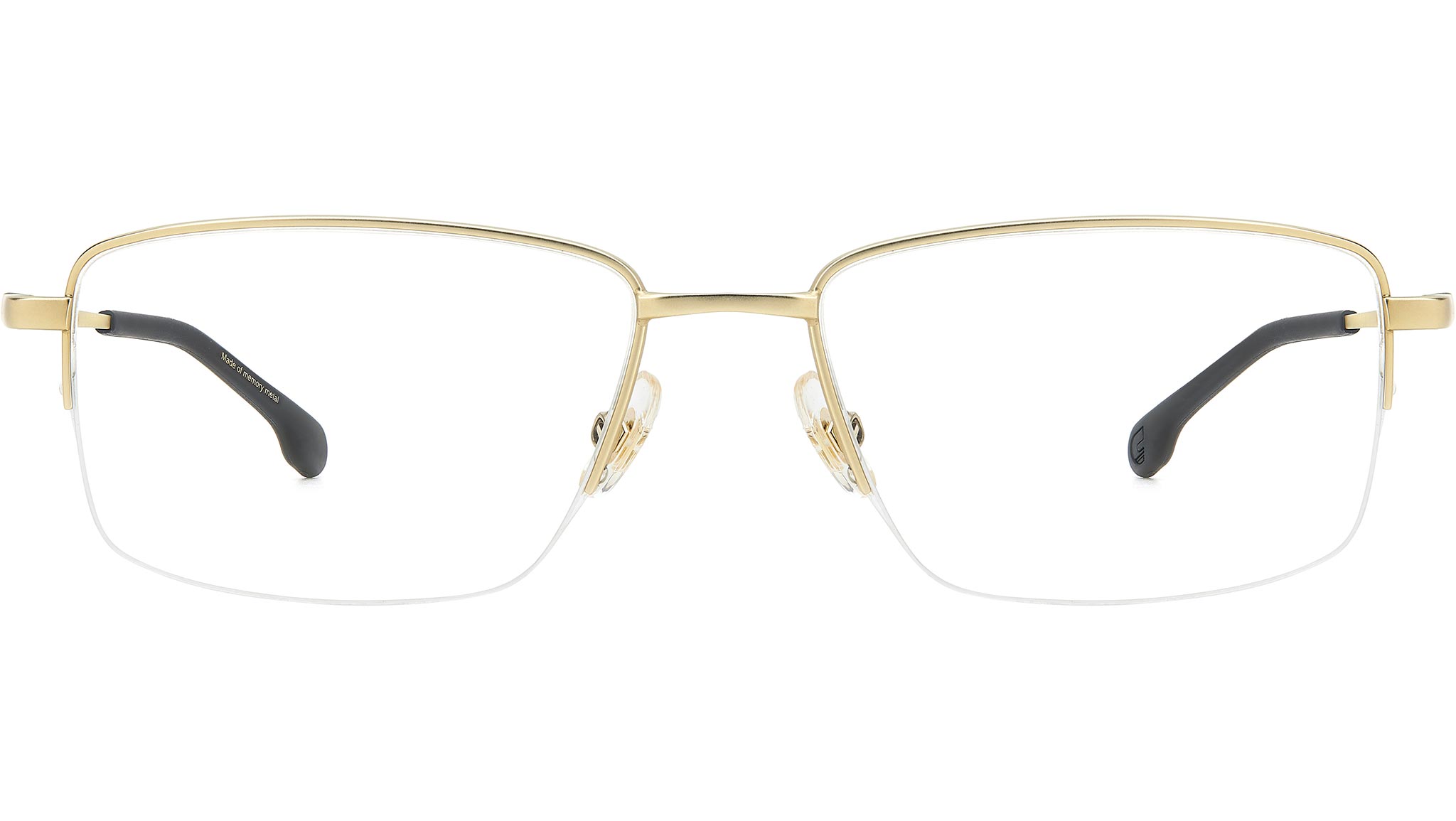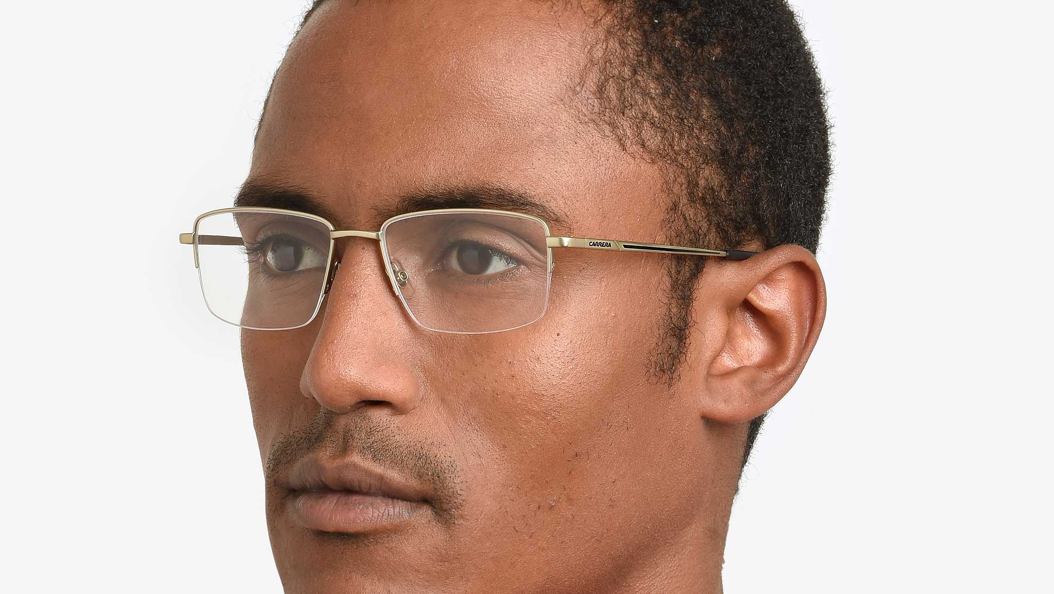 Carrera eyeglasses model 8895 color AOZ matte gold. Carrera offers eyeglasses with incomparable technical qualities. The temples and the bridge between the lenses are in fact made of Memory Metal, a premium material that ensures maximum flexibility and resistance to use. The functional nature of the model is enhanced by the design of the half-frame front, whose fit is optimized by adjustable nose pads. The identity of the brand is expressed with the Carrera flag printed on the temples.