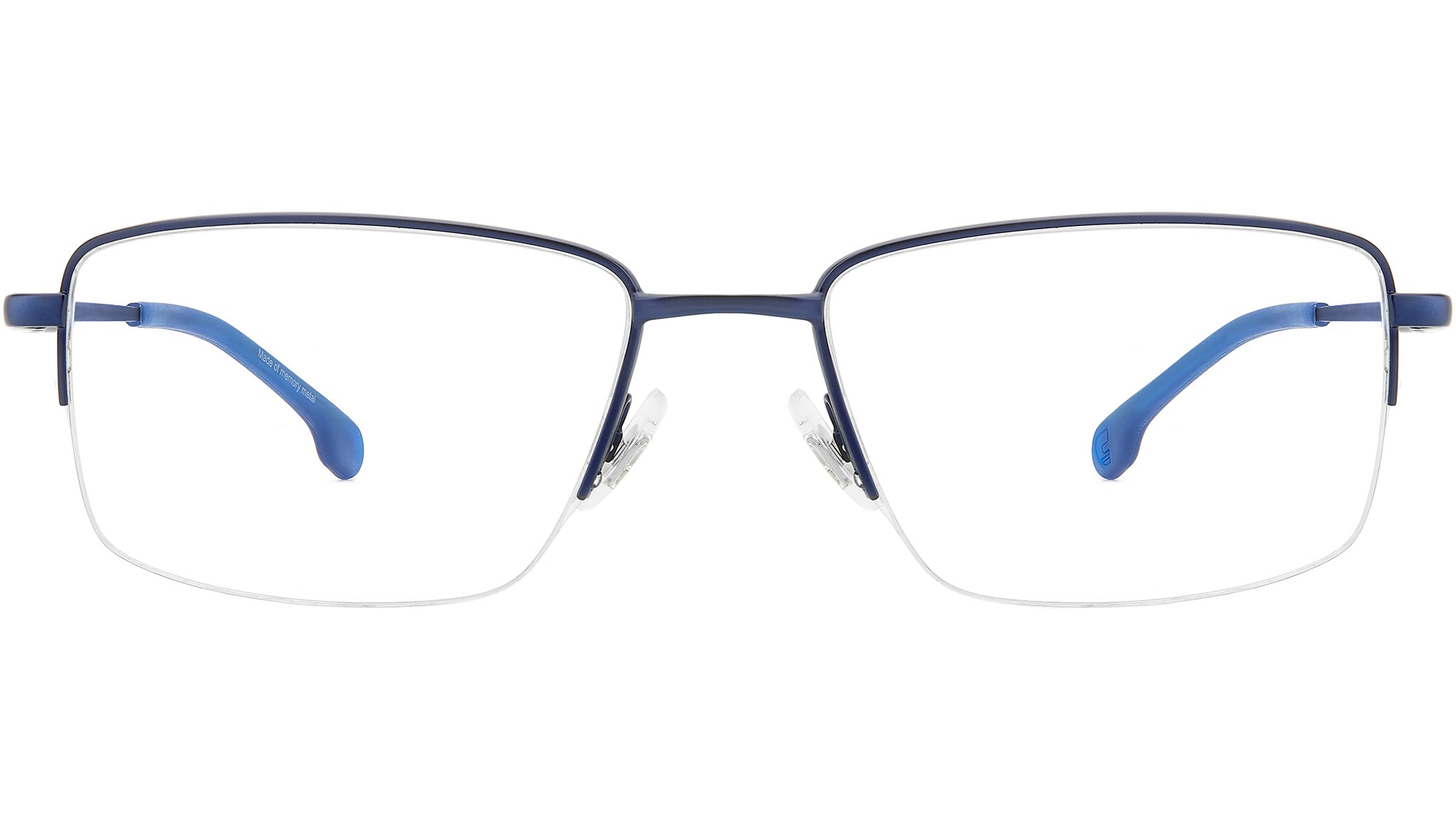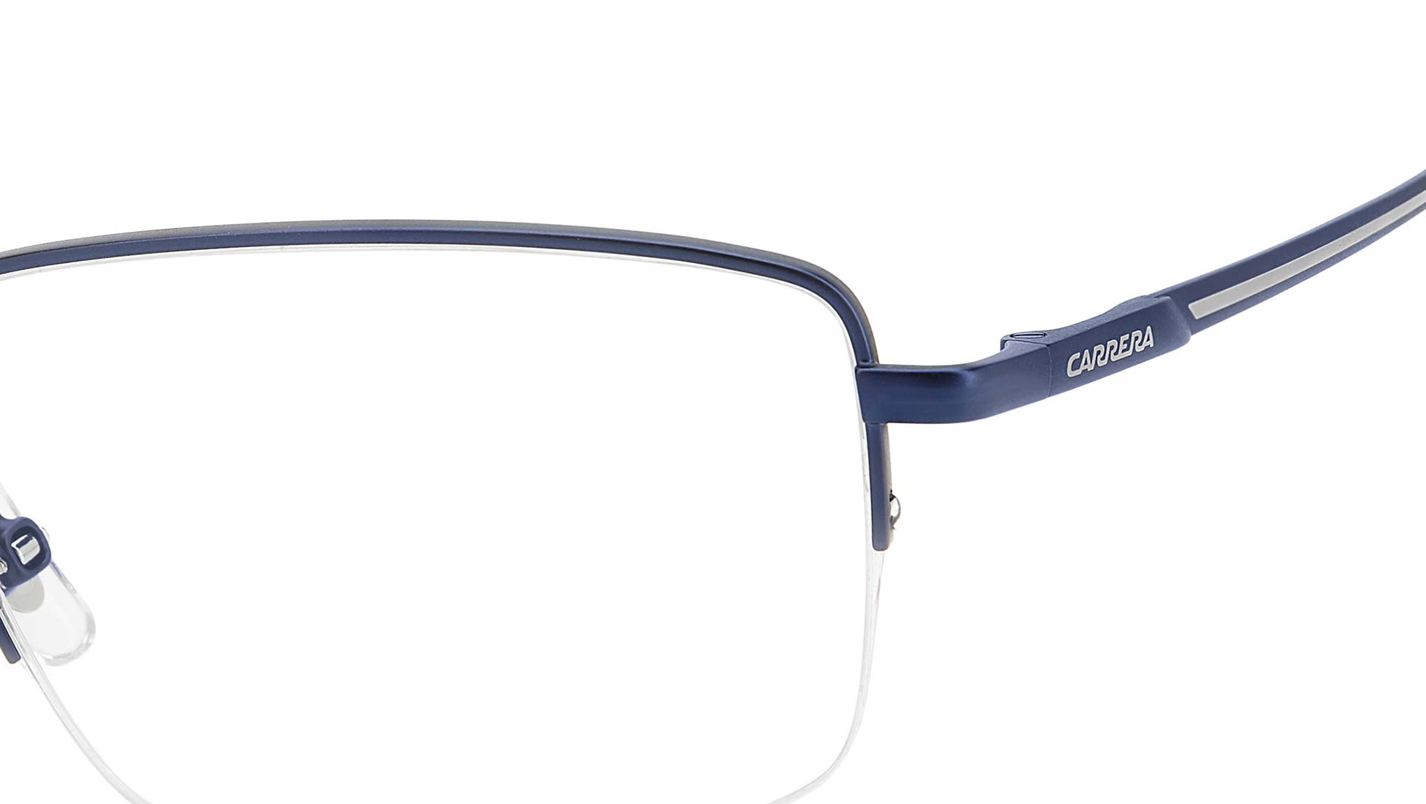 Carrera eyeglasses model 8895 color FLL matte blue. Carrera offers eyeglasses with incomparable technical qualities. The temples and the bridge between the lenses are in fact made of Memory Metal, a premium material that ensures maximum flexibility and resistance to use. The functional nature of the model is enhanced by the design of the half-frame front, whose fit is optimized by adjustable nose pads. The identity of the brand is expressed with the Carrera flag printed on the temples.