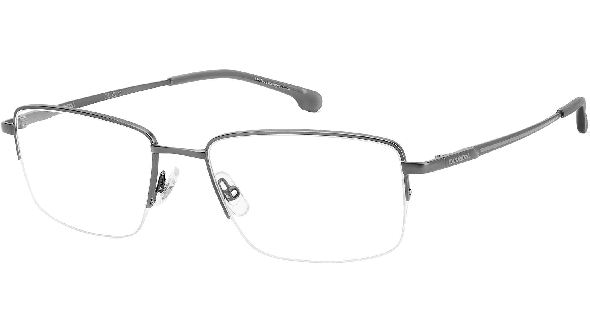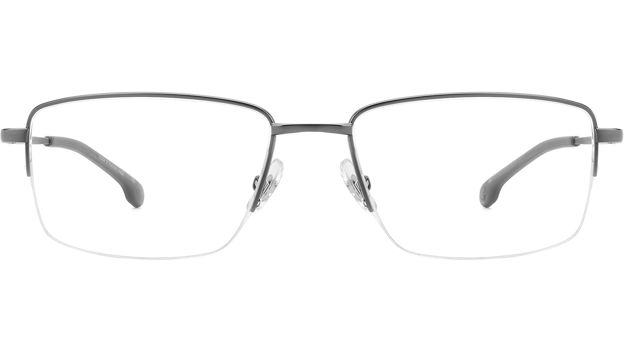 Carrera eyeglasses model 8895 color R80 matte dark ruthenium. Carrera offers eyeglasses with incomparable technical qualities. The temples and the bridge between the lenses are in fact made of Memory Metal, a premium material that ensures maximum flexibility and resistance to use. The functional nature of the model is enhanced by the design of the half-frame front, whose fit is optimized by adjustable nose pads. The identity of the brand is expressed with the Carrera flag printed on the temples.