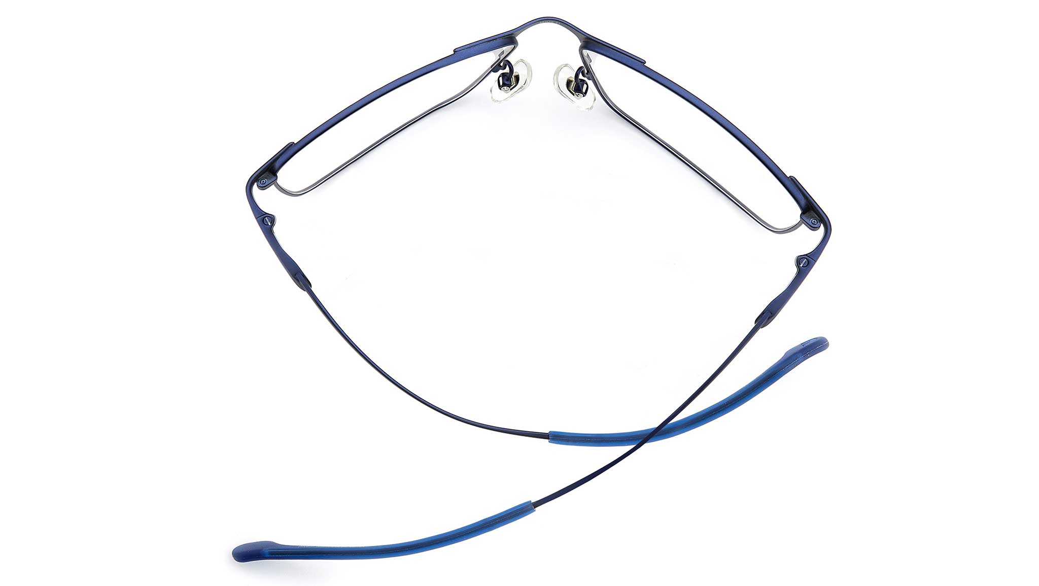 Carrera eyeglasses model 8896 color FLL matte blue. Sporty inspiration for these Carrera eyeglasses. The front includes a clean design with reduced volumes, adjustable nose pads and a bridge in Memory Metal, an extremely flexible material. The temples are also in Memory Metal, adaptable and resistant, and their slender shape is exaggerated by the Carrera flag in two colors, coordinated with the lettering logo.