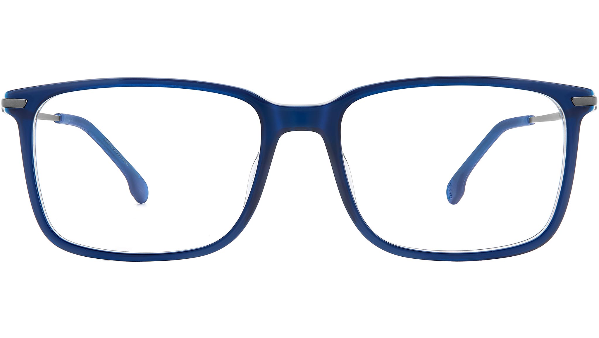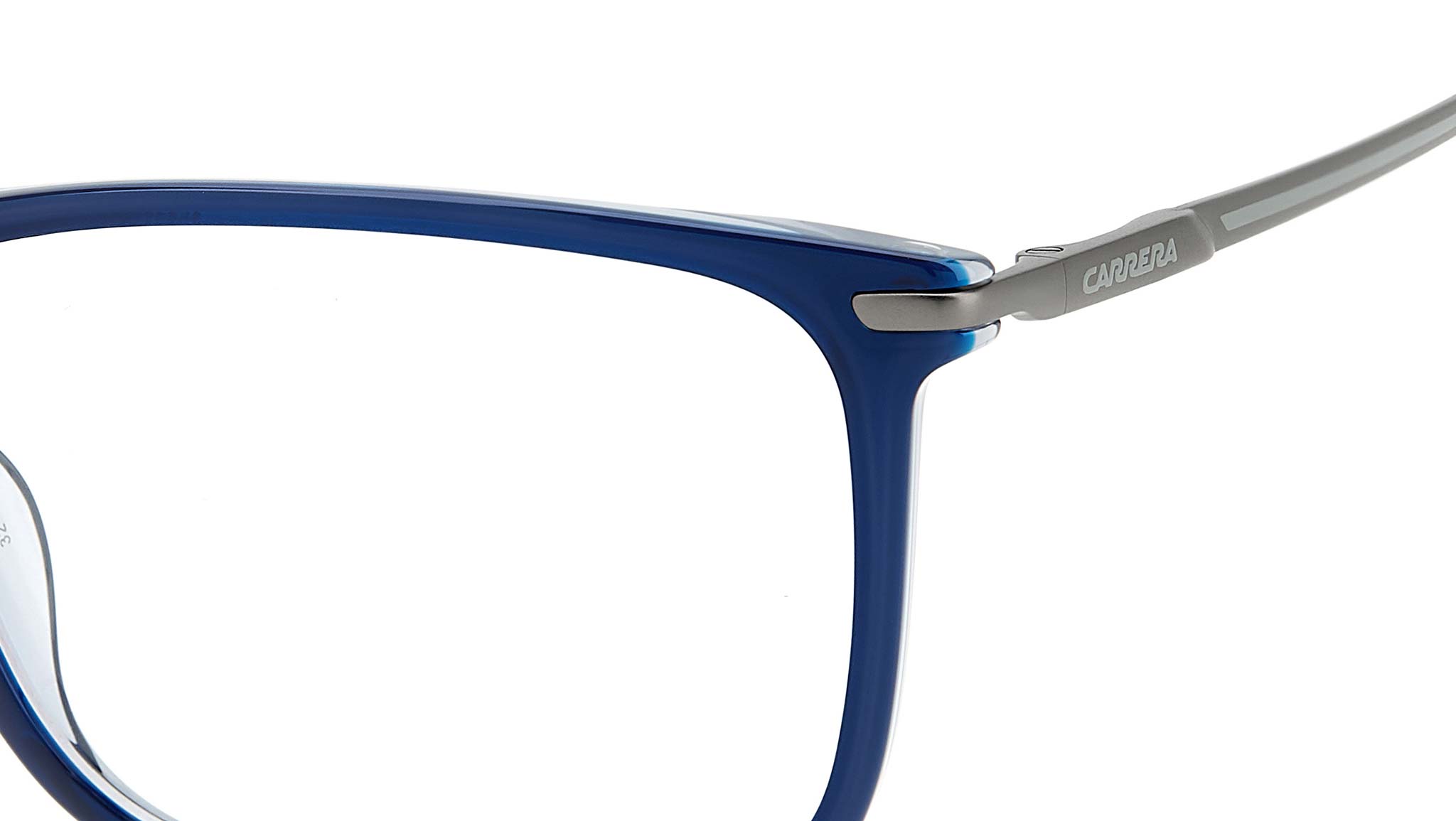 Carrera eyeglasses model 8897 color PJP blue. Carrera technology and quality give life to eyeglasses with high technical value. This model is made of a light acetate front, simply impeccable in its lines and thin profiles. The temples are in Memory Metal, a premium material with great flexibility, for everyday use in the name of comfort. The color palette also includes the variants with the Carrera flag printed on the temples.
