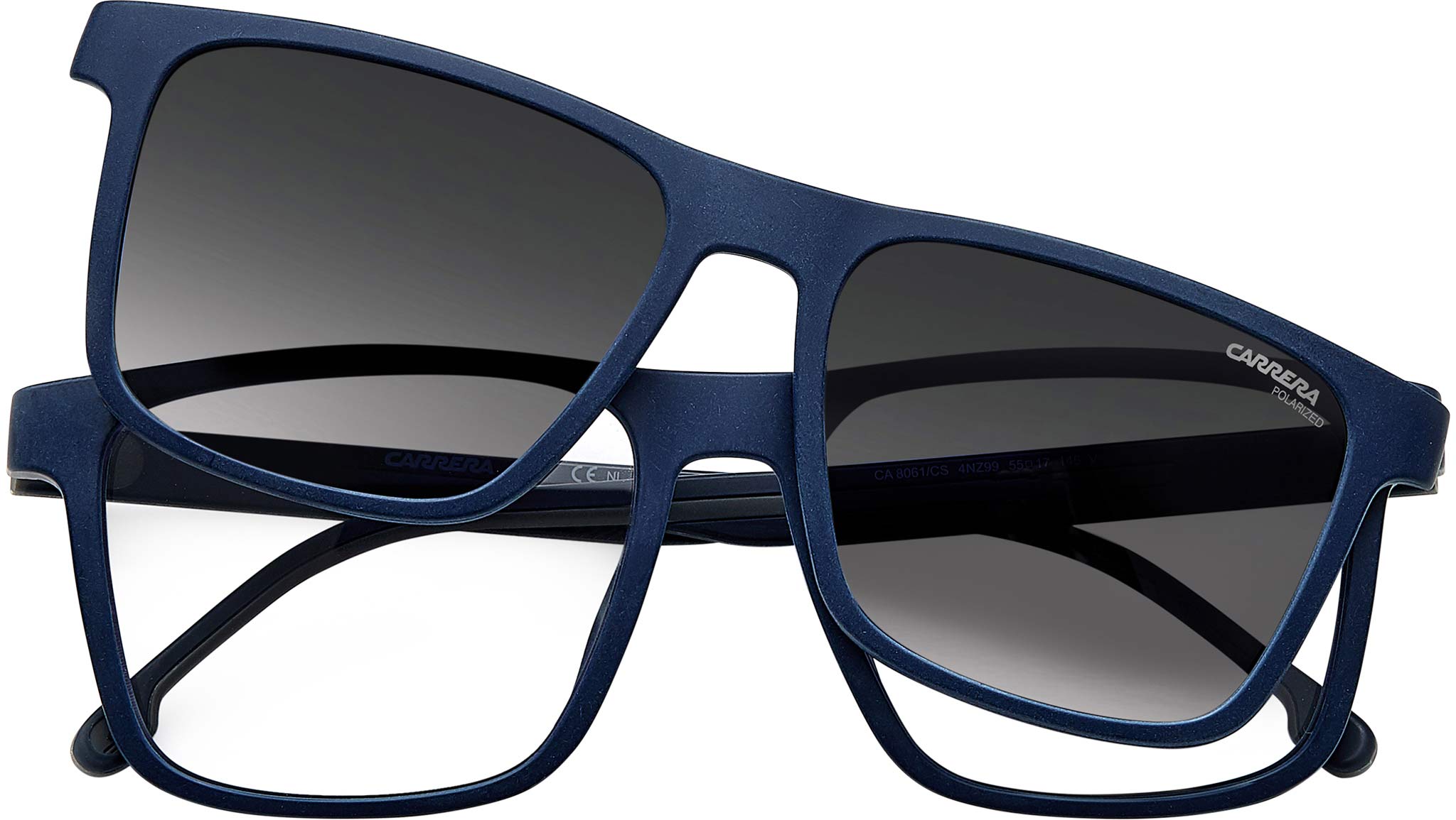 Carrera sunglasses model CA8061/CS color 4NZ WJ matte blue grey. Stylish and innovative, these glasses are full of technical features that provide extreme comfort. The frame guarantees grip and perfect wearability thanks to the bi-injected polyamide technology, available in two colors on the temples, a distinctive Carrera touch. The model features polarized clip-on sunglasses, which attach to the front with magnets, to face sunny days with enviable ease.