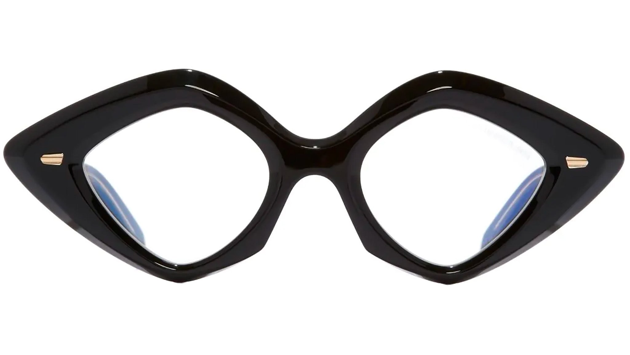 A historic frame first worn by Cutler and Gross client Elton John has been reworked with a more modern lens, giving life to the 9126 optical model. Its silhouette is eccentric, with a curved brow line and lugs and very pronounced corner bevels. The frame features a split-layer construction that lightens the black acetate front with transparent temple edges.