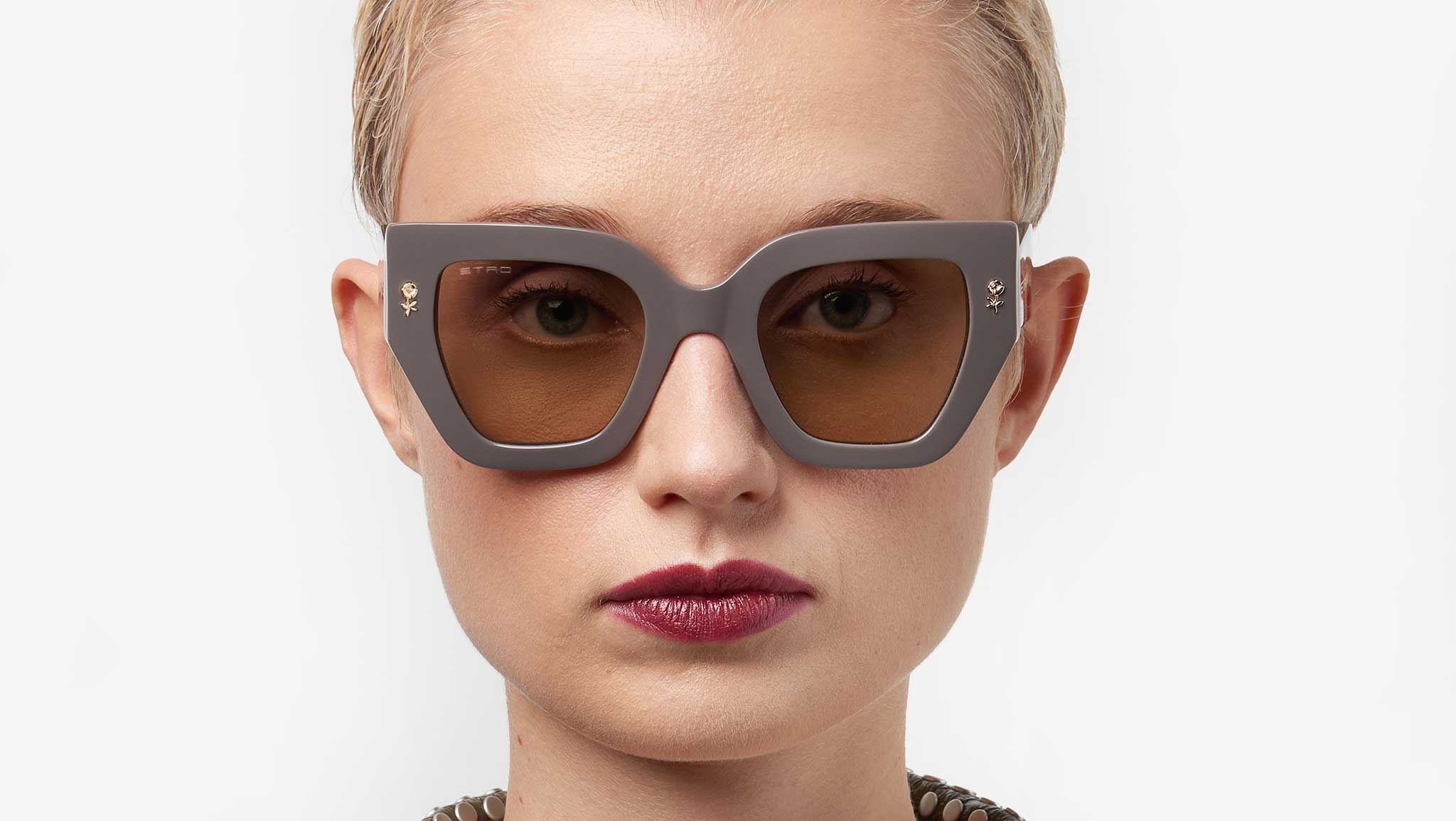 ETRO sunglasses model 0010/S color code 79U QT in mud acetate with green CR-39 lenses. A tribute to the floral motifs and graphic patterns that define ETRO's aesthetic, the "Colour Stripes" eyewear collection translates the Maison's embroideries and prints into eclectic and sophisticated sunglasses. The acetate frame with rounded corners is embellished with a flower-shaped metal application and a multicolored striped insert on the sides. The temples are made of transparent acetate with an internal metal core. The innovative design is completed by the iconic acetate tips, inspired by the symmetry of the ETRO logo. Authorized online dealer Dsquared2.