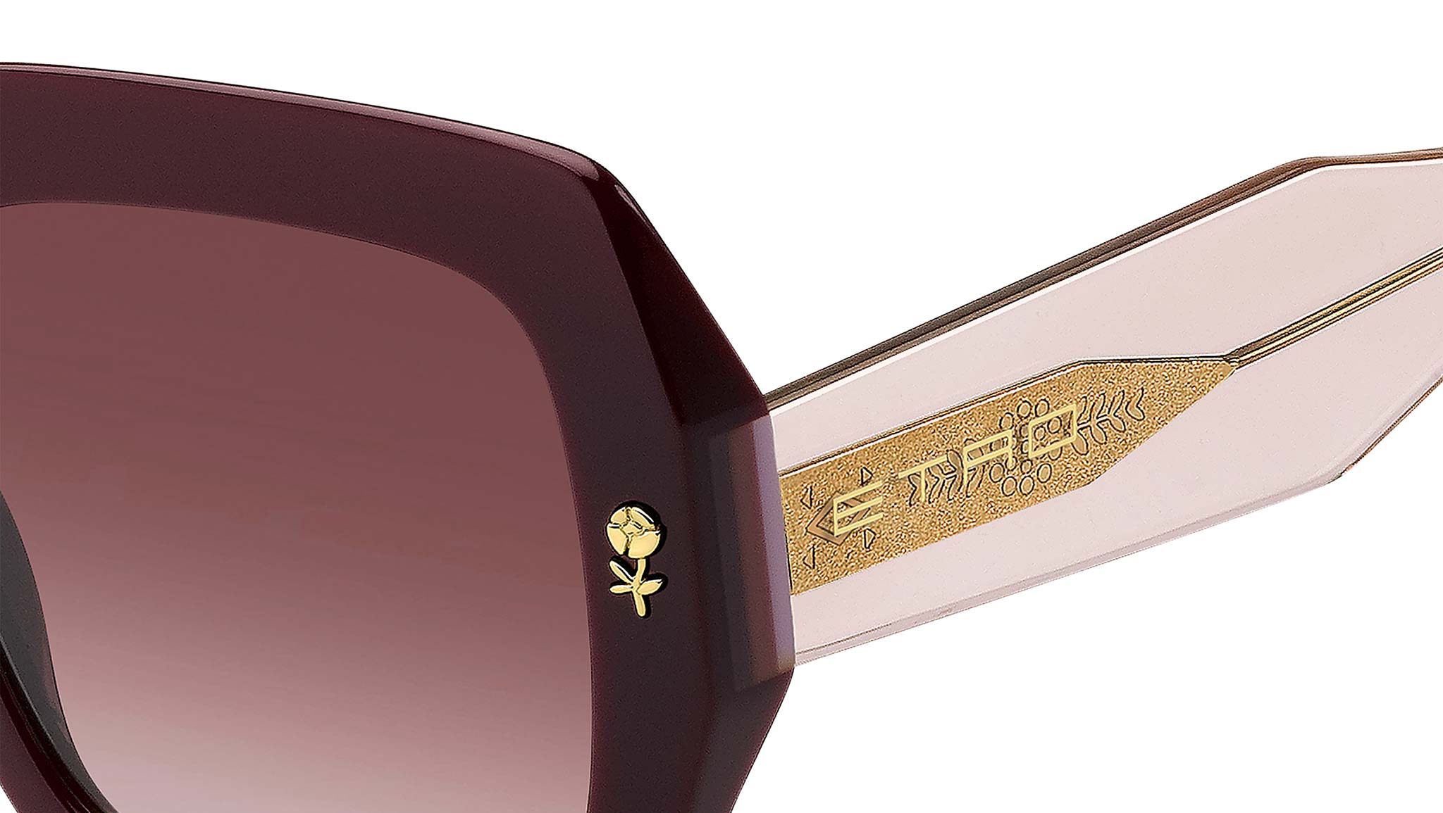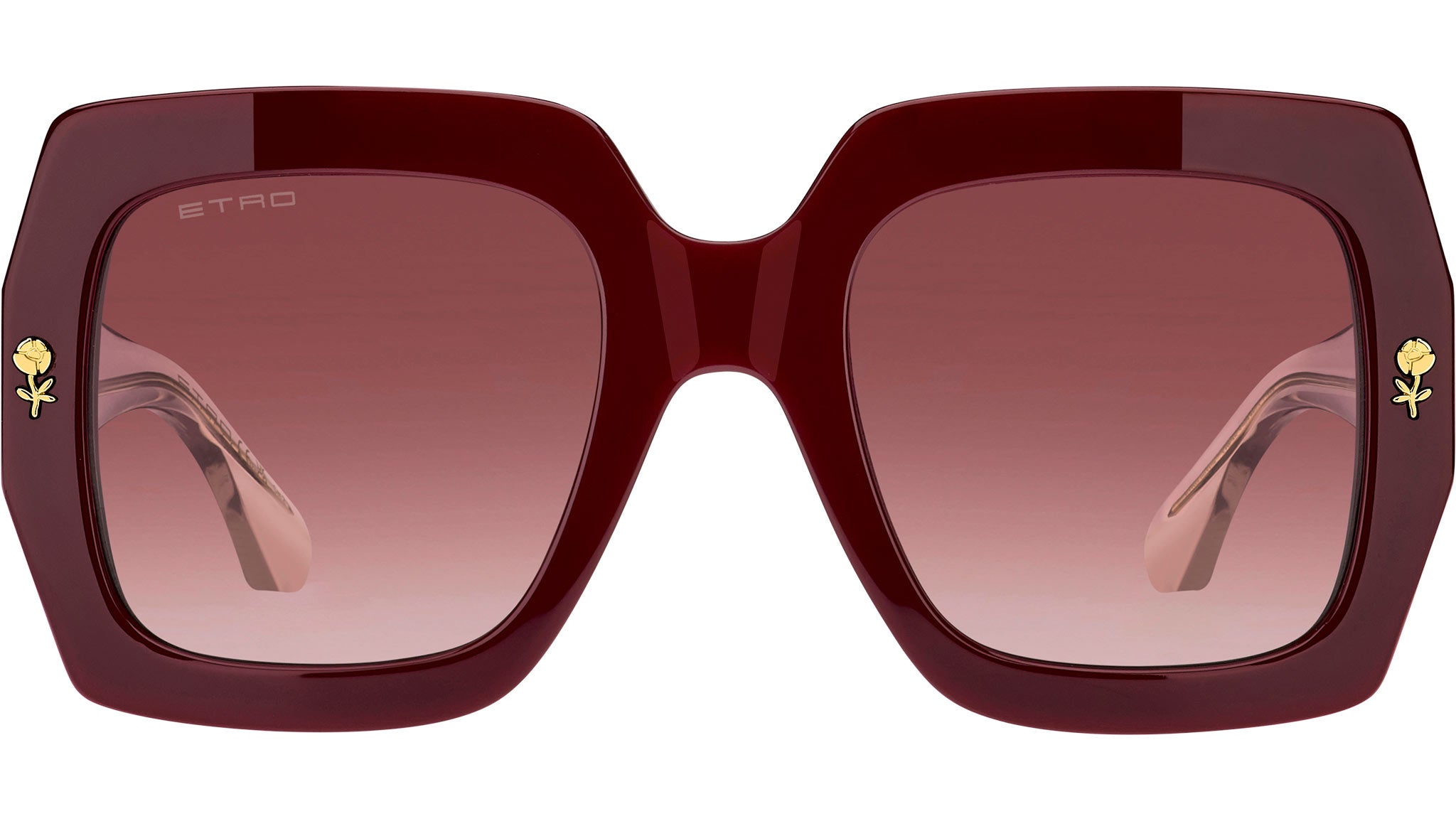 ETRO sunglasses model 0011/S color code LHF 3X in burgundy acetate with pink dual-tone CR-39 lenses. A tribute to the floral motifs and graphic patterns that define ETRO's aesthetic, the "Graphic Elegance" eyewear collection translates the Maison's embroidery and prints into eclectic and sophisticated sunglasses. The acetate frame with rounded corners is embellished with a flower-shaped metal application and a multicolored striped insert on the sides. The temples are made of transparent acetate with an internal metal core. The innovative design is completed by the iconic acetate tips, inspired by the symmetry of the ETRO logo. Authorized online dealer Dsquared2.