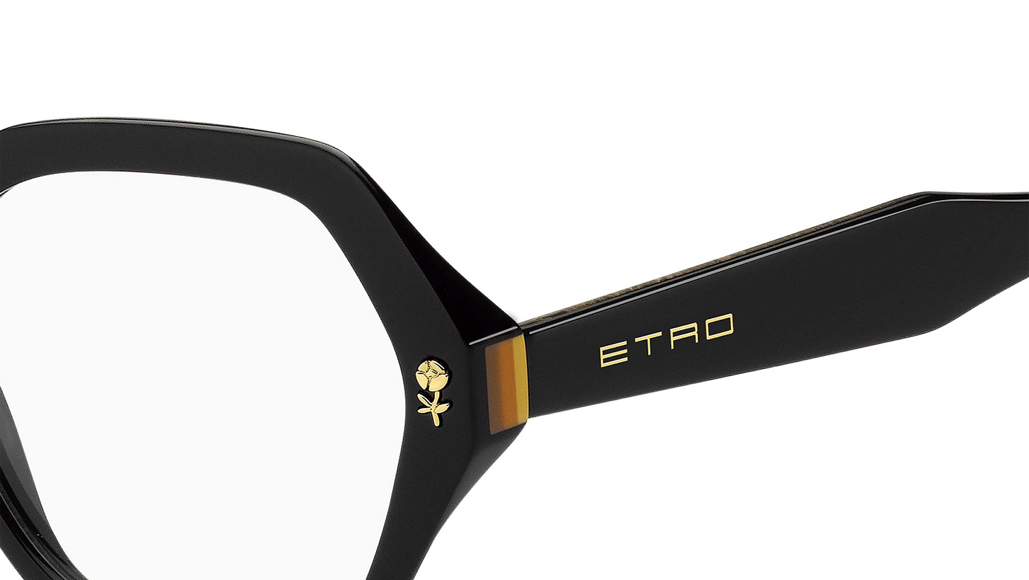 ETRO eyeglasses model 0012 color code 71C black yellow with demo lenses A tribute to the floral motifs and graphic patterns that define ETRO's aesthetic, the "Graphic Elegance" eyewear collection translates the Maison's embroideries and prints into eclectic and refined eyeglasses. The acetate frame with rounded corners is embellished with a flower-shaped metal application and a multicolored striped insert on the sides. The temples are made of transparent acetate with an internal metal core. The innovative design is completed by the iconic acetate tips, inspired by the symmetry of the ETRO logo. Authorized online dealer ETRO Eyewear.