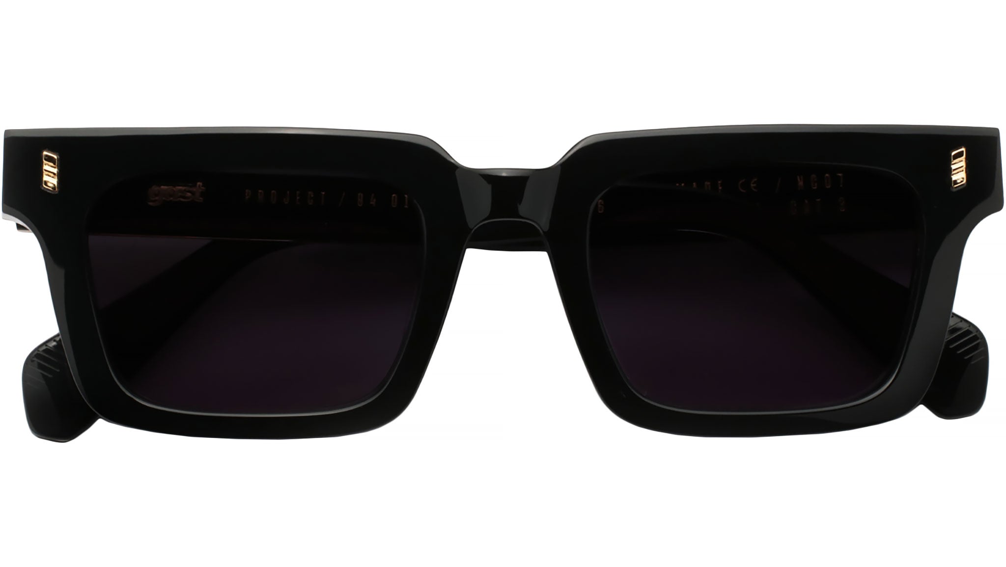 Gast (NOT) COMMON Black Gold. Handmade sunglasses with shiny black acetate frame and gold custom wire core. Black nylon lenses – 100% UVA / UVB protection with anti-reflective inside coating. Five barrels metal hinges and premium silver logo box with hard case and microfiber cleaning cloth.