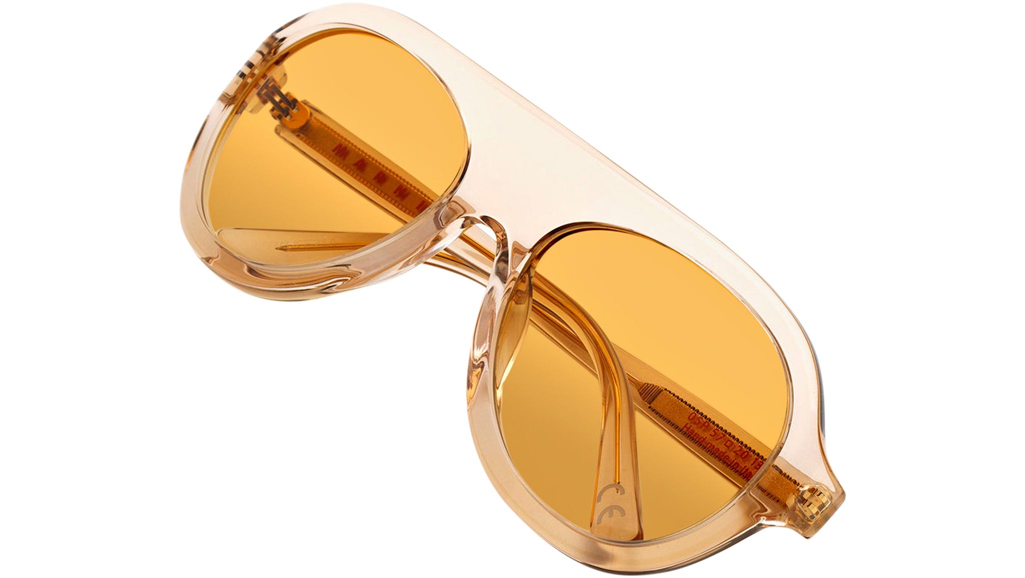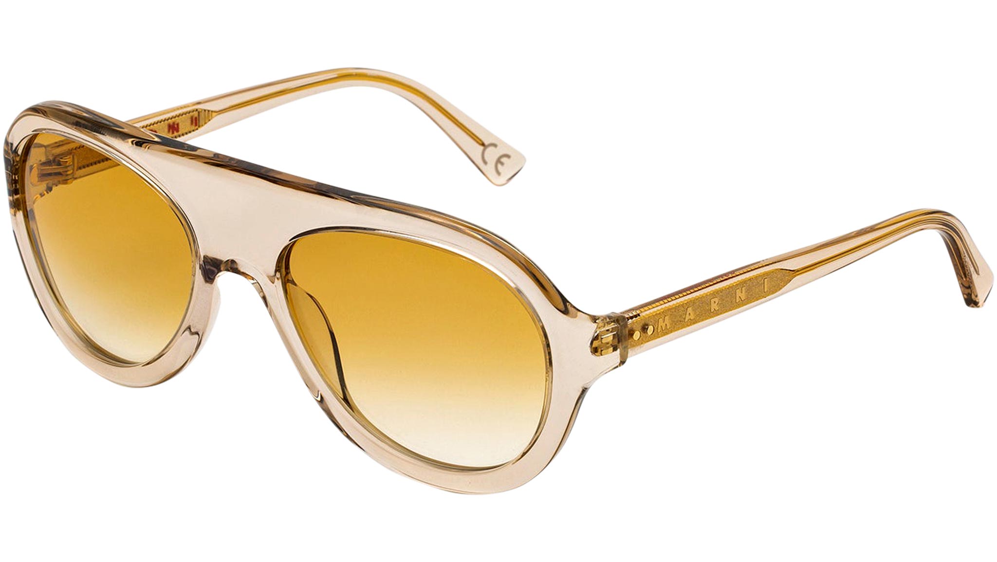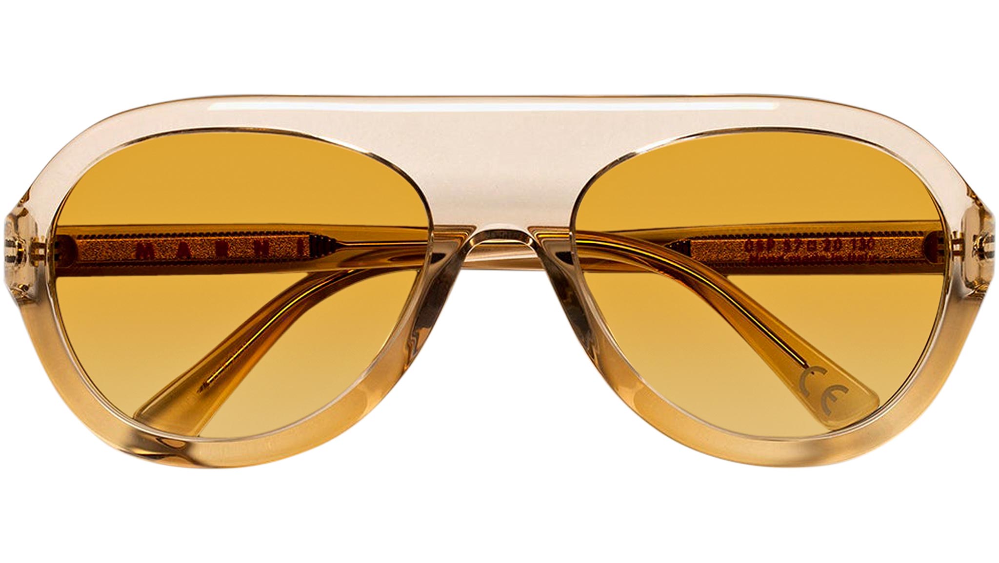 Low bridge fit. Mount Toc is a bold interpretation of classic aviator-style designs. In true Marni fashion, this timeless design was updated with bold geometries and quirky detailing, for an aesthetics that references 1970s sportswear glamour. Its broad structure features a sturdy nose-bridge and pear-shape lenses encased within chunky acetate rims. A unique detail: wrap-around temple design. This model comes in a crystal resin acetate with light tinted lenses. Sizes: R / R Lens Width: Frame Front: Frame Side: Product Code Size R: 05P Product Code Size R: TR9