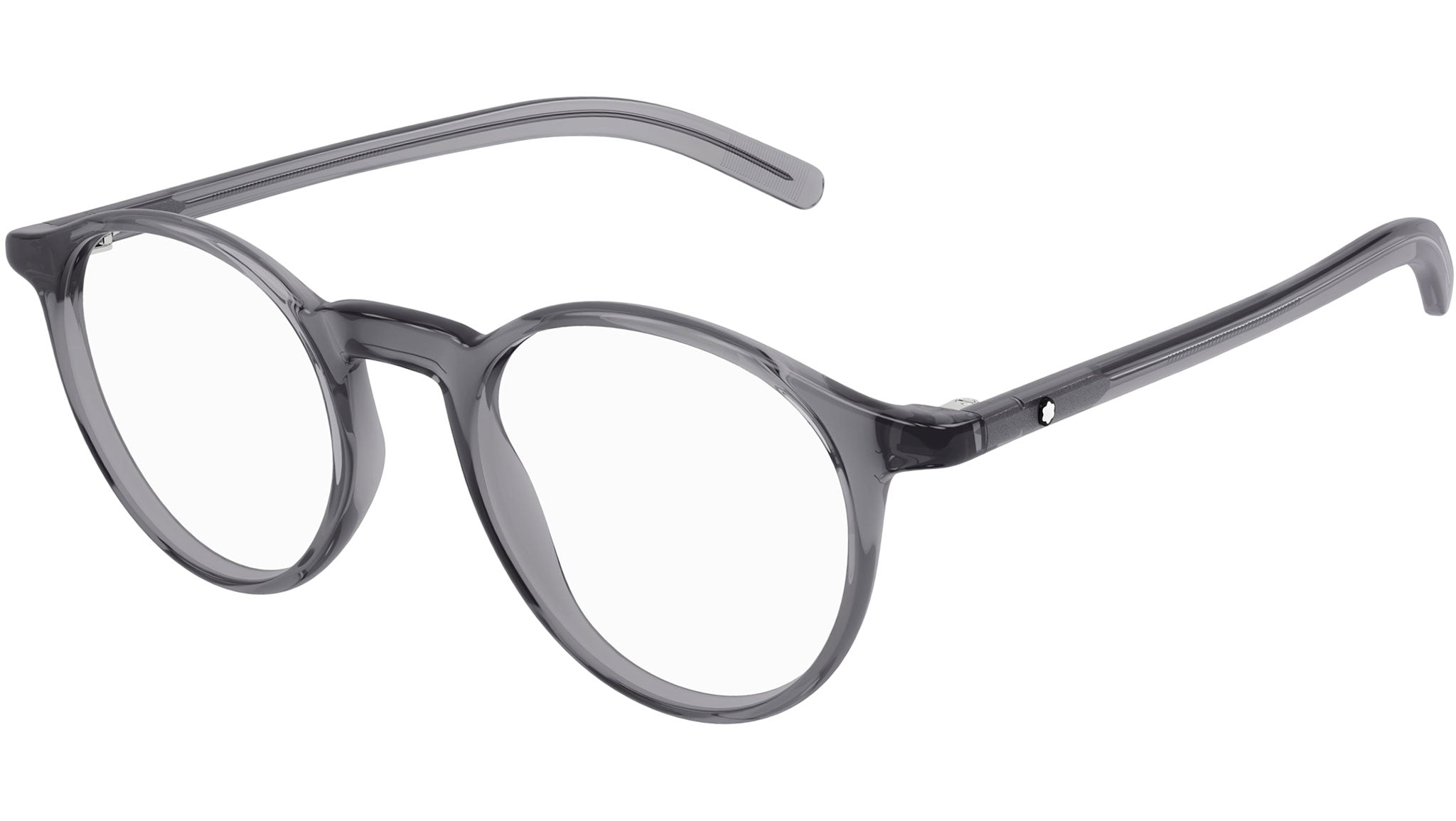 Montblanc eyeglasses model MB0329O Snowcap line, panto shape in recycled injected acetate, shiny transparent grey color with grey temples and demo lenses.