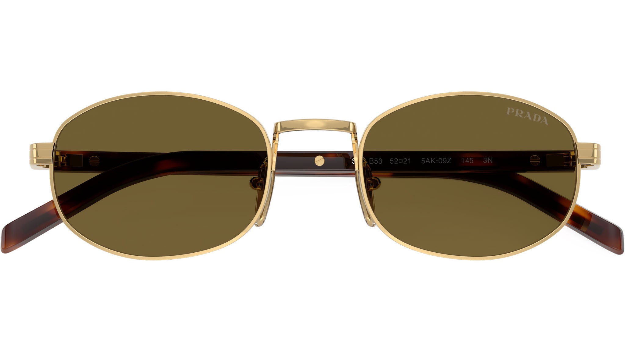 Occhiali da sole Prada PR B53S 5AK09Z donna con montatura ovale in acciaio oro e lenti in bio poliammide color marrone scuro. Naselli regolabili. Linea: Signature. Codice modello: PRB53S. Codice colore: 5AK09Z. Made in Italy. Rivenditore autorizzato Prada online. Gli occhiali vengono consegnati con custodia e accessori originali e sono coperti dalla garanzia ufficiale di 12 mesi del produttore.