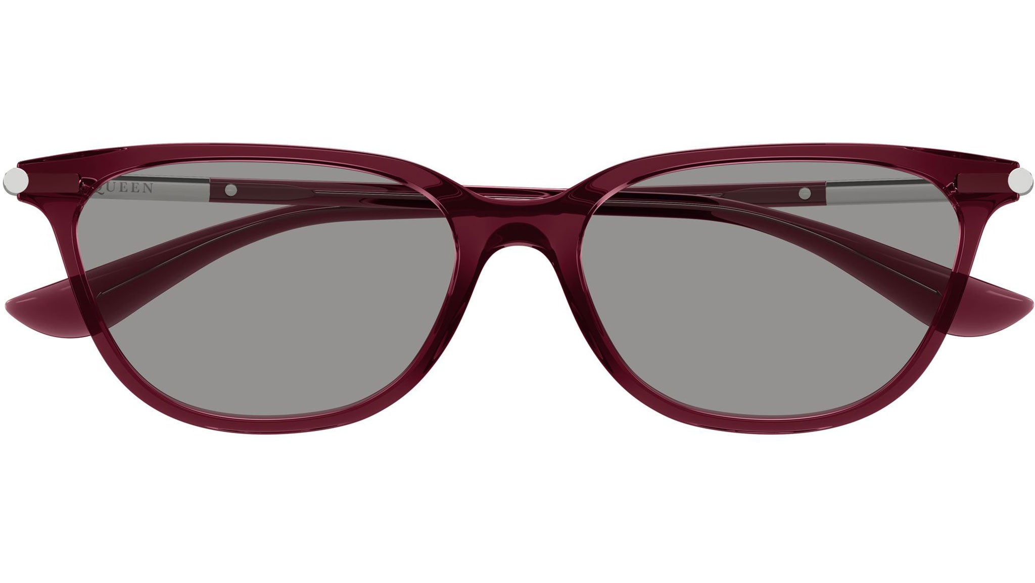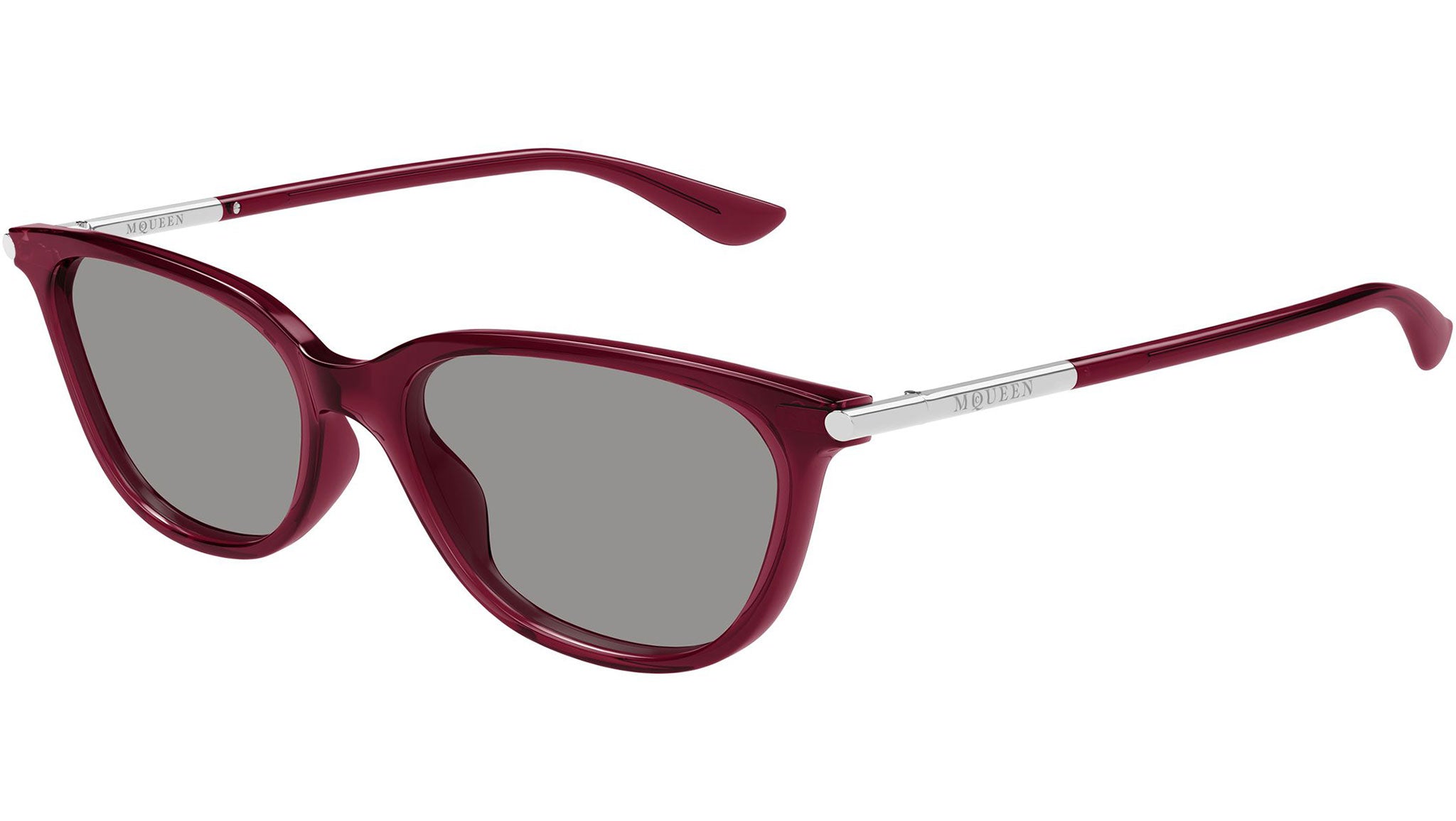 Occhiali da sole Alexander McQueen AM0553S 004 donna con montatura cat eye in acetato riciclato borgogna trasparente lucido e lenti grigio chiaro tinta unita. Linea: T-Bar. Codice modello: AM0553S. Codice colore: 004. Made in Japan. Rivenditore autorizzato Alexander McQueen online. Gli occhiali vengono consegnati con custodia e accessori originali e sono coperti dalla garanzia ufficiale di 12 mesi del produttore.