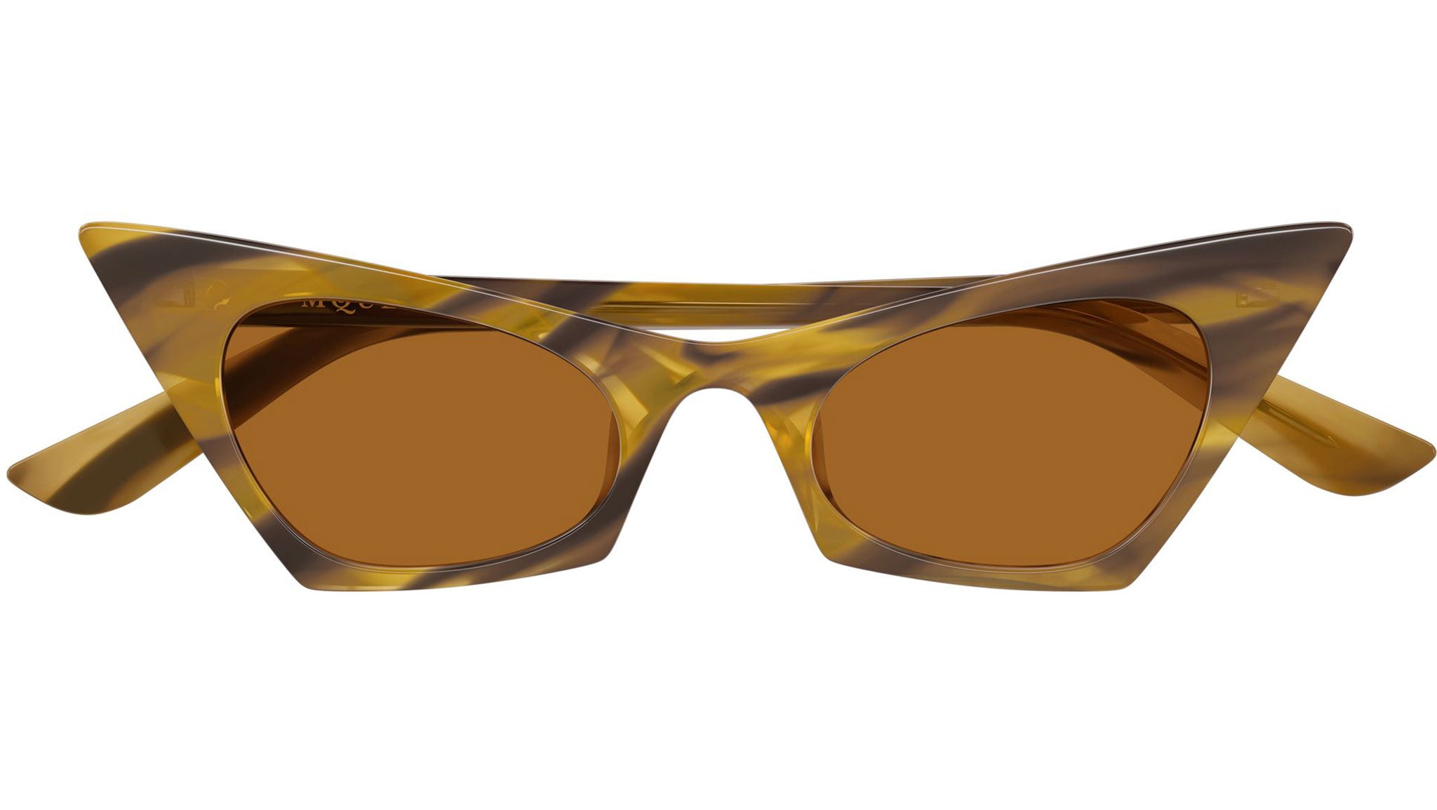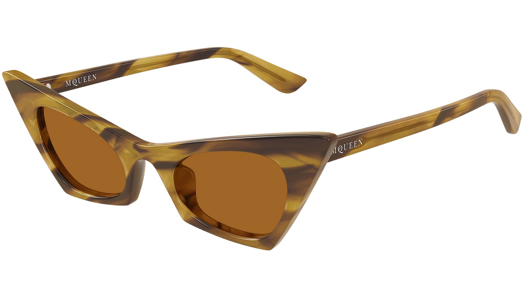 Occhiali da sole Alexander McQueen AM0557S 003 donna con montatura cat eye in acetato riciclato avana giallo rigato lucido e lenti marrone ruggine. Linea: Logo. Codice modello: AM0557S. Codice colore: 003. Made in Italy. Rivenditore autorizzato Alexander McQueen online. Gli occhiali vengono consegnati con custodia e accessori originali e sono coperti dalla garanzia ufficiale di 12 mesi del produttore.