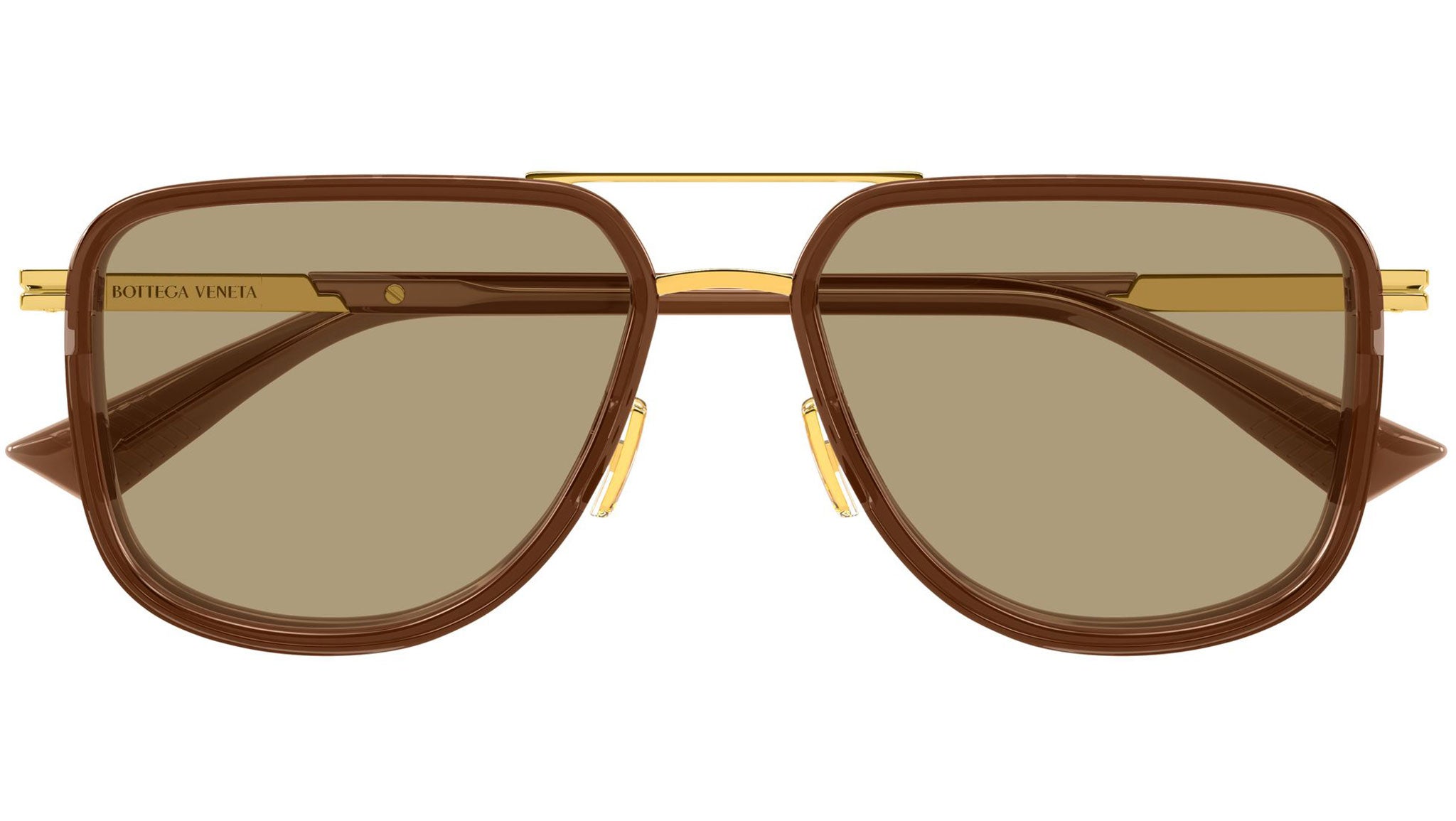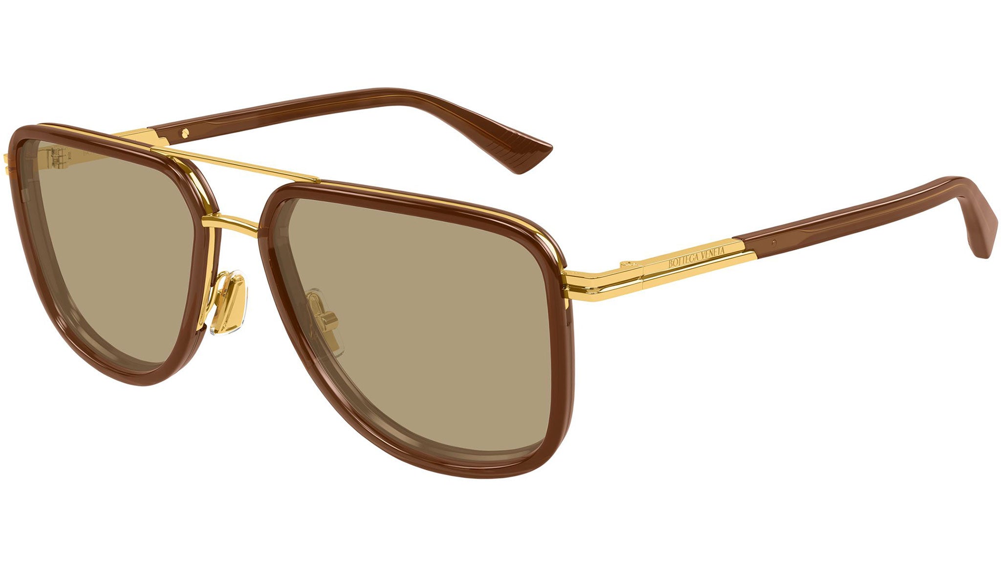 Occhiali da sole Bottega Veneta BV1463S 003 uomo con montatura aviatore in metallo oro lucido con cerchi marrone trasparente lucidi e lenti marrone tinta unita. Linea: Ribbon. Codice modello: BV1463S. Codice colore: 003. Made in Italy. Rivenditore autorizzato Bottega Veneta online. Gli occhiali vengono consegnati con custodia e accessori originali e sono coperti dalla garanzia ufficiale di 12 mesi del produttore.