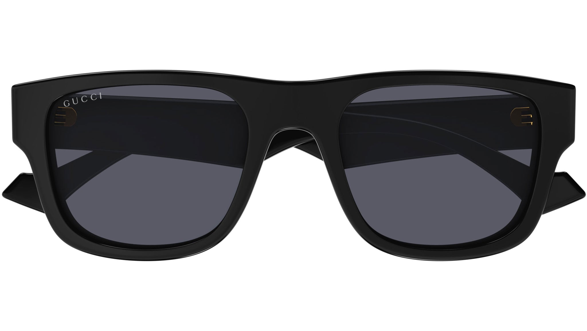 Gucci sunglasses Lettering line model GG1427S 001 in solid glossy black recycled acetate with black temples and solid grey lenses.