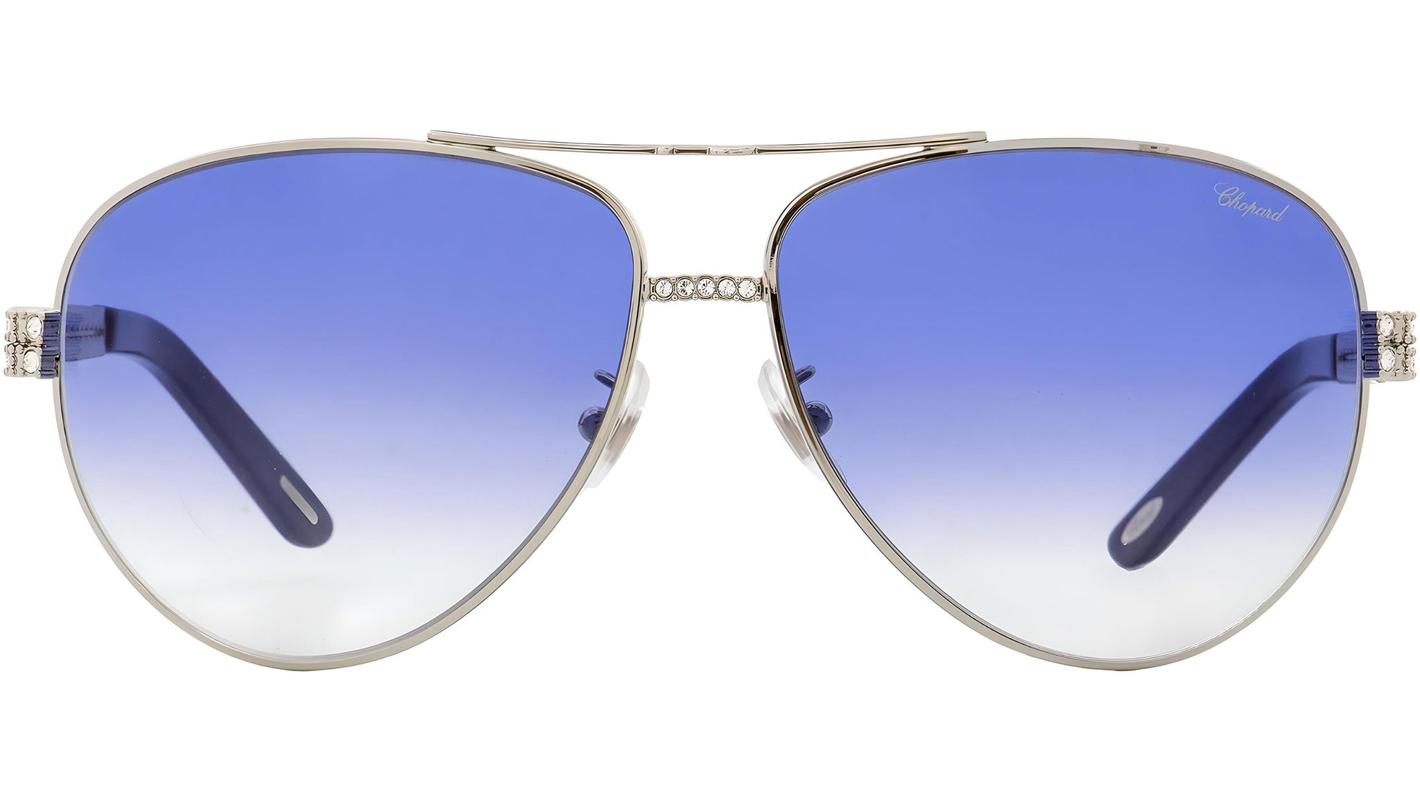 Occhiali da sole Chopard SCHB24S 0E70 con montatura aviator da donna in metallo color palladio e lenti color blu sfumato. Rivenditore autorizzato Chopard online. Ogni prodotto Chopard viene consegnato con astuccio originale e accessori ed è coperto da garanzia del produttore di 12 mesi.