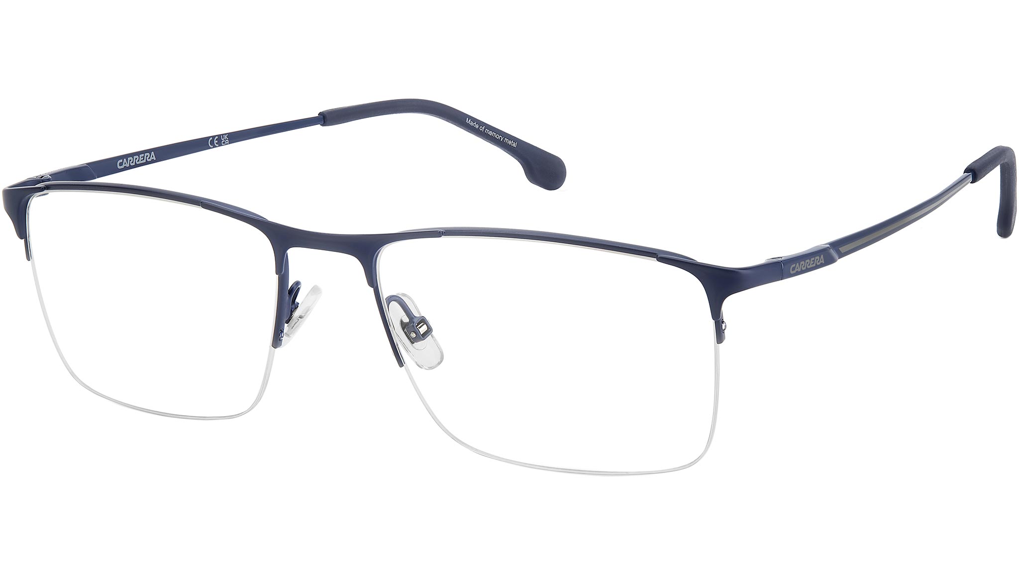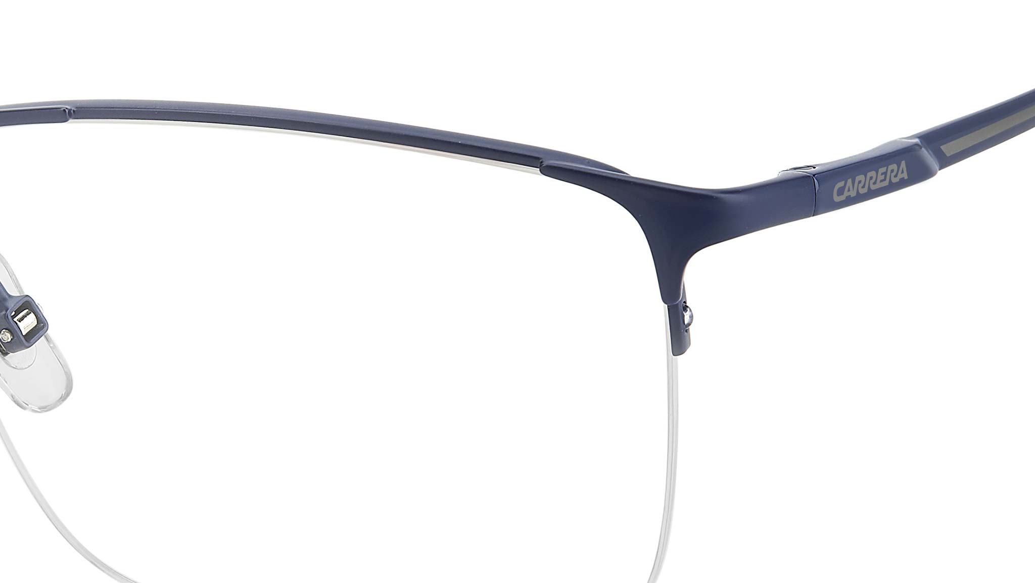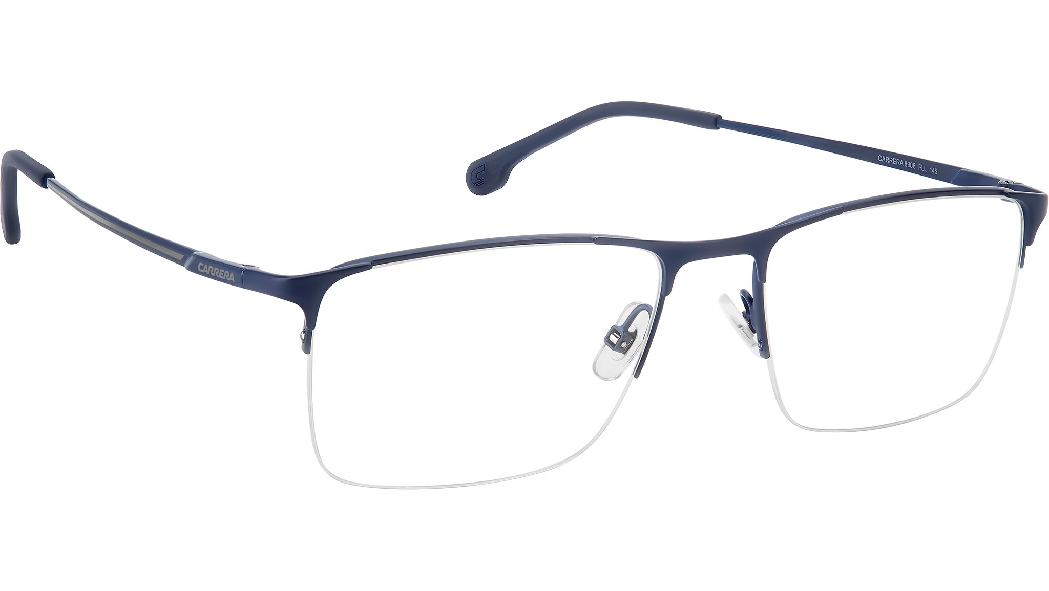 Carrera eyeglasses model 8906 color FLL matte blue. Carrera coolness shines through even in the most technical and practical models, like these rectangular-shaped eyeglasses. The lenses are supported by a stainless steel frame and a thin nylor thread, also in a two-tone version. The bridge and temples are in Memory Metal, an innovative metal alloy that returns to its original shape even when bent. Available in two sizes.