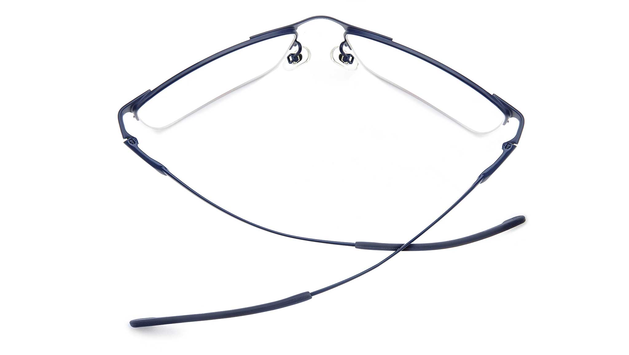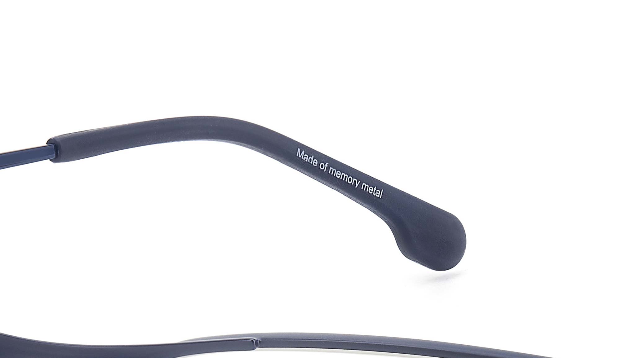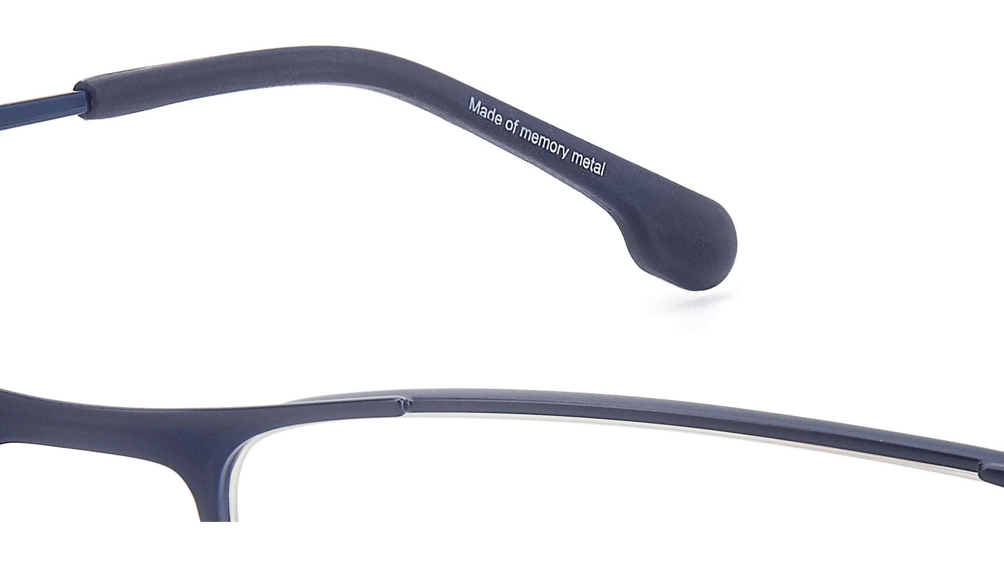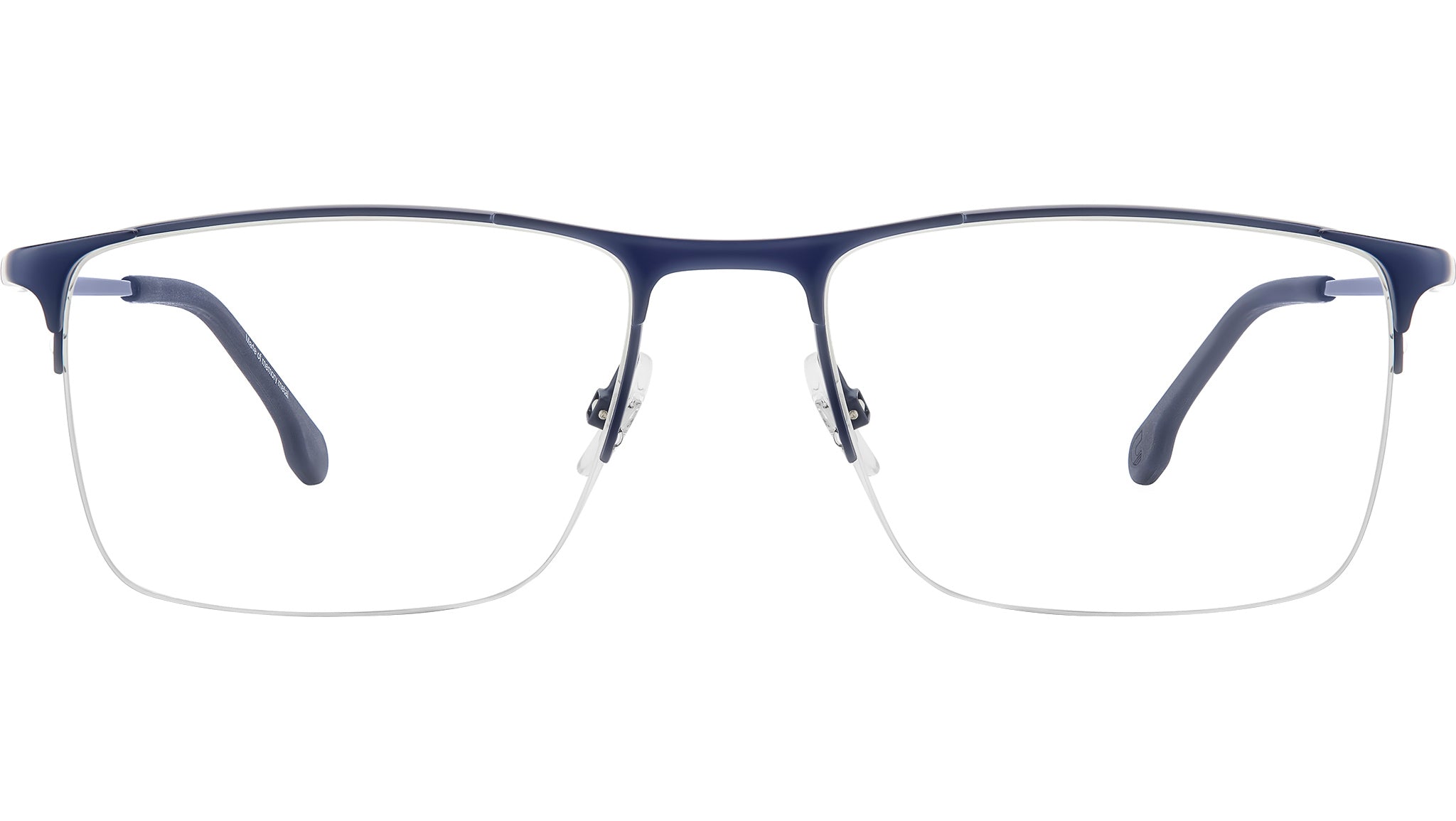 Carrera eyeglasses model 8906 color FLL matte blue. Carrera coolness shines through even in the most technical and practical models, like these rectangular-shaped eyeglasses. The lenses are supported by a stainless steel frame and a thin nylor thread, also in a two-tone version. The bridge and temples are in Memory Metal, an innovative metal alloy that returns to its original shape even when bent. Available in two sizes.