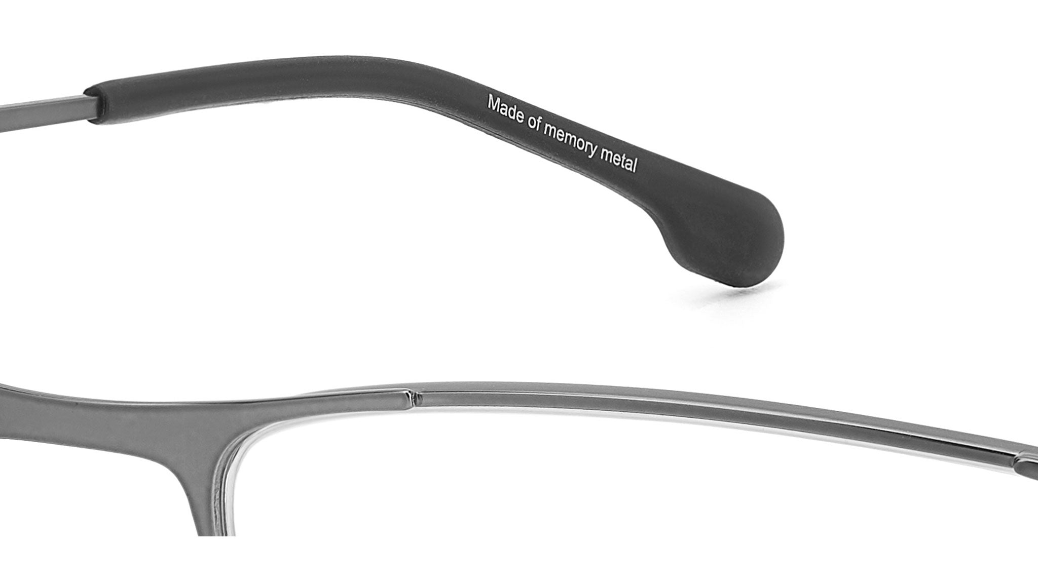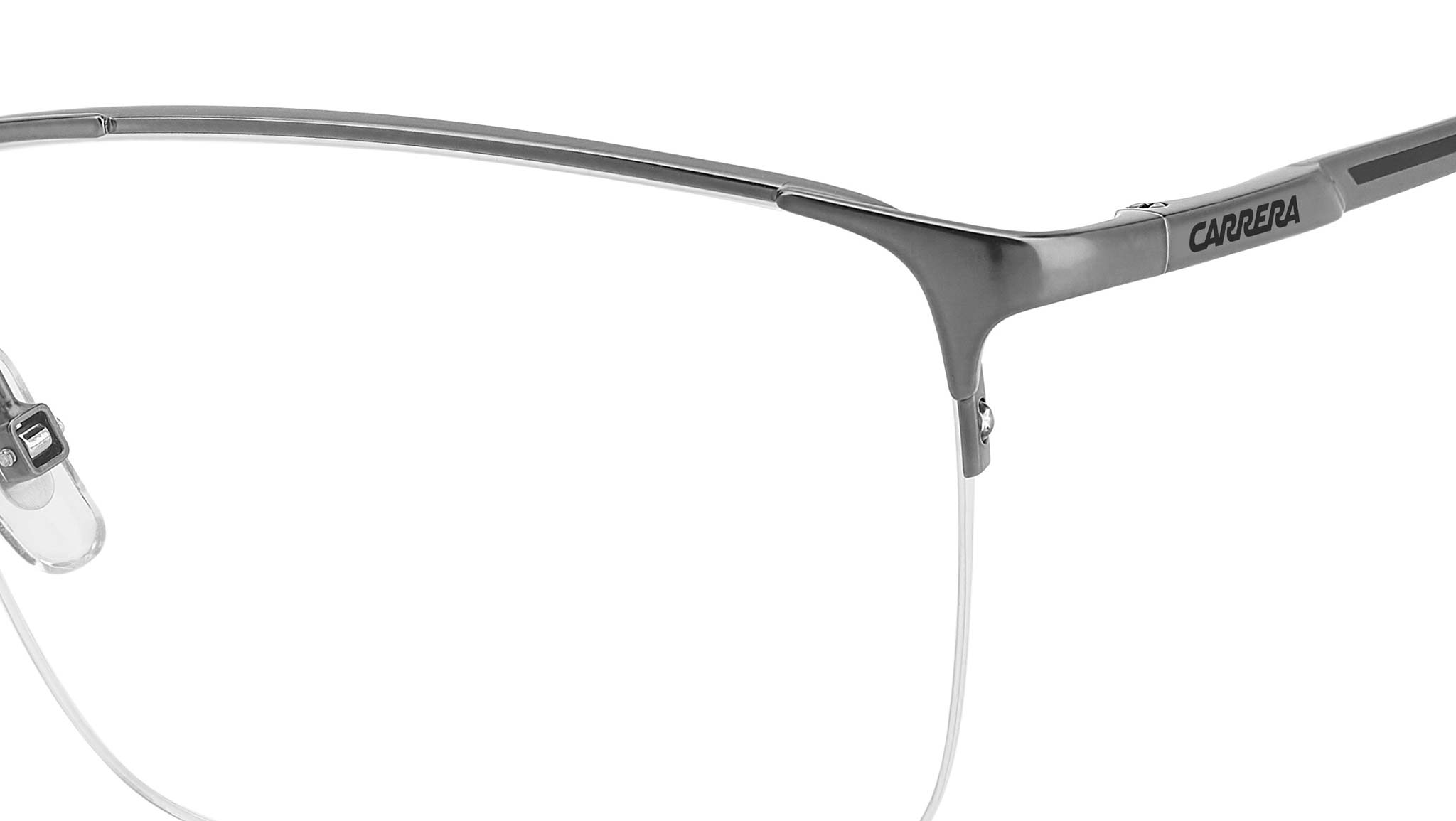 Carrera eyeglasses model 8906 color R80 matte dark ruthenium. Carrera coolness shines through even in the most technical and practical models, like these rectangular-shaped eyeglasses. The lenses are supported by a stainless steel frame and a thin nylor thread, also in a two-tone version. The bridge and temples are in Memory Metal, an innovative metal alloy that returns to its original shape even when bent. Available in two sizes.