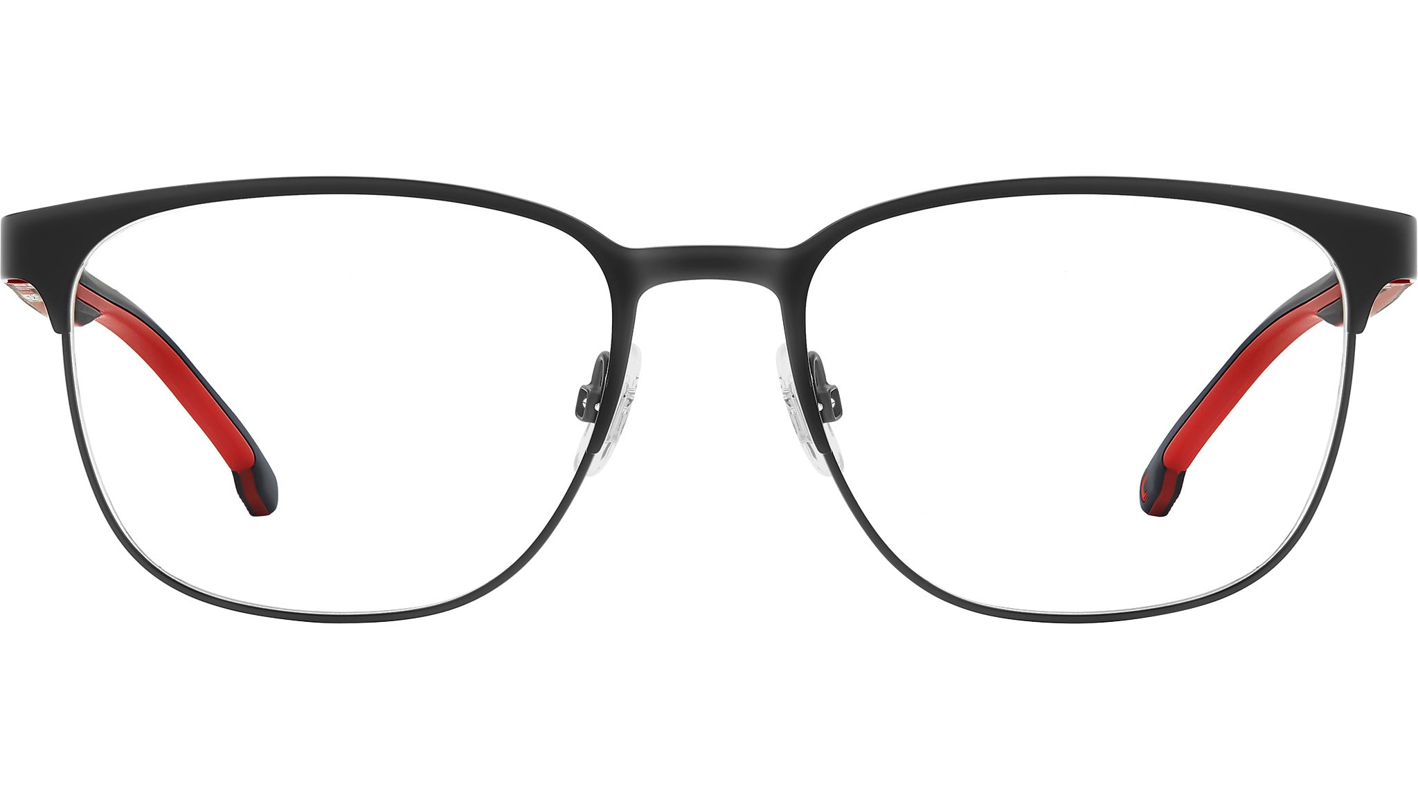 Occhiali da vista Carrera 8917 BLX uomo con montatura rettangolare in metallo nero opaco rosso e lenti demo. Occhiali da vista Carrera di ispirazione activewear, perfetti per sentirsi sempre on the move. Cosa li rende speciali? Sicuramente le aste bi-iniettate dalla superficie texturizzata, con logo Carrera in rilievo e inserti gommati. Da scegliere in versione monocromatica, per un look più minimale, oppure con colore a contrasto per una nota decisa. Il frontale è in acciaio inossidabile, con naselli da regolare sul naso assecondando la propria fisionomia. Linea: Sport. Codice modello: 109494. Codice colore: BLX. Rivenditore autorizzato Carrera online. Gli occhiali vengono consegnati con custodia e accessori originali e sono coperti dalla garanzia ufficiale di 12 mesi del produttore.