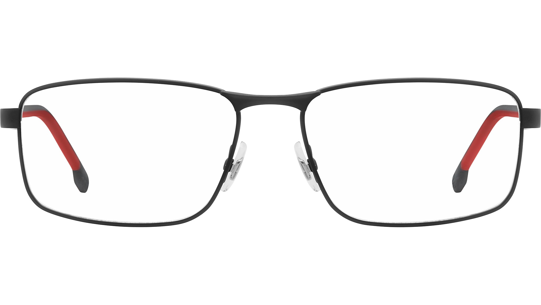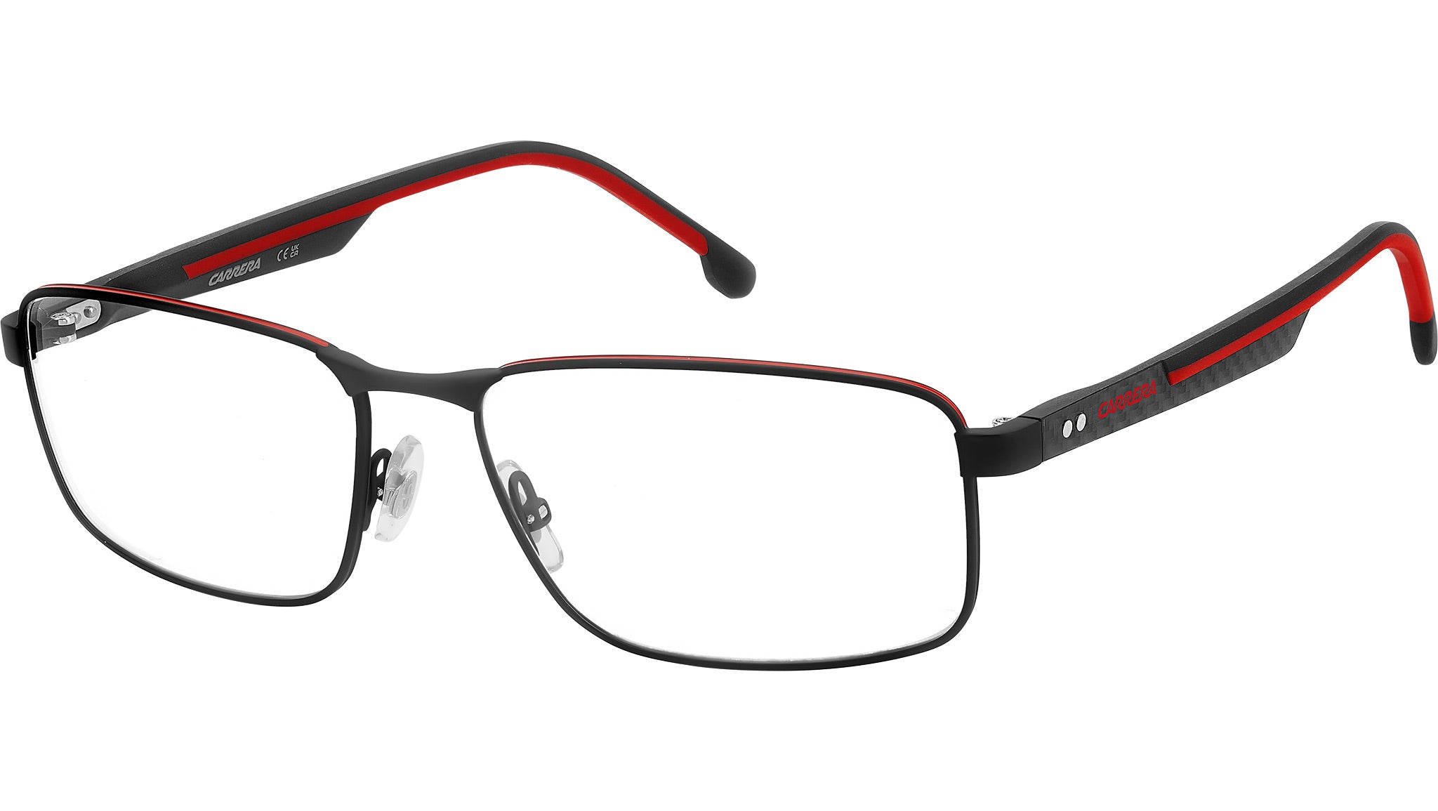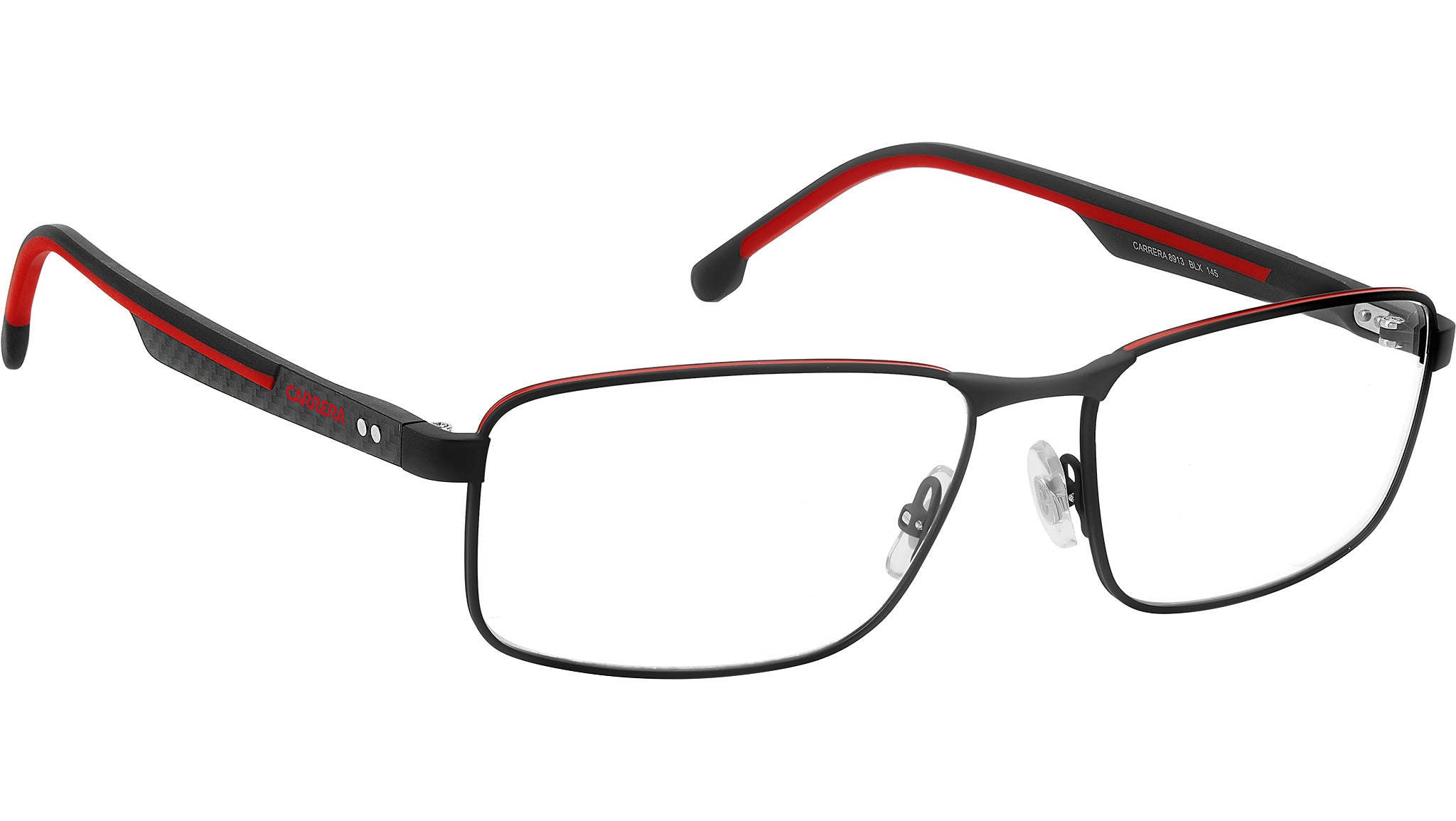 Occhiali da vista Carrera 8913 BLX uomo con montatura rettangolare in metallo nero opaco rosso e lenti demo. Carrera sceglie la fibra di carbonio per un occhiale da vista di qualità premium. Applica questo materiale leggero e resistente alle aste silm con design texturizzato. Aumentano il comfort i terminali gommati, con colorazione a contrasto oppure tono su tono. Lo sguardo è fisso sul traguardo dei propri obbietti, vestito dal frontale rettangolare in leggero acciaio inossidabile con naselli regolabili. Per uno stile concreto, senza fronzoli né distrazioni. Linea: Sport. Codice modello: 109526. Codice colore: BLX. Rivenditore autorizzato Carrera online. Gli occhiali vengono consegnati con custodia e accessori originali e sono coperti dalla garanzia ufficiale di 12 mesi del produttore.