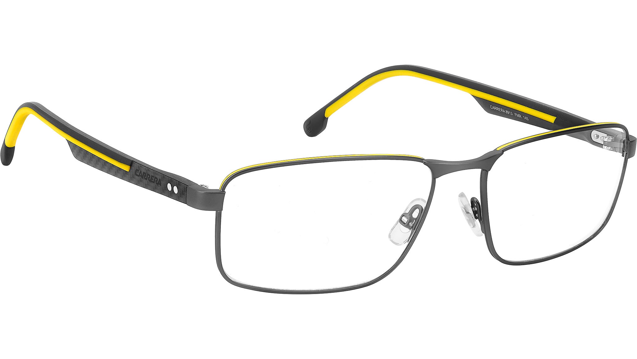 Occhiali da vista Carrera 8913 FMR uomo con montatura rettangolare in metallo giallo rutenio scuro opaco e lenti demo. Carrera sceglie la fibra di carbonio per un occhiale da vista di qualità premium. Applica questo materiale leggero e resistente alle aste silm con design texturizzato. Aumentano il comfort i terminali gommati, con colorazione a contrasto oppure tono su tono. Lo sguardo è fisso sul traguardo dei propri obbietti, vestito dal frontale rettangolare in leggero acciaio inossidabile con naselli regolabili. Per uno stile concreto, senza fronzoli né distrazioni. Linea: Sport. Codice modello: 109526. Codice colore: FMR. Rivenditore autorizzato Carrera online. Gli occhiali vengono consegnati con custodia e accessori originali e sono coperti dalla garanzia ufficiale di 12 mesi del produttore.