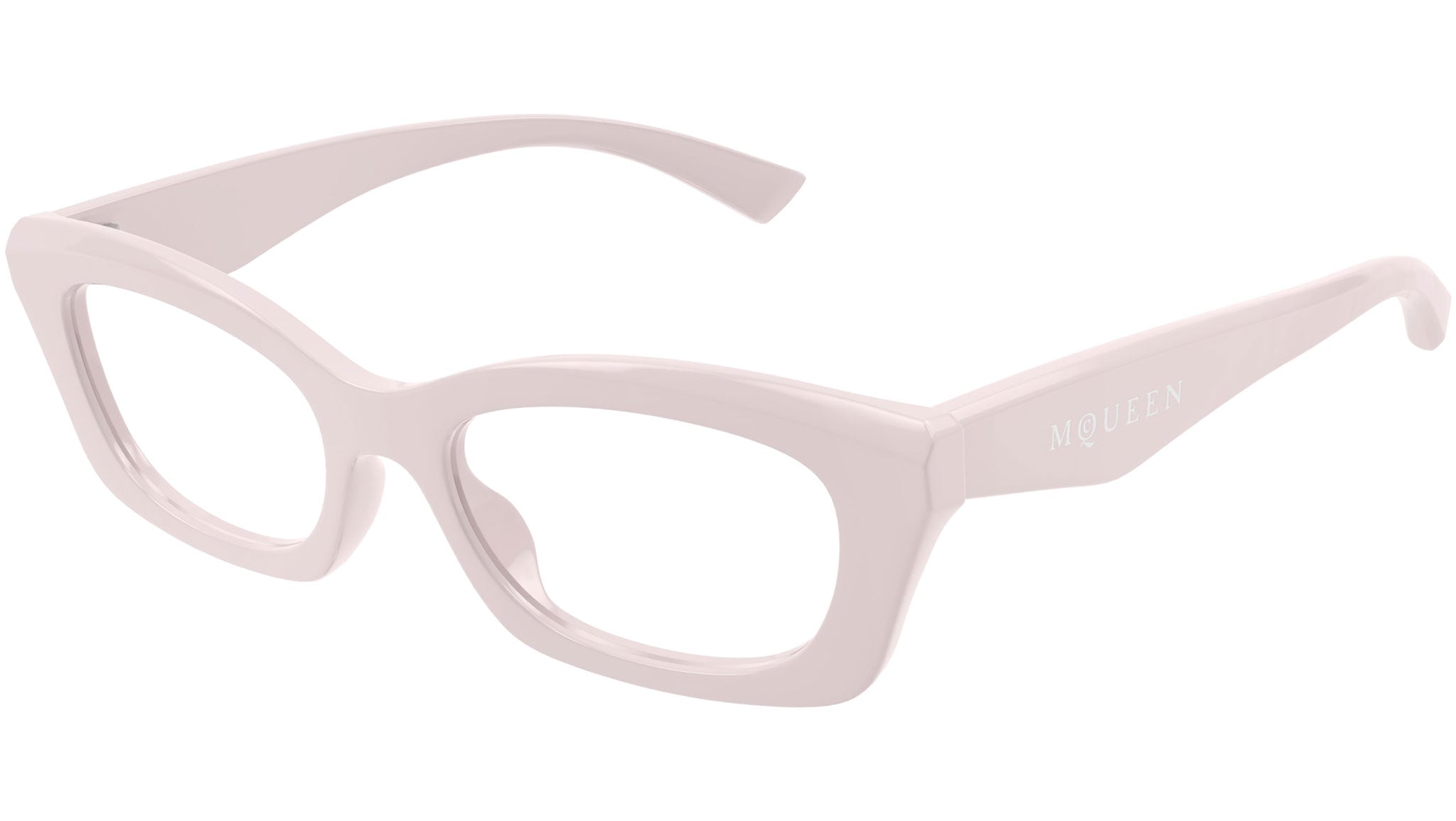 Alexander McQueen Casual Lines AM0474O eyeglasses in rectangular recycled acetate color code 005 solid pink shiny with pink temples and demo lenses. Authorized Alexander McQueen online dealer. The glasses are delivered with original case and accessories and are covered by the official 12-month manufacturer's warranty.