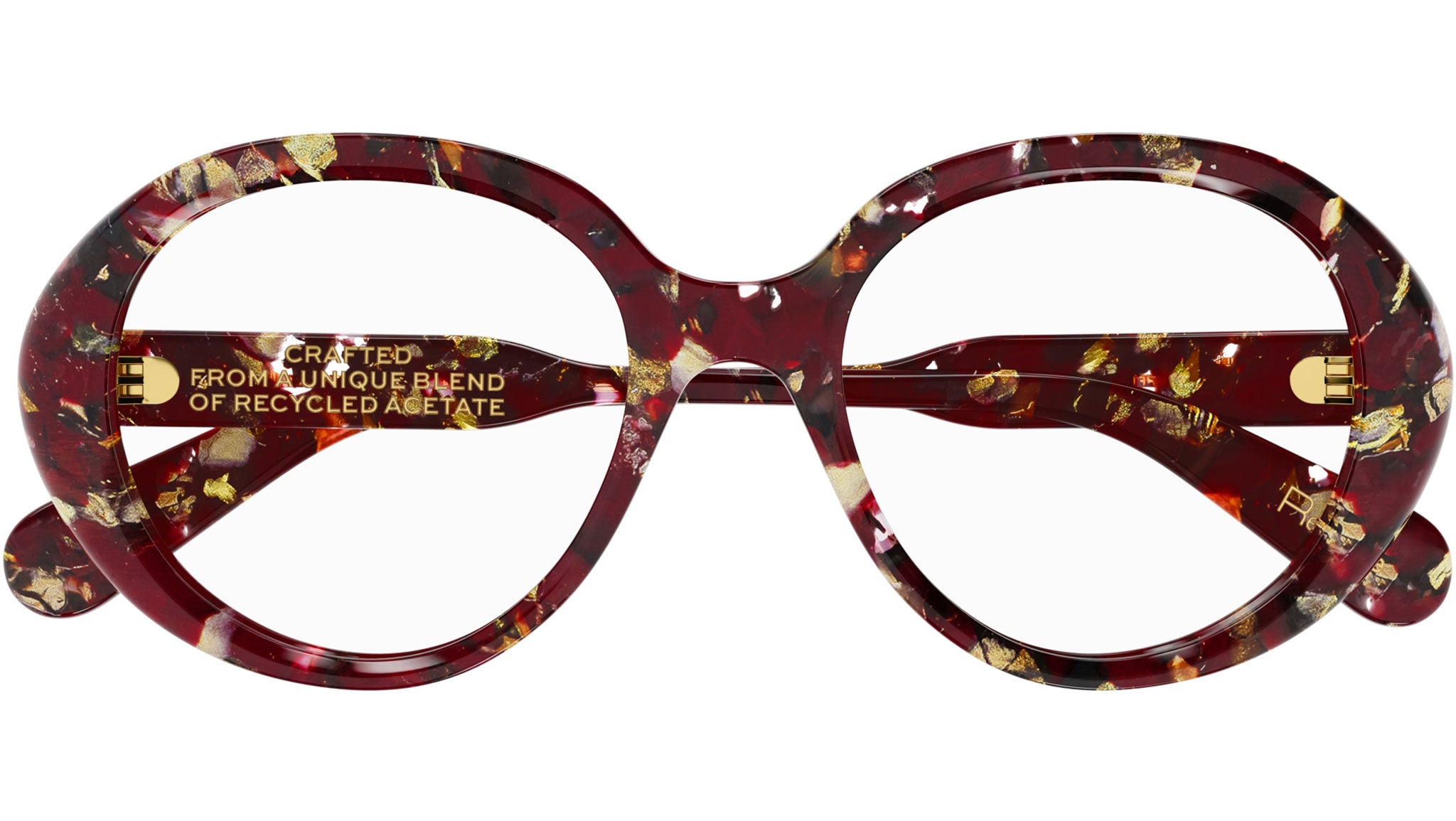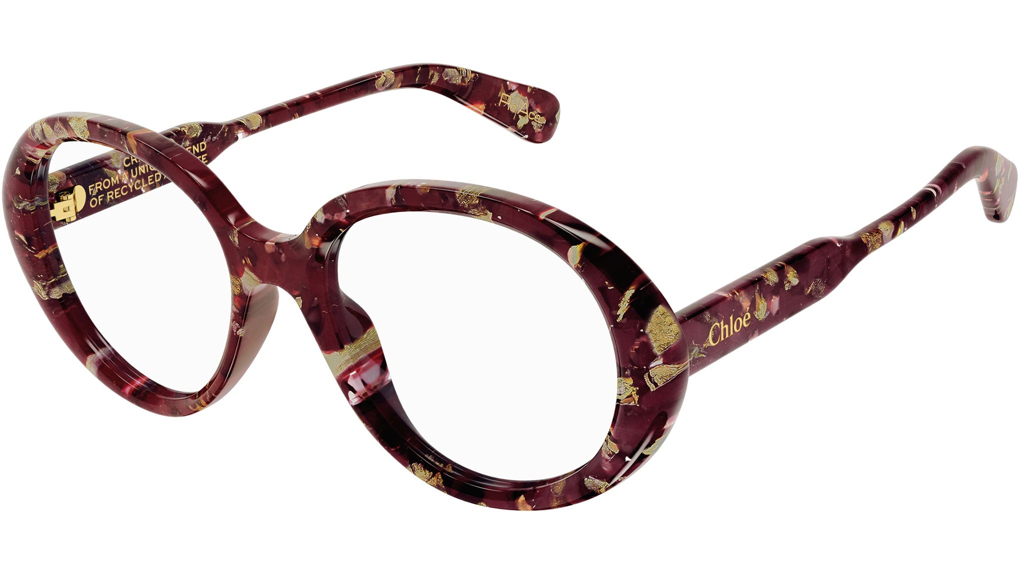 Chloé eyeglasses model CH0221O Eyewear line, panto shape in recycled acetate, color code 004 garnet red with tortoiseshell temples and demo lenses.