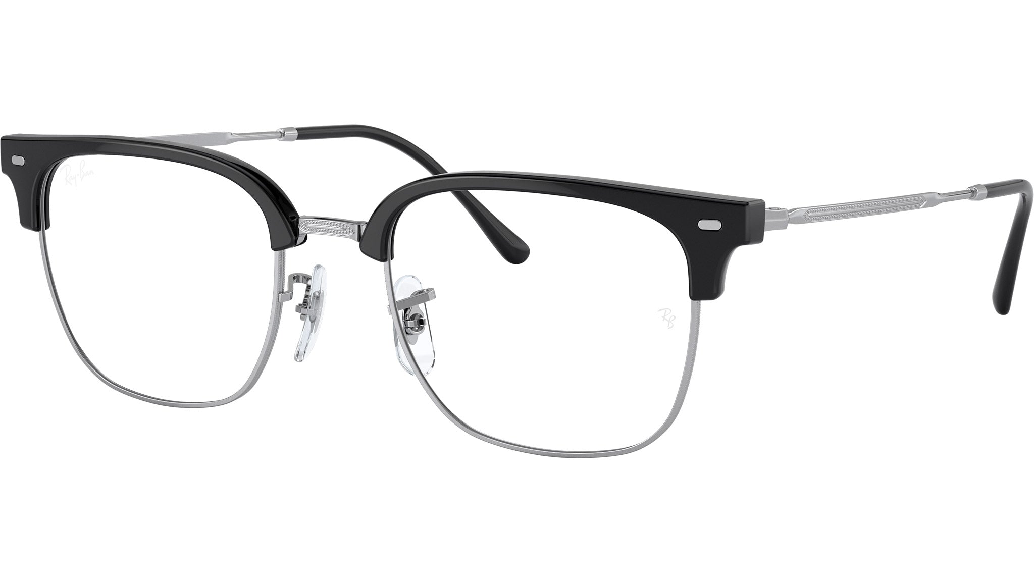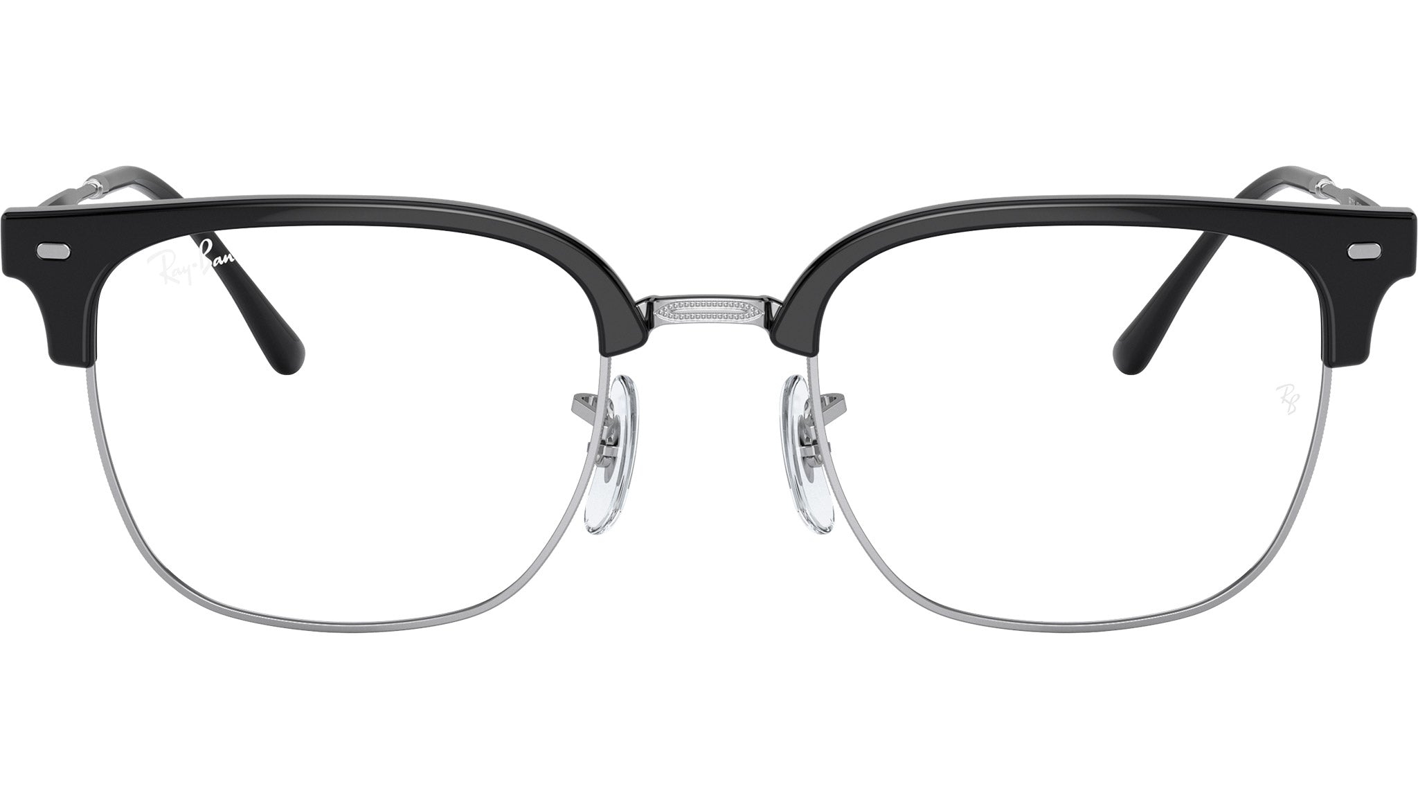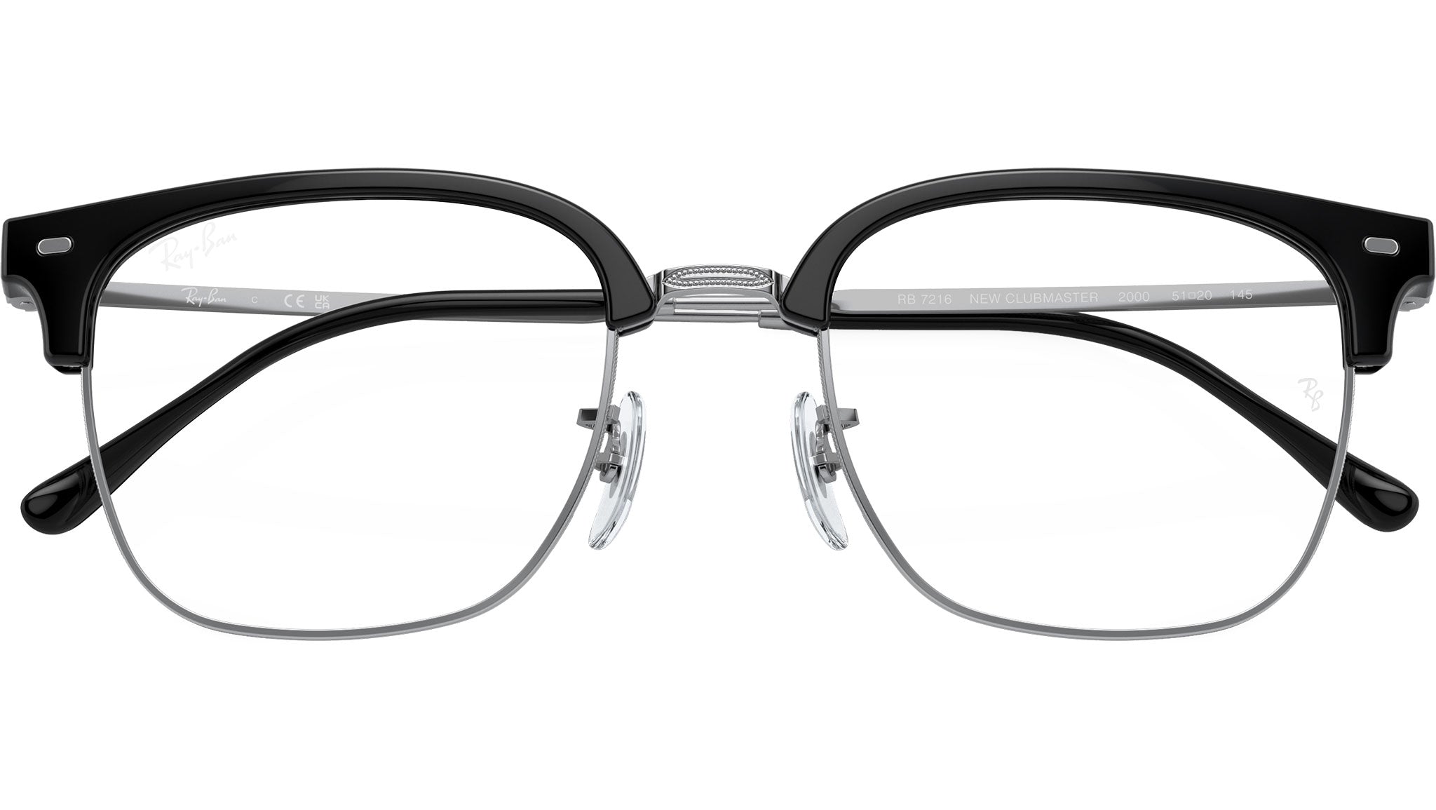 Occhiali da vista Ray-Ban New Clubmaster RB7216 2000 unisex con montatura squadrata in propionato nero su argento e lenti demo. Naselli regolabili. Linea: Evolution. Codice modello: 0RX7216. Codice colore: 2000. Rivenditore autorizzato Ray-Ban online. Gli occhiali vengono consegnati con custodia e accessori originali e sono coperti dalla garanzia ufficiale di 12 mesi del produttore.