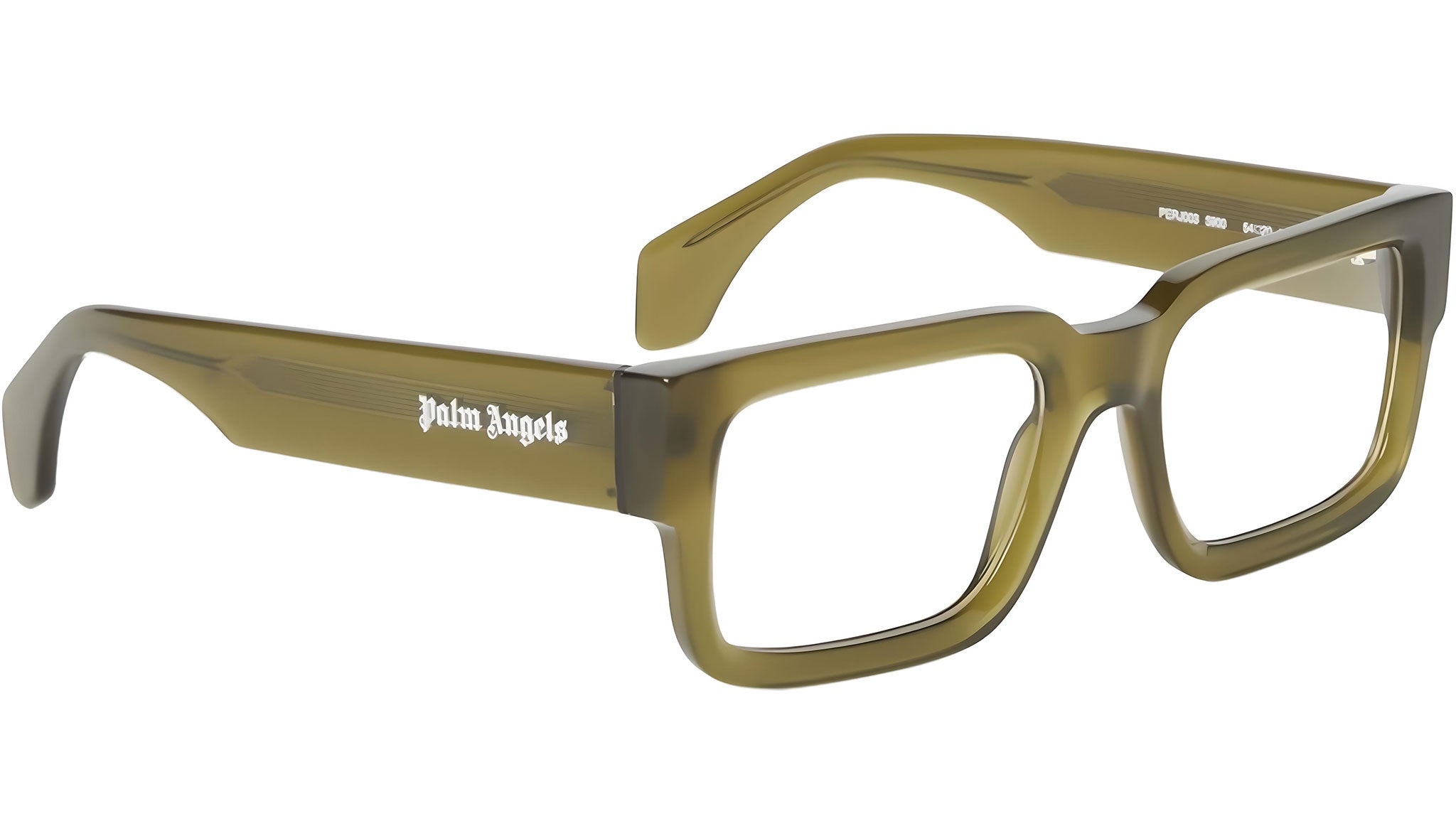 Palm Angels Style 3 eyeglasses, color code 5900, with transparent green acetate front and demo lenses with blue block filter. Authorized Palm Angels Eyewear online dealer. The glasses are delivered with original case and accessories and are covered by the official 12-month manufacturer's warranty.