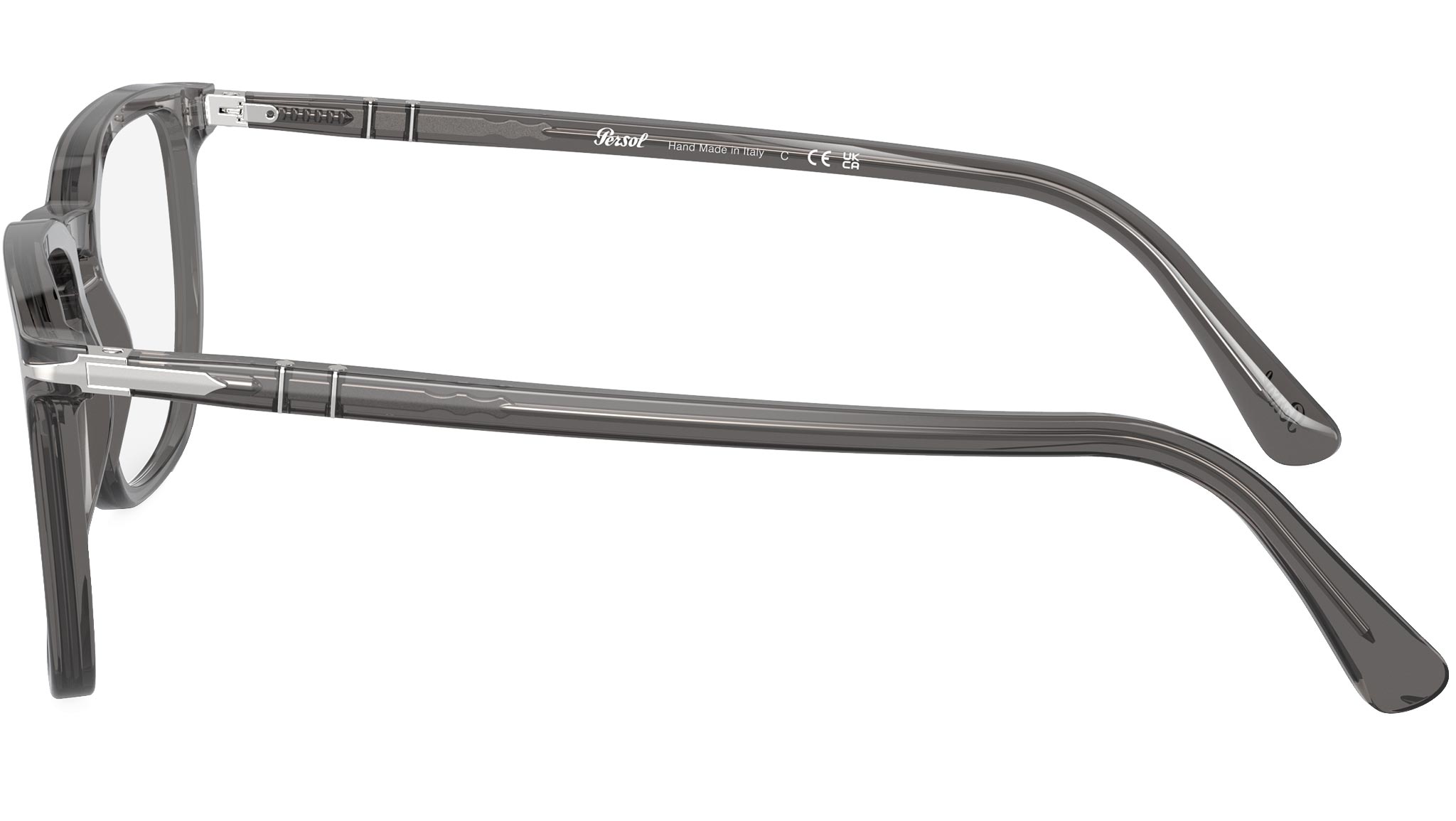 Persol PO3339V color code 1196 transparent grey acetate optical frame with demo lenses. Persol harmoniously blends aesthetics and technology. It pays meticulous attention to every detail, combining distinctive style with practical solutions. Driven by an unwavering passion for perfecting craftsmanship and a relentless pursuit of innovation, Persol embodies true Italian quality. Its evocative name means 'for the sun', a living testament to the rich heritage of superior craftsmanship and excellence at the pinnacle of Italian artisanal manufacturing. Renowned for its timeless design and artistry in creating unique eyewear, the brand has become a favorite choice in the film industry.