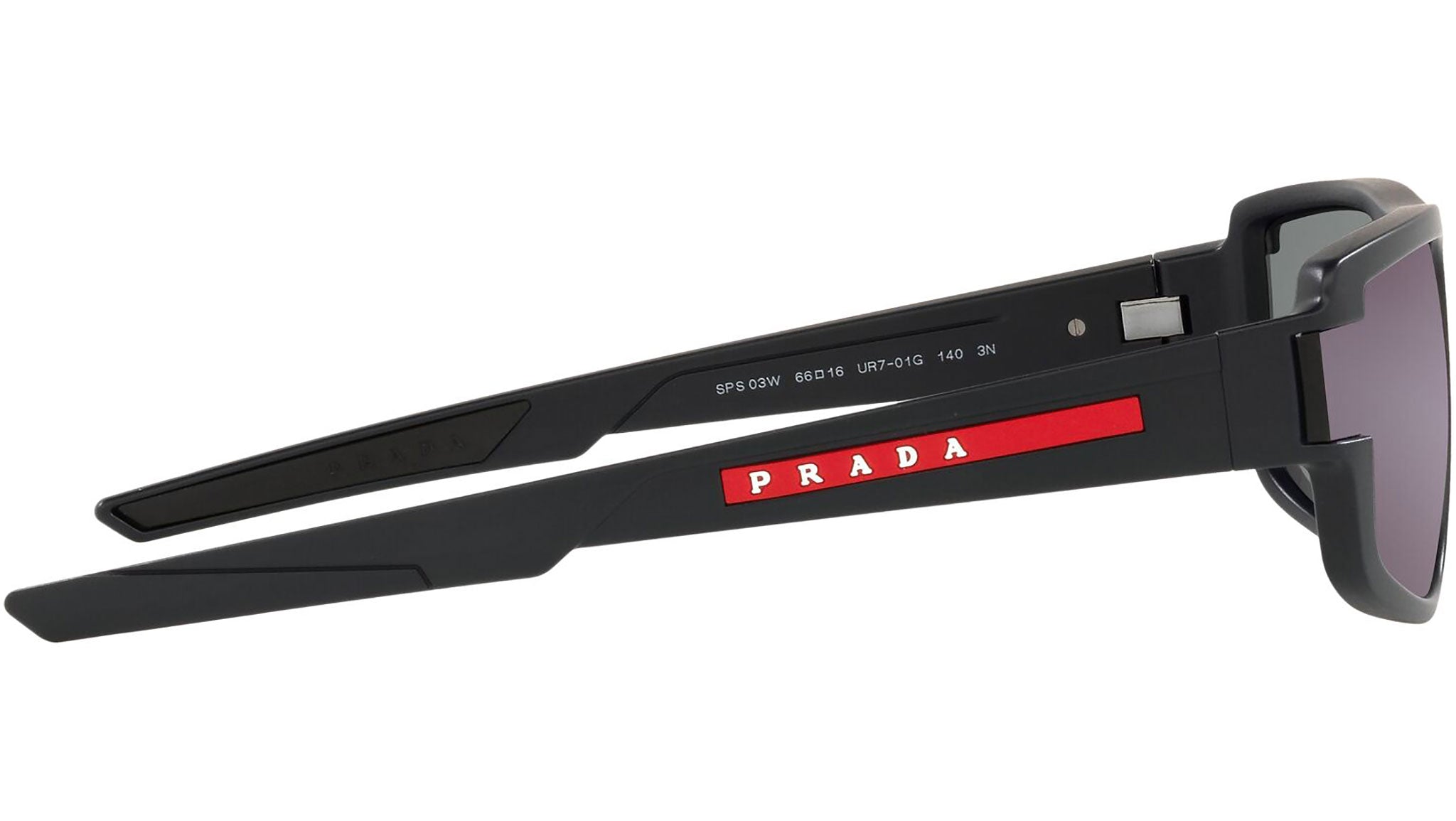 Prada Linea Rossa sunglasses model PS 03WS in the color variant UR701G rubber blue with dark gray anti-reflective lenses. A perfect fusion of the concepts of sportswear and contemporary elegance: the Prada Linea Rossa sunglasses line expresses all the quality and artisanal refinement of the Prada fashion house in a modern casual style.
