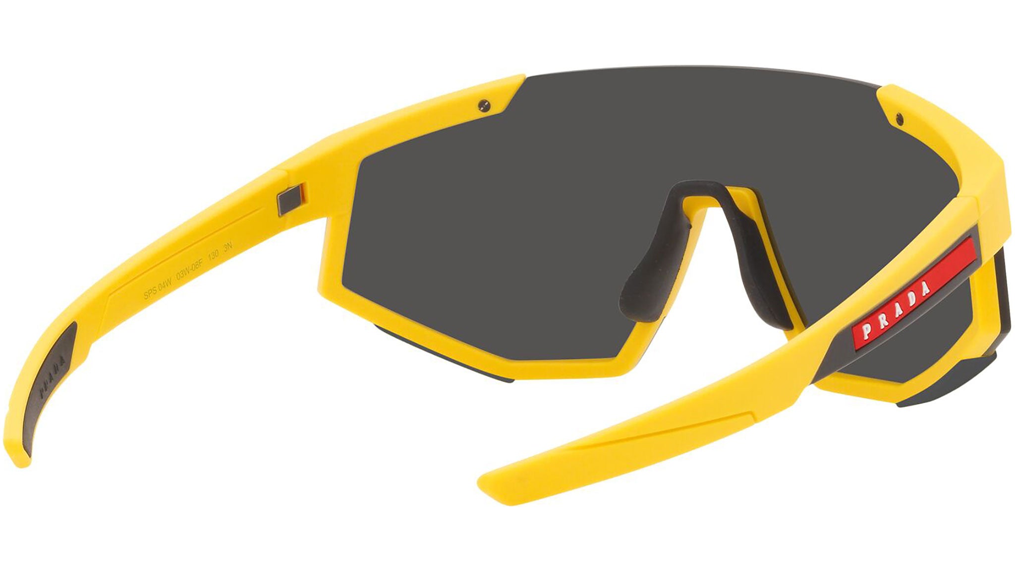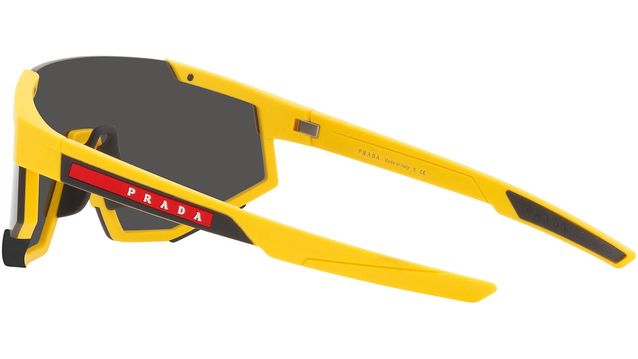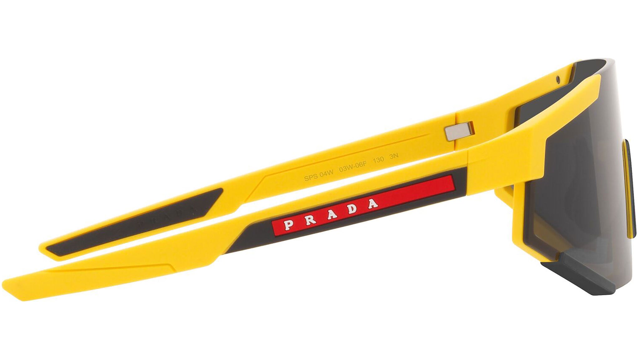 Prada Linea Rossa sunglasses model PS 04WS in the color variant 03W06F rubber yellow with dark gray lenses. A perfect fusion of the concepts of sportswear and contemporary elegance: the Prada Linea Rossa sunglasses line expresses all the quality and artisanal refinement of the Prada fashion house in a modern casual style.