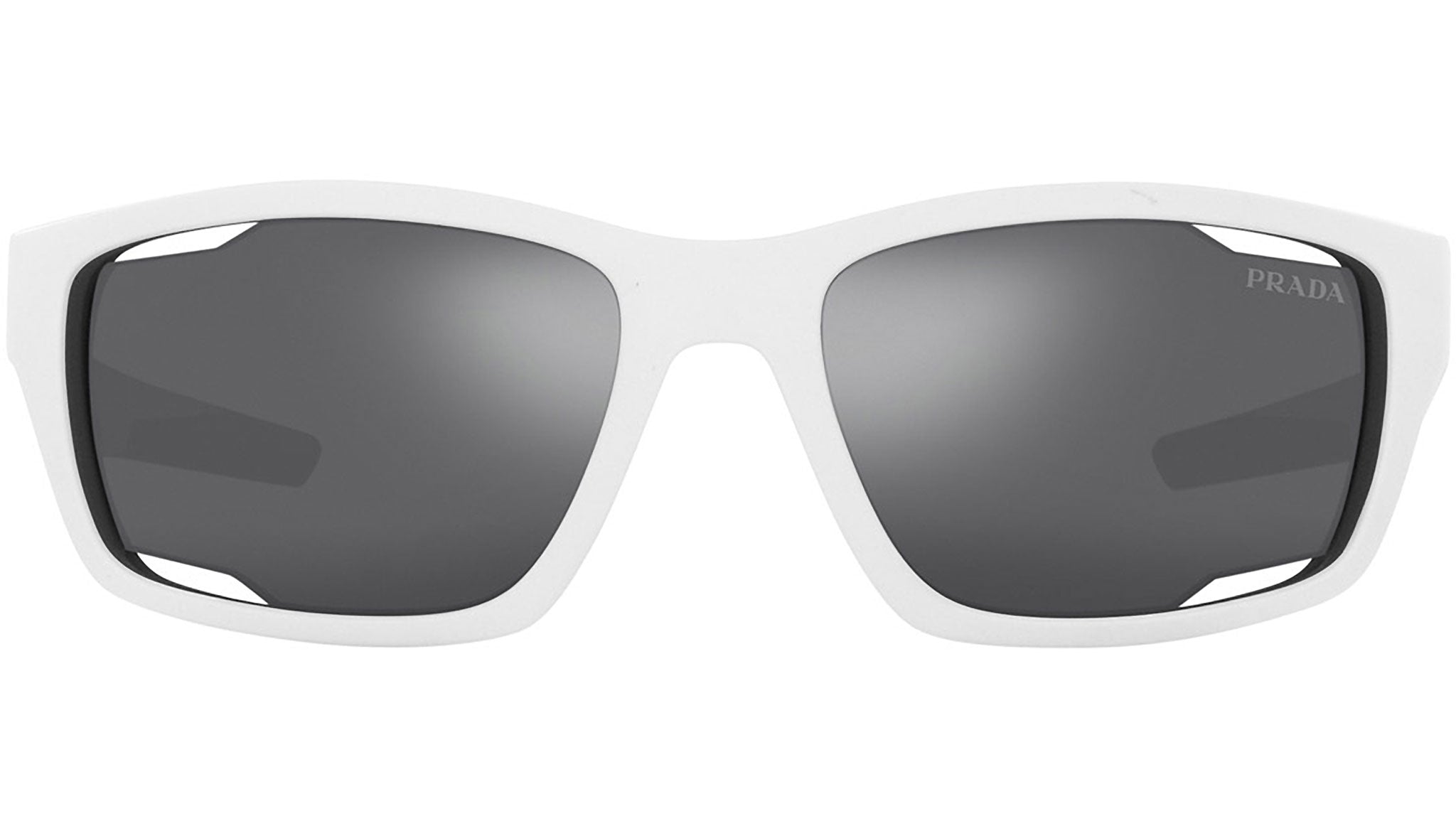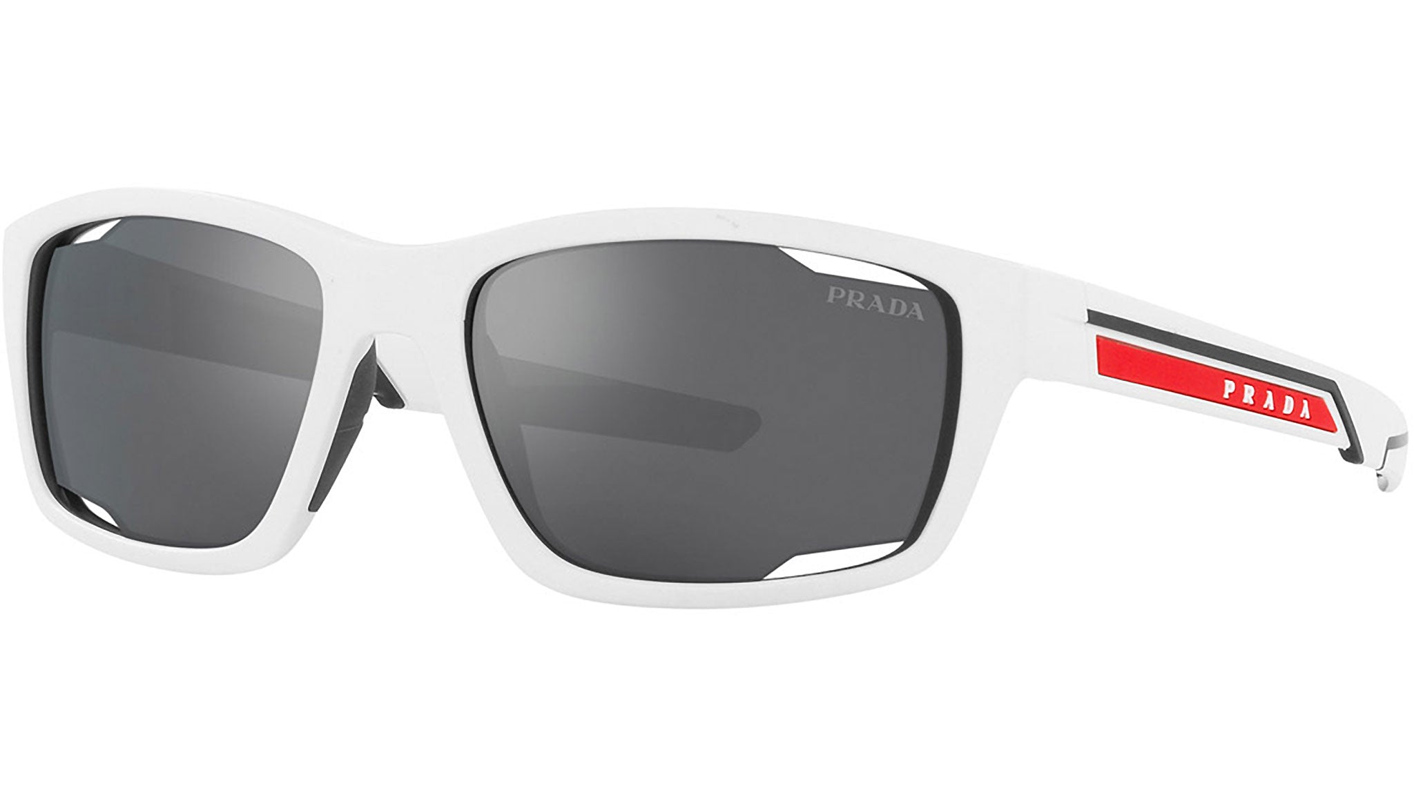 Prada Linea Rossa sunglasses model PS04YS in the color variant AAI07G matt white with black mirror gray lenses. A perfect fusion of the concepts of sportswear and contemporary elegance: the Prada Linea Rossa sunglasses line expresses all the quality and artisanal refinement of the Prada fashion house in a modern casual style.