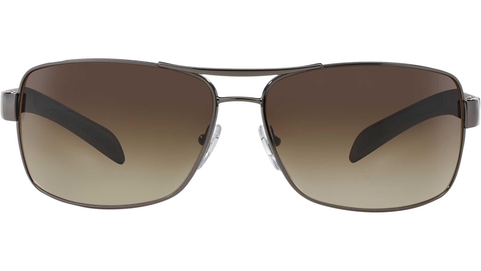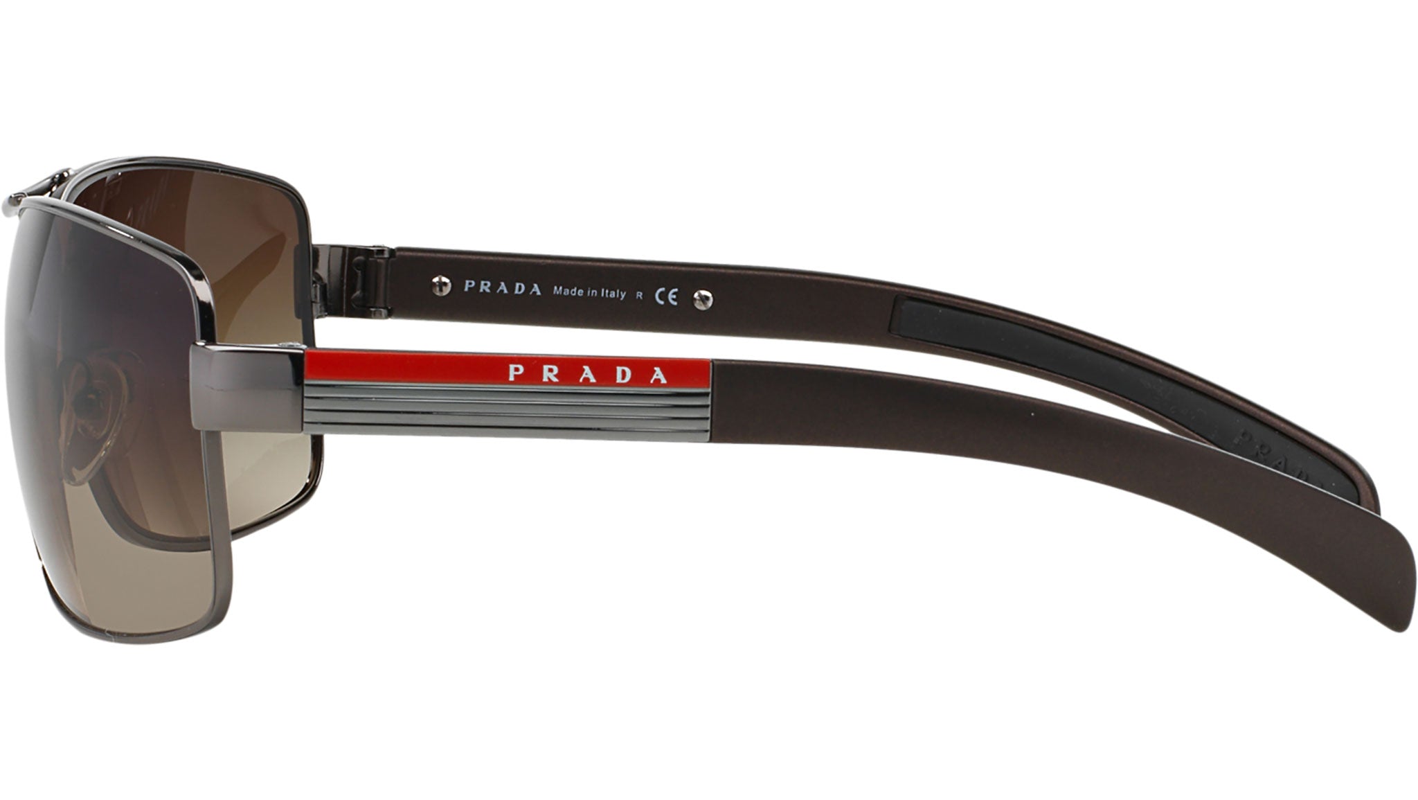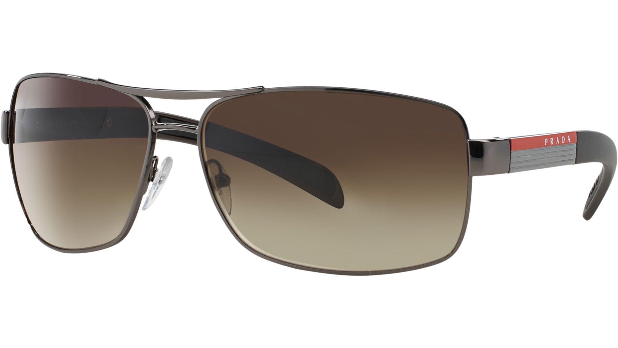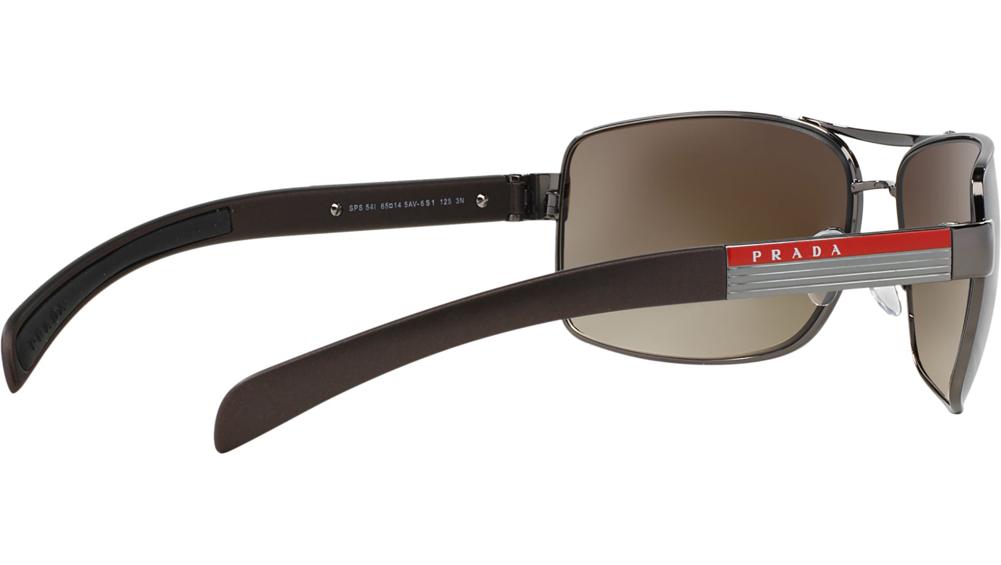 Prada Linea Rossa sunglasses model PS 54IS, gunmetal frame variant, color code 5AV6S1 with brown gradient lens. Prada Linea Rossa Sun Collection conveys an everyday casual style with all the quality and craftsmanship of the Prada brand.