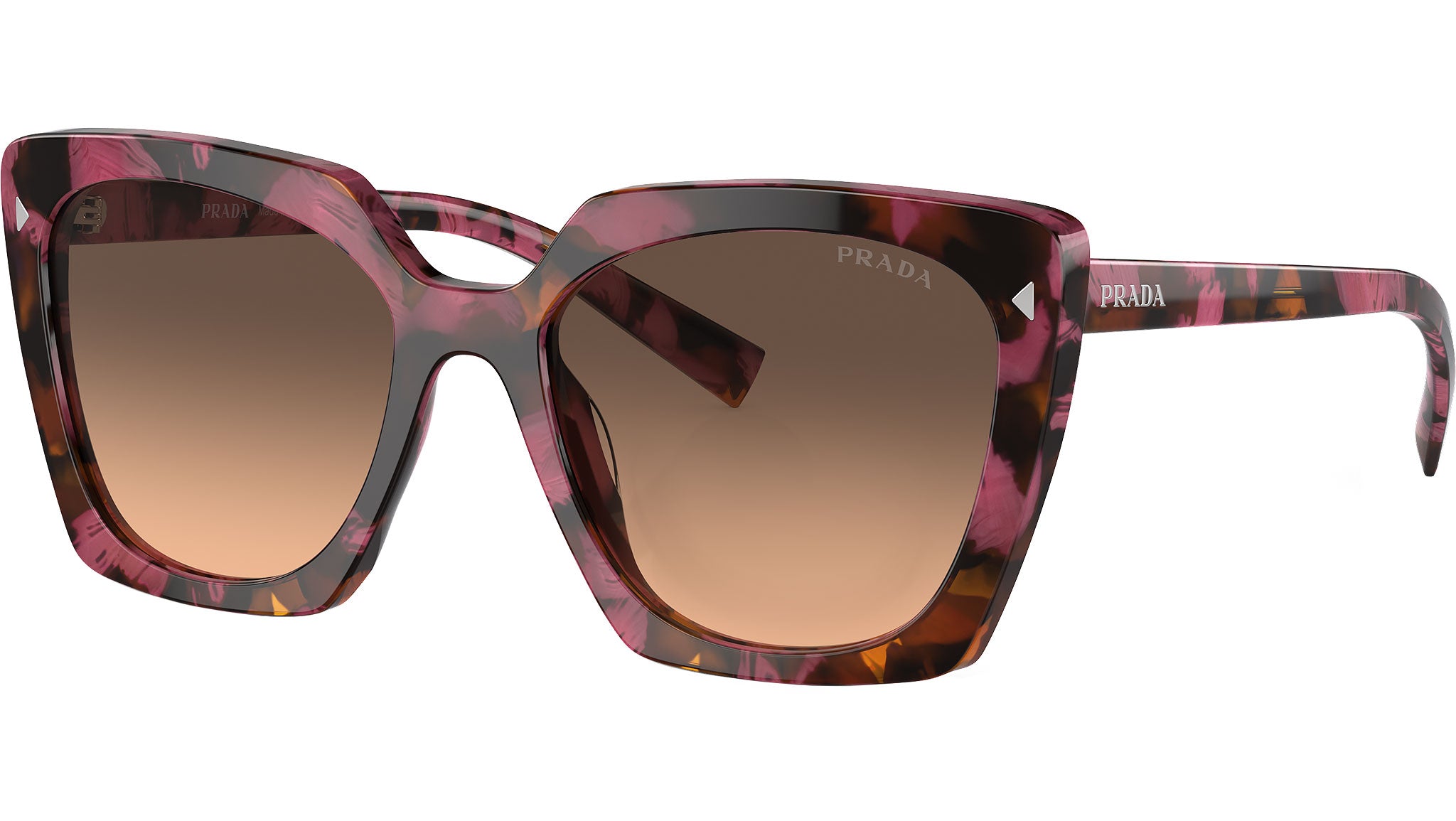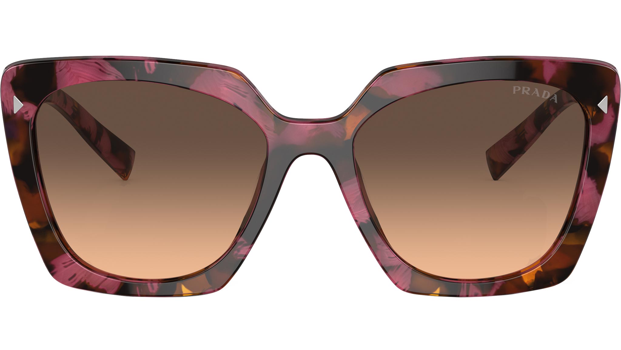 Prada women's sunglasses model 23ZS with tortoiseshell begonia cognac full rim frame in acetate and brown grey gradient lenses base 4. High bridge fit. Line: Signature. Brand code: PR23ZS. Color code: 18N50C. Authorized Prada dealer. Each Prada product is delivered with an original case and accessories and is covered by a 12-month manufacturer's warranty.