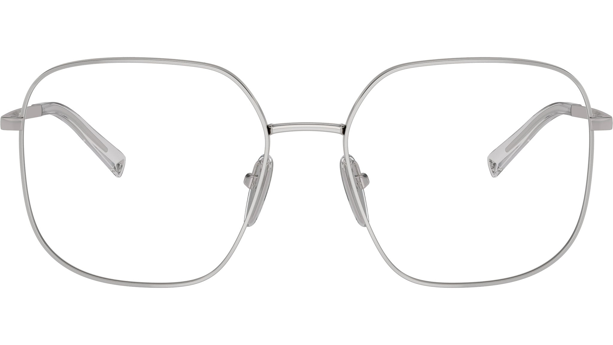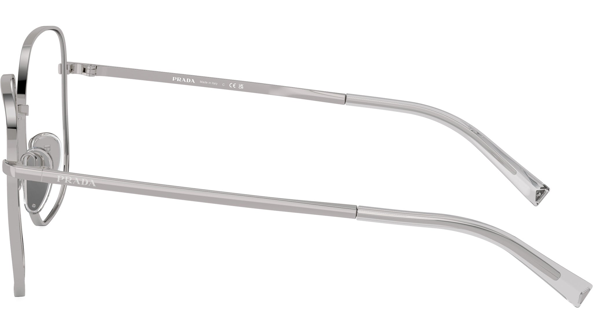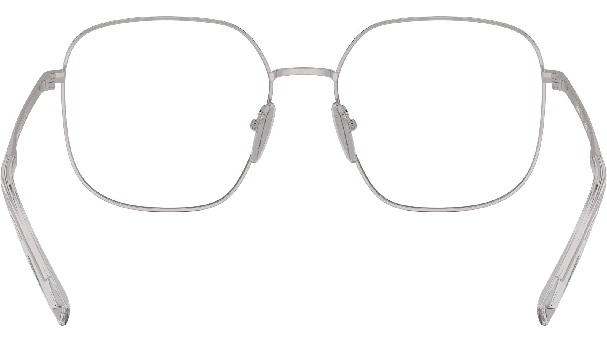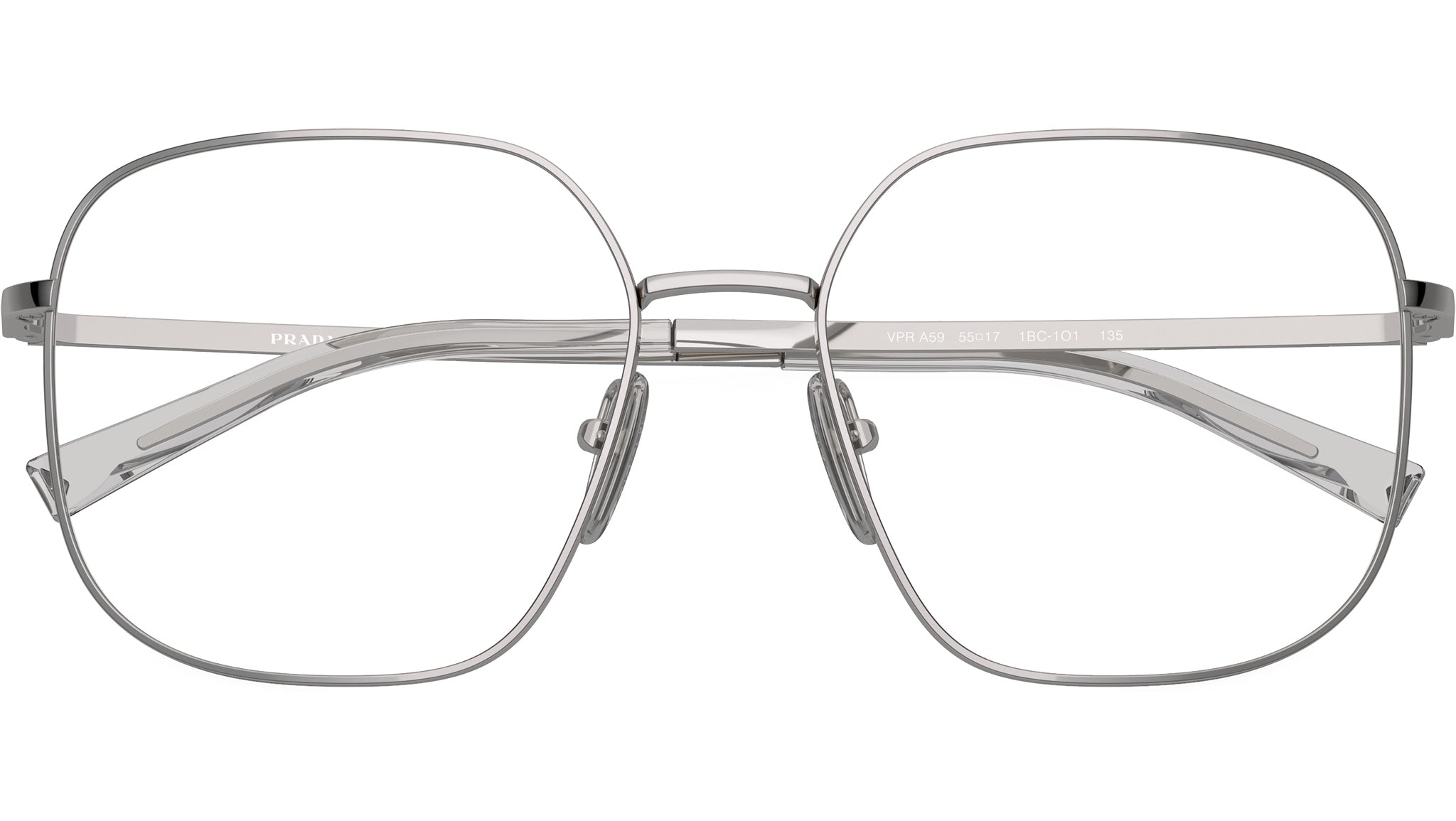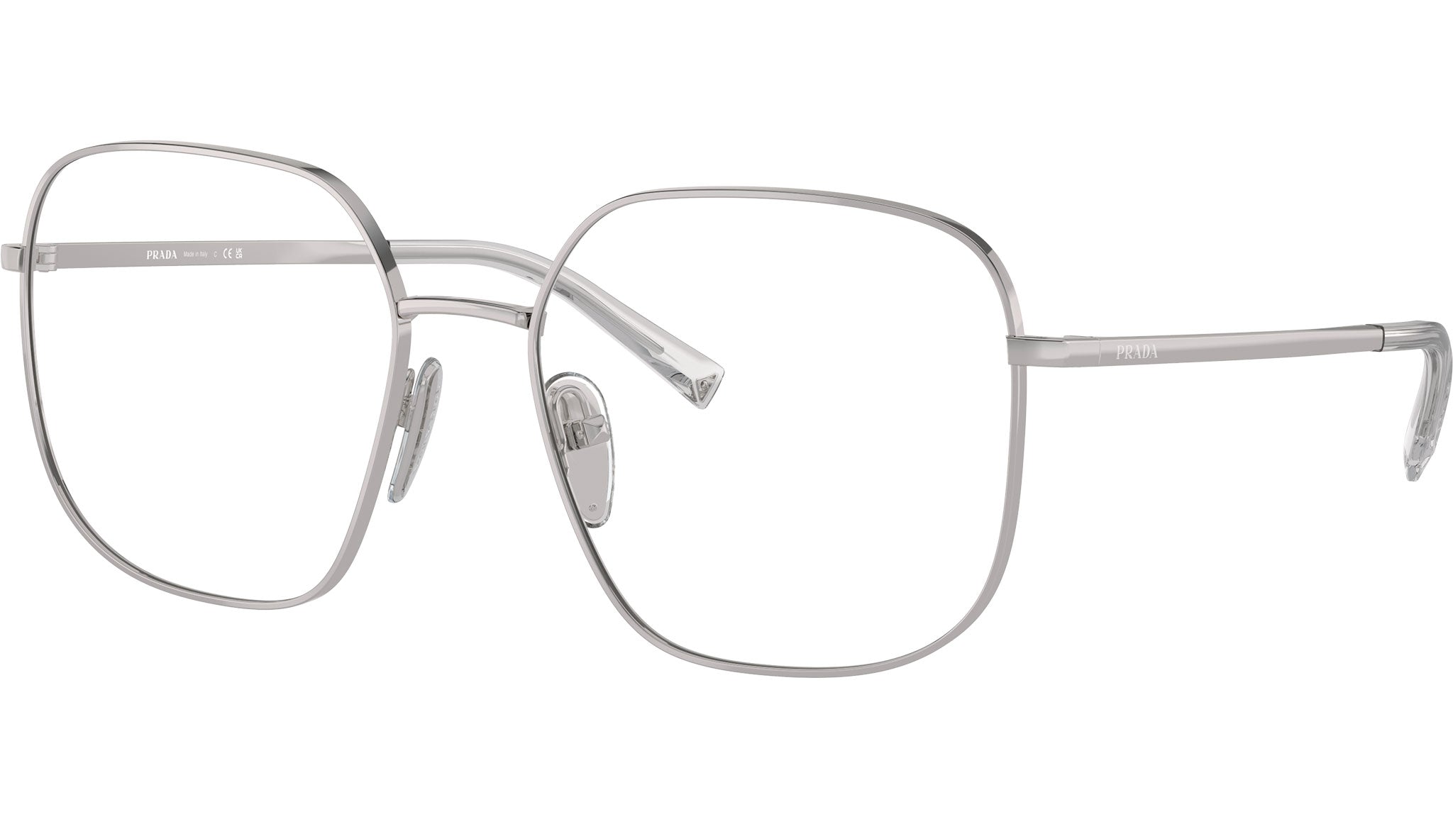 Occhiali da vista Prada donna modello A59V con montatura argento full rim in acciaio e lenti demo base 4. Fit con naselli regolabili. Linea: Signature. Brand code: PRA59V. Codice colore: 1BC1O1. Rivenditore autorizzato Prada. Ogni prodotto Prada viene consegnato con astuccio originale e accessori ed è coperto da garanzia del produttore di 12 mesi.