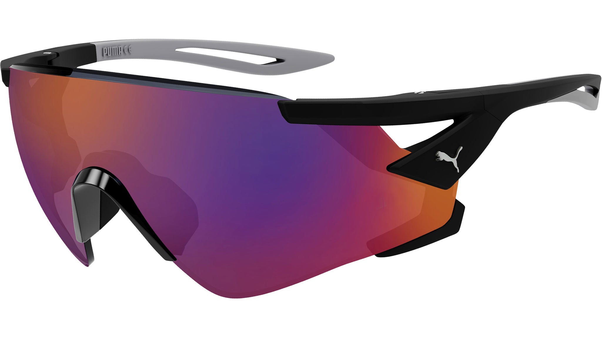 Puma Performance sunglasses model PU0398S color variant 002 matt black solid color with gray / fuchsia HD lenses with internal anti-fog treatment. Puma Eyewear embodies the ideals of performance and trend, innovation and fashion, sport and lifestyle, for those who see beyond conventions and challenge normality, to always be one step ahead. Eye-catching color-blocks in delicate and intense shades, define high-performance sunglasses. Ranging from masculine navigator designs to more feminine cat-eye silhouettes, all models are characterized by immediately recognizable details, such as the Formstrip motif and the Puma writing, which once again recalls the sporty spirit of the brand.