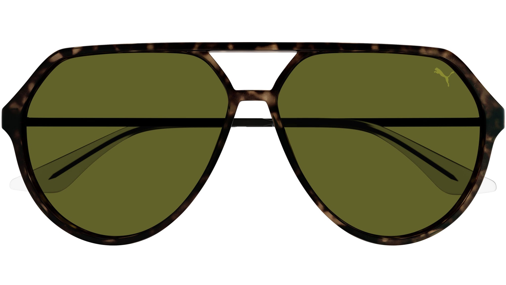 Puma Nostalgia sunglasses model PU0459S color variant 002 shiny dark tortoise with solid green lenses. Authorized Puma online dealer. The glasses are delivered with original case and accessories and are covered by the official 12-month manufacturer's warranty.