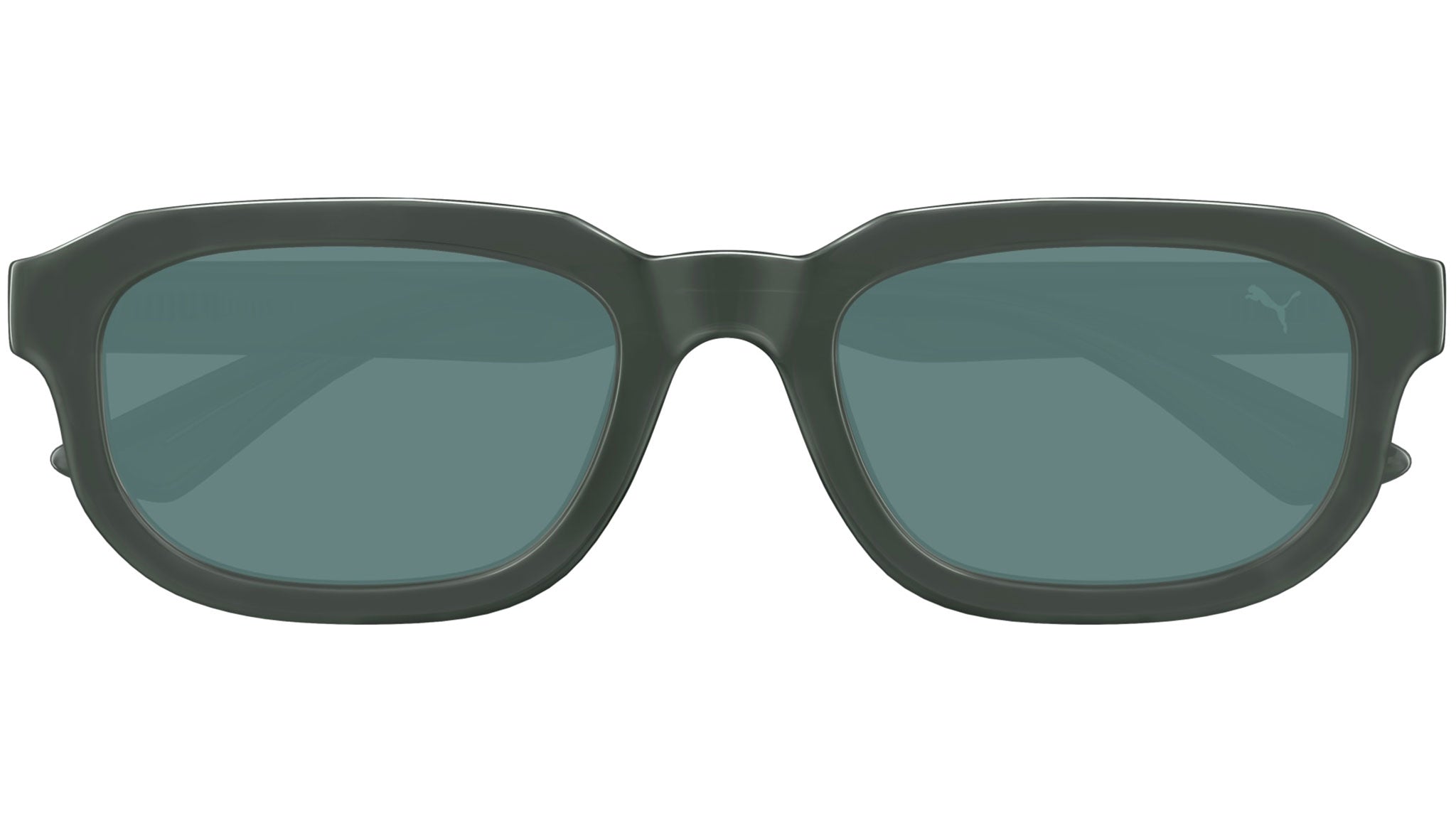 Puma Essential sunglasses model PU0463S color variant 004 dark gray transparent shiny with solid blue green lenses. Authorized Puma online dealer. The glasses are delivered with original case and accessories and are covered by the official 12-month manufacturer's warranty.